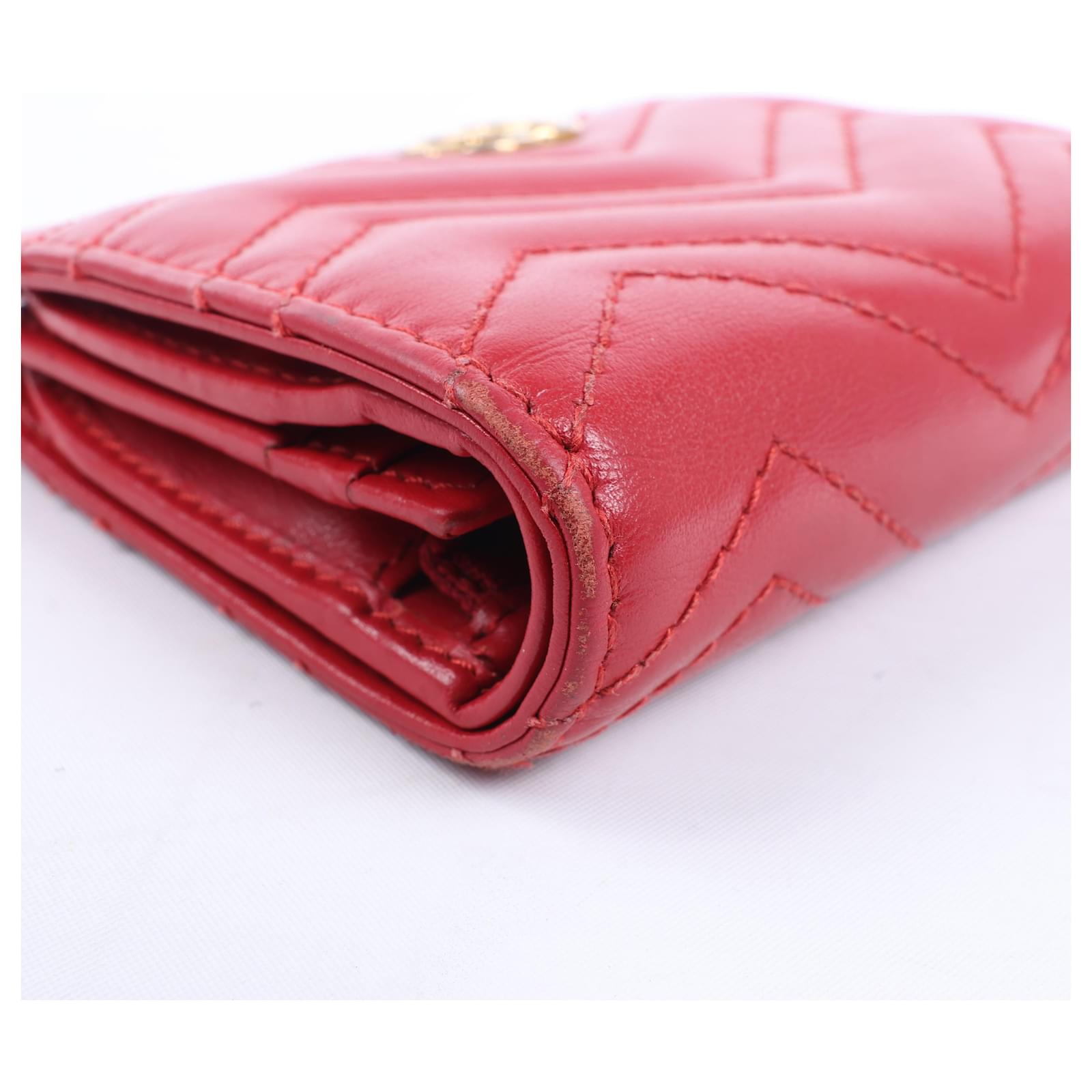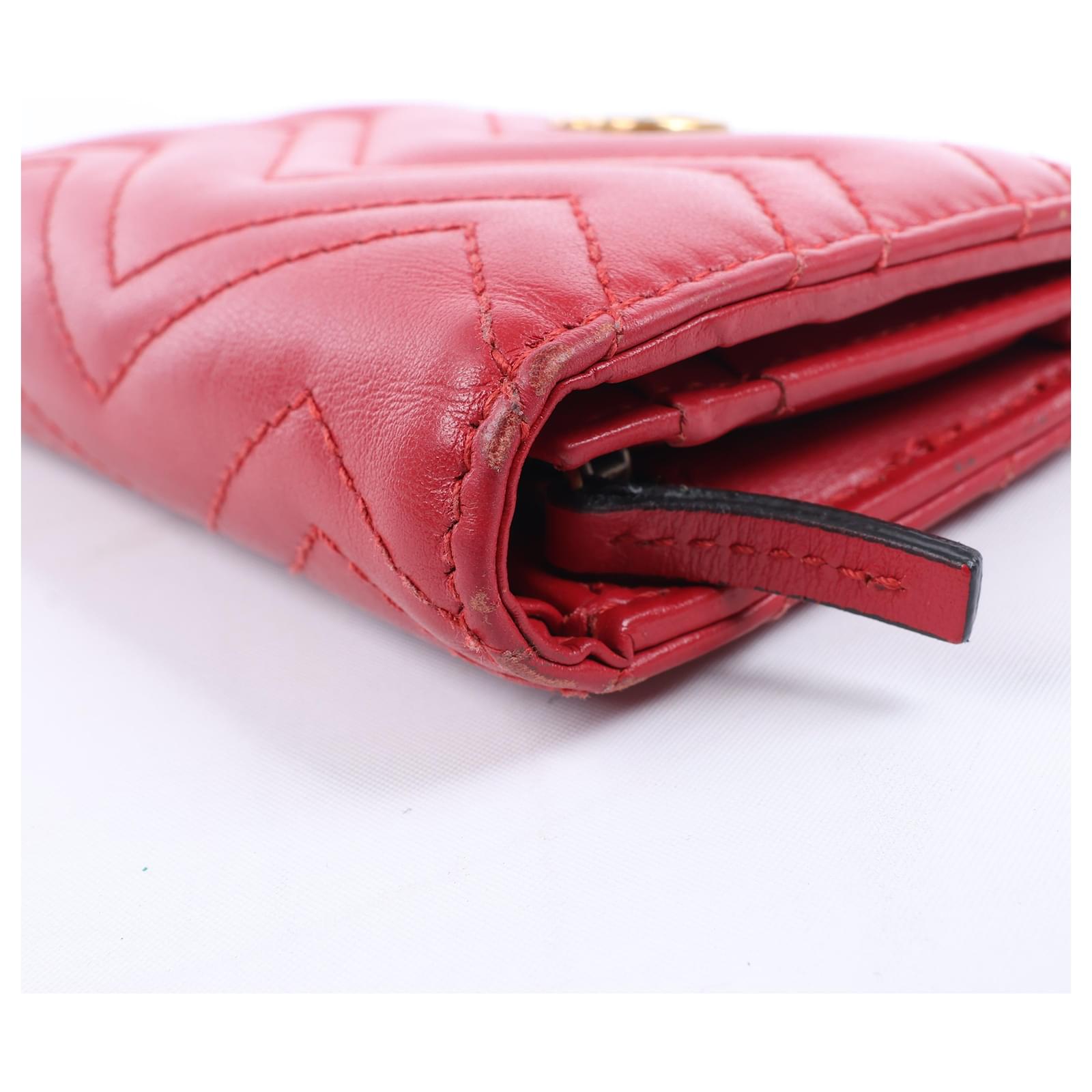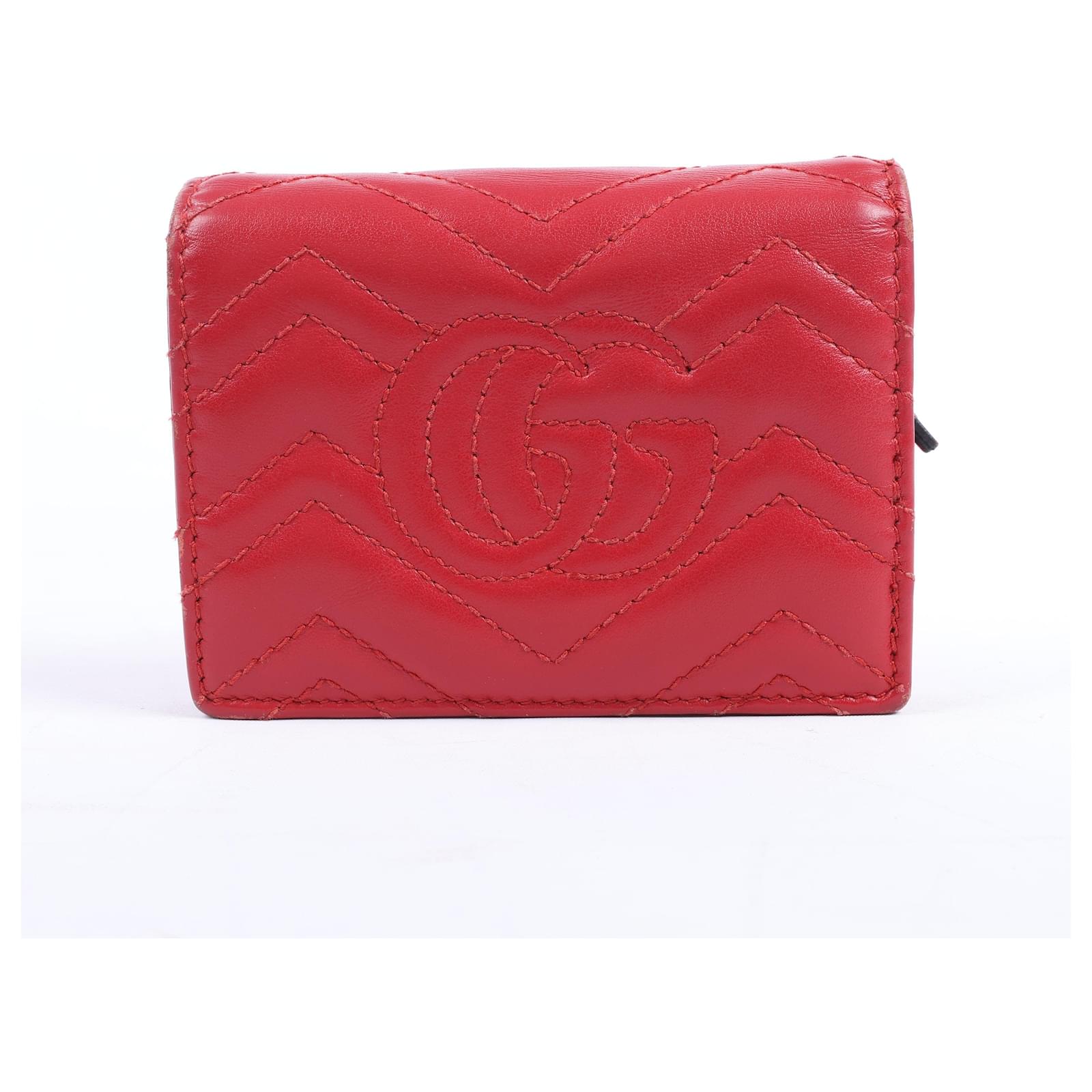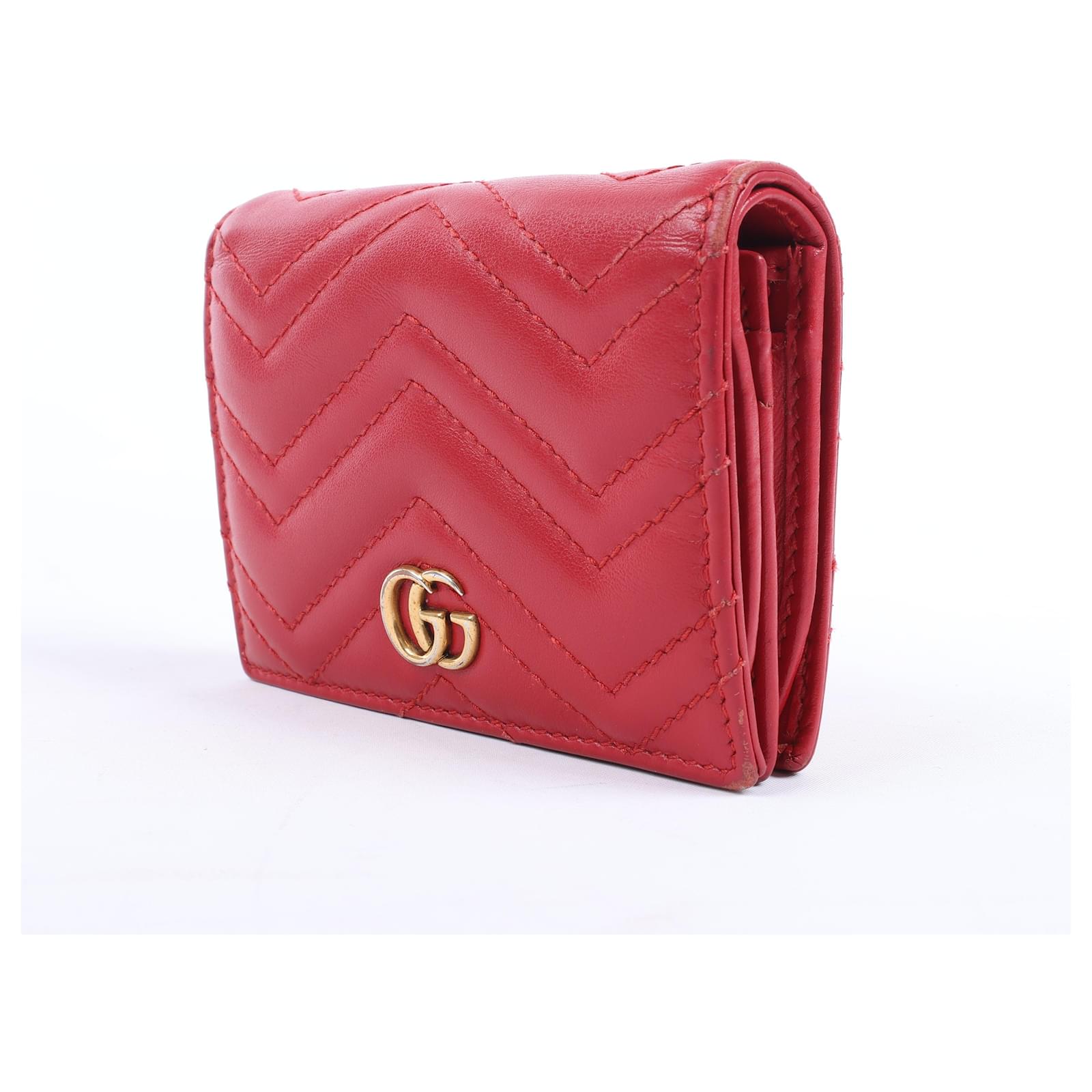 Chic and compact, this red Gucci GG Marmont wallet features soft quilted leather\nwith chevron stitching and gold-tone GG logo hardware. A bold yet elegant\naccessory perfect for everyday luxury.\nBrand: Gucci\nModel: GG Marmont\nWidth: 11 cm\nHeight: 8Â cm\nExterior Condition: Excellent\nInterior Condition: Excellent\nCondition Details: In great condition, but has rubbings on corners and scratches\non hardware.\nColour:Â Red\nInterior Colour: Red, Black\nHardware Colour: Gold\nMaterial: Leather\nComes With: –