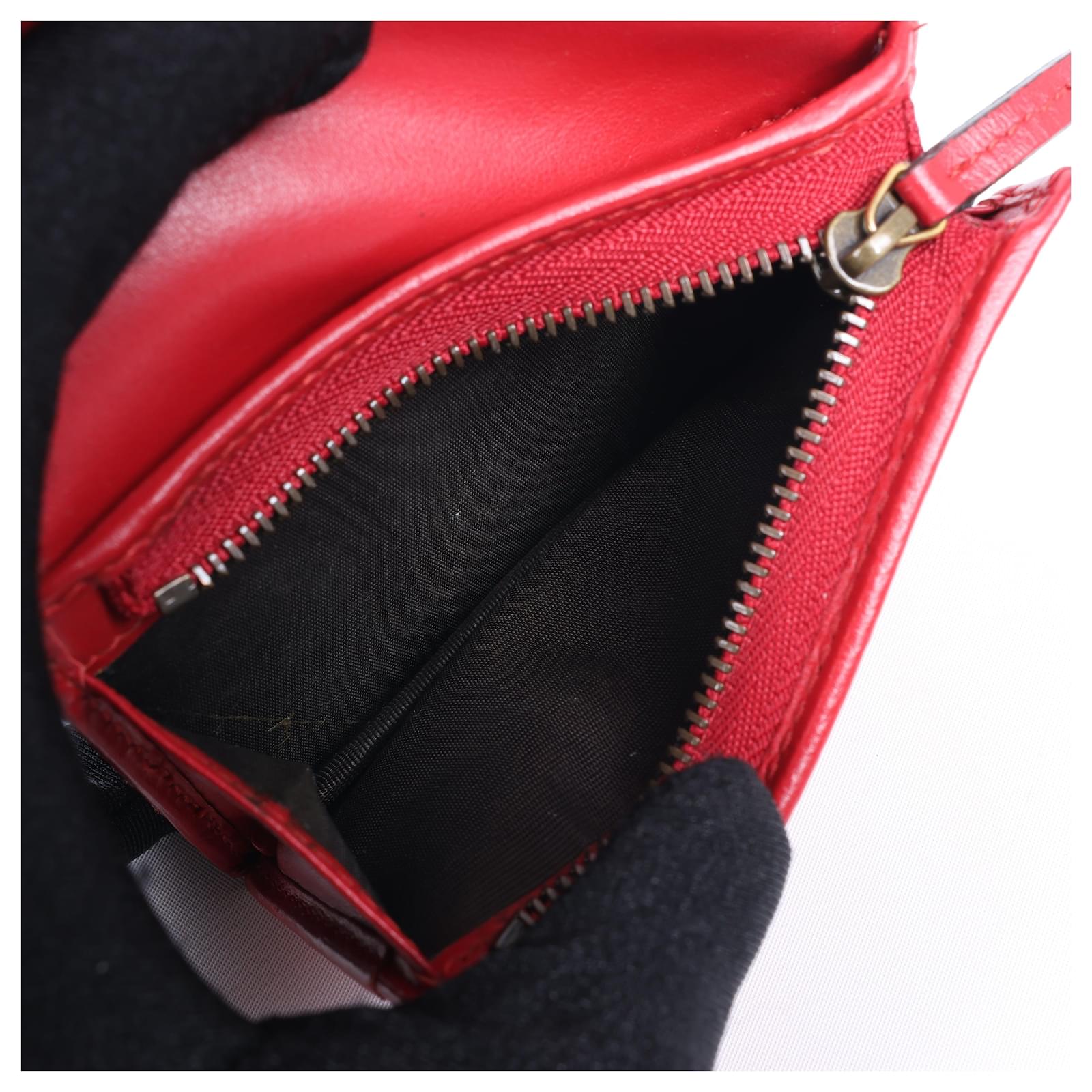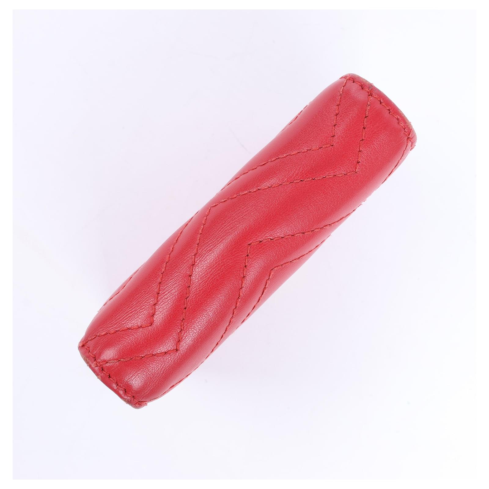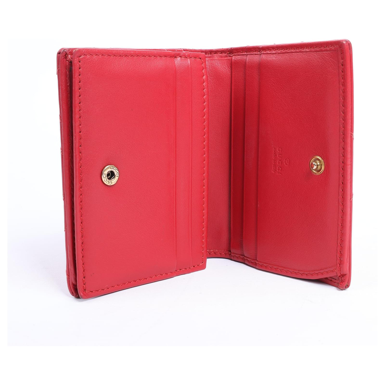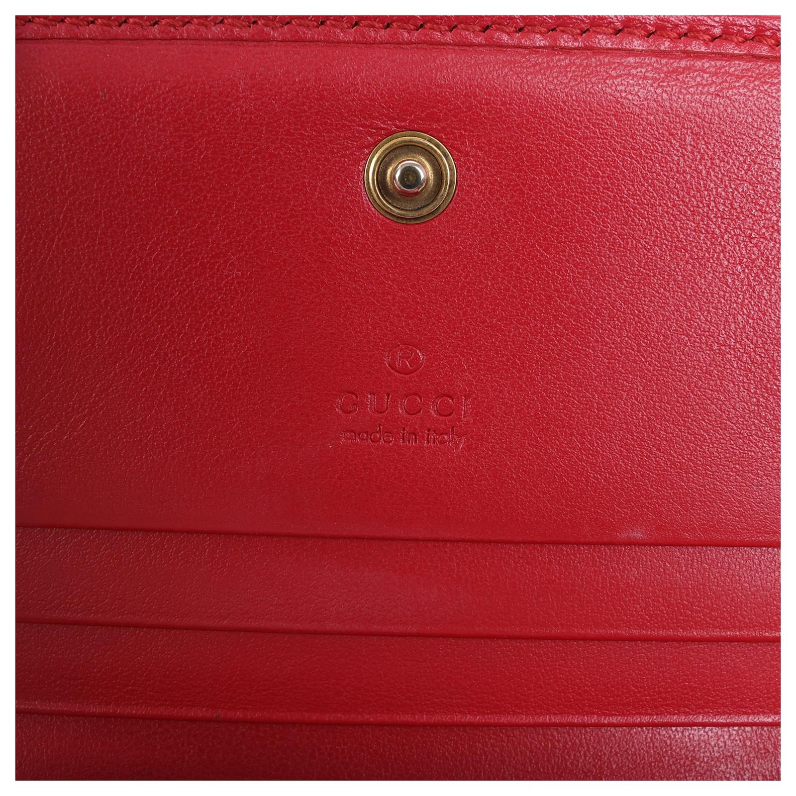 Chic and compact, this red Gucci GG Marmont wallet features soft quilted leather\nwith chevron stitching and gold-tone GG logo hardware. A bold yet elegant\naccessory perfect for everyday luxury.\nBrand: Gucci\nModel: GG Marmont\nWidth: 11 cm\nHeight: 8Â cm\nExterior Condition: Excellent\nInterior Condition: Excellent\nCondition Details: In great condition, but has rubbings on corners and scratches\non hardware.\nColour:Â Red\nInterior Colour: Red, Black\nHardware Colour: Gold\nMaterial: Leather\nComes With: –