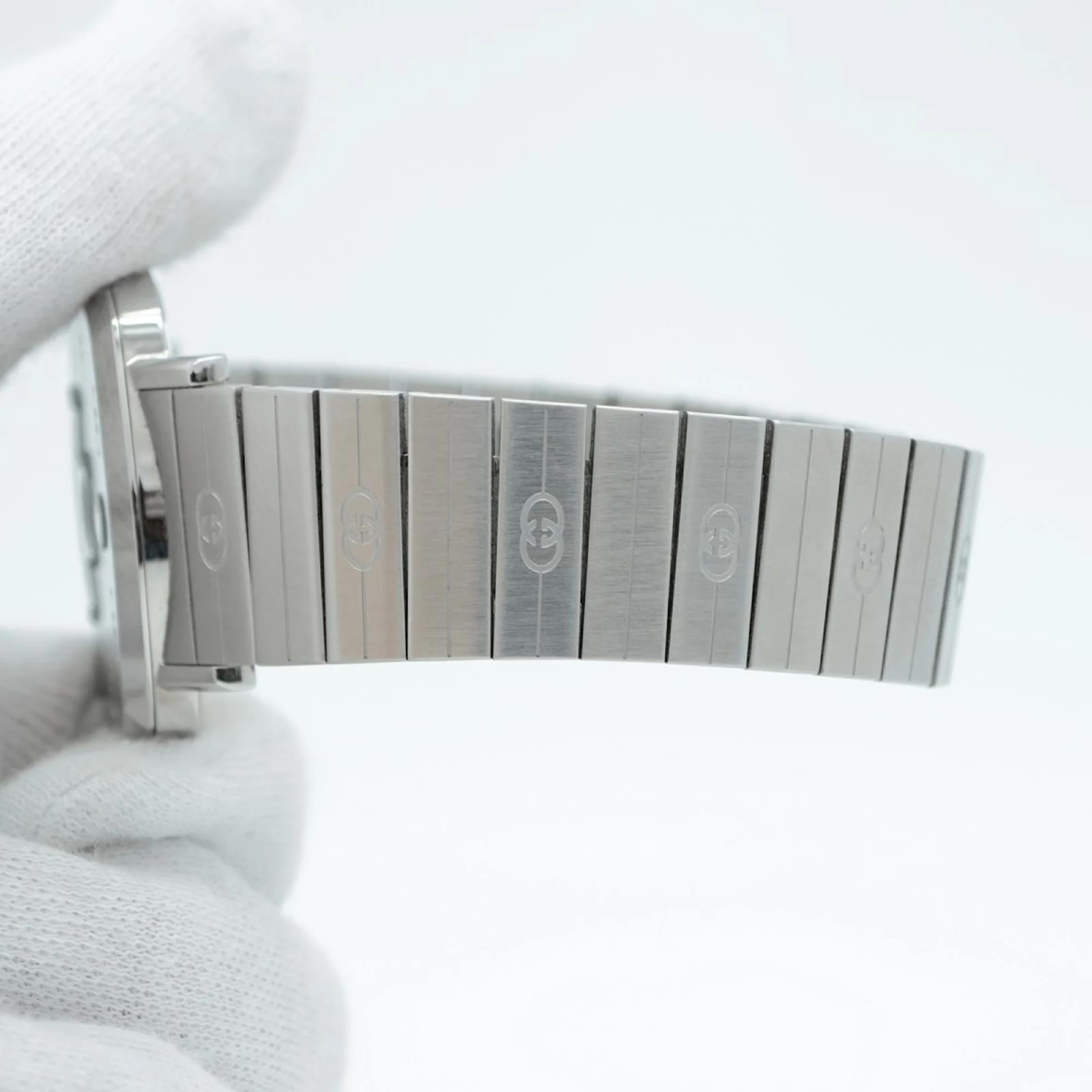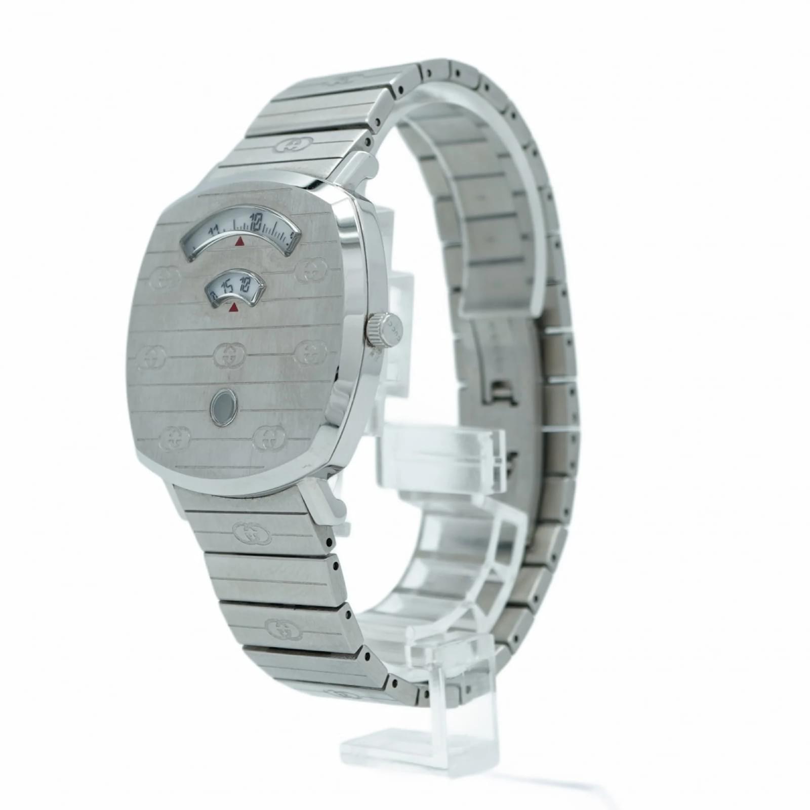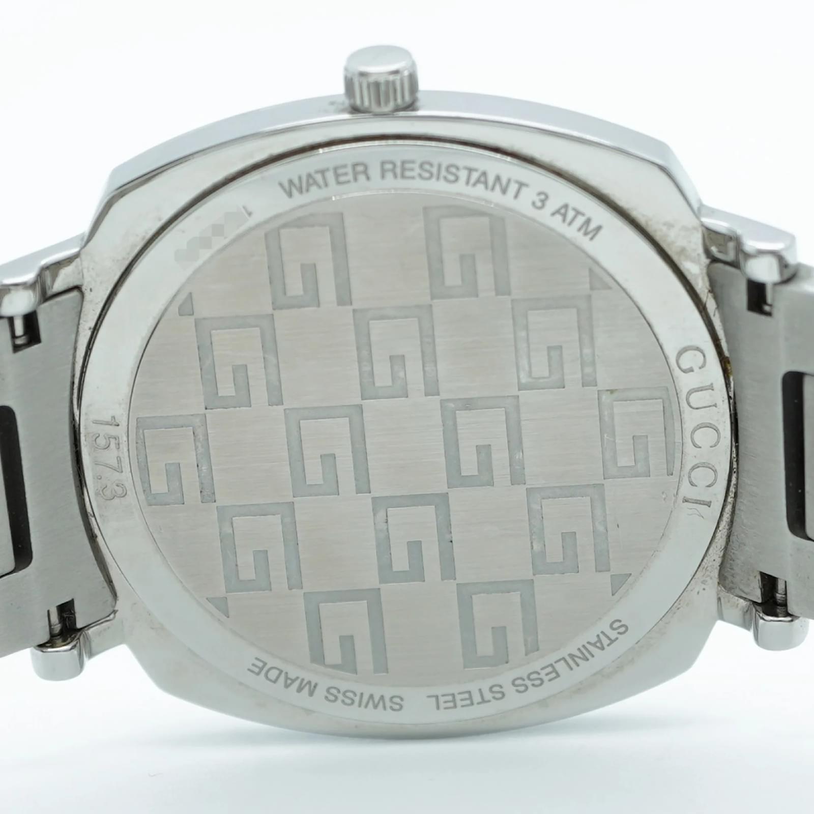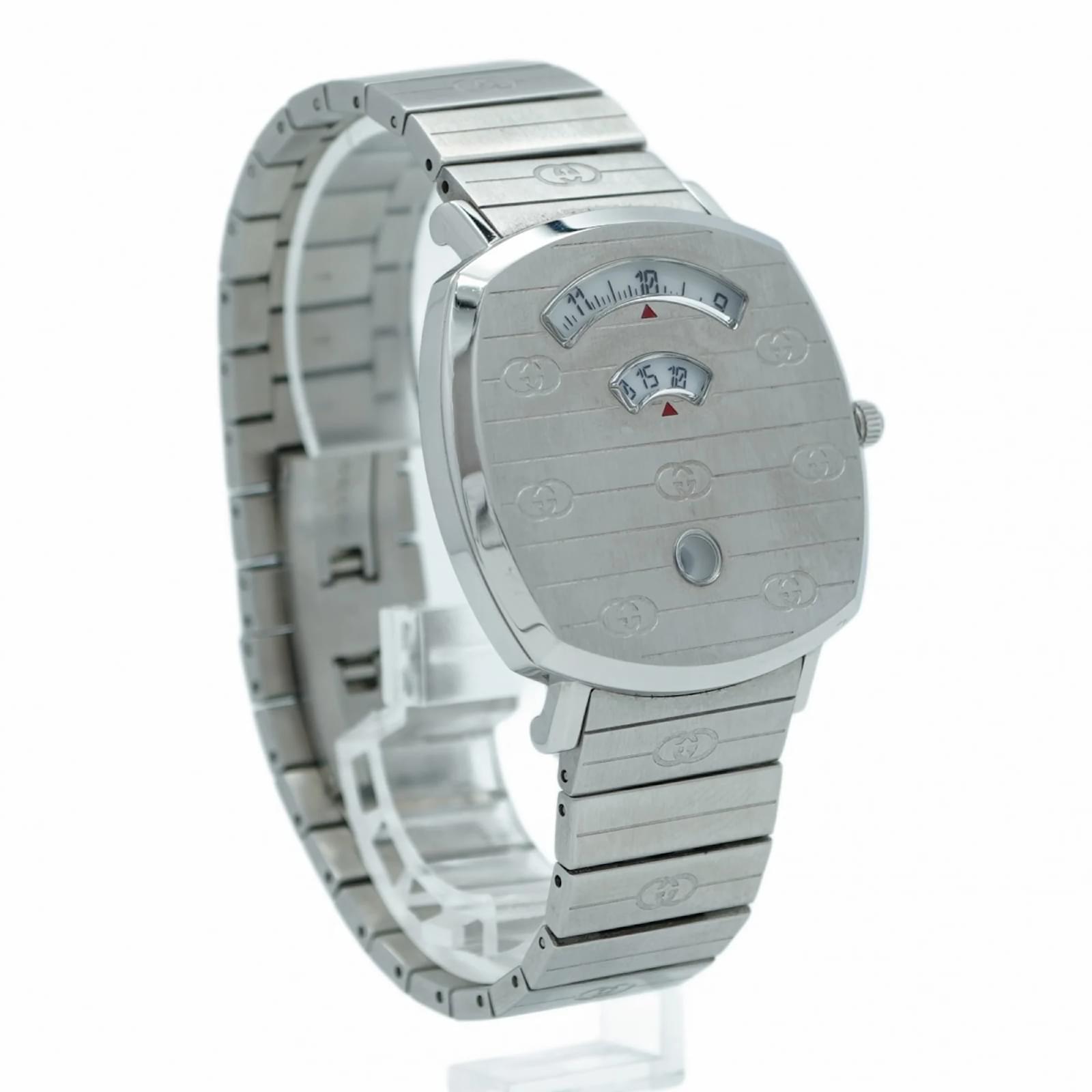 The Gucci Grip Watch 157.3 features a white dial and is designed for men. It is crafted with a stainless steel band and operates on a quartz movement. The watch has a case diameter of 38mm and is suitable for a wrist size of 19cm (7.48 inches). \n\nThis pre-owned timepiece is in good condition, showing slight signs of wear including minor scratches on the bezel, case back, dial, glass, and crown. The band also exhibits slight stains and dirt. It is important to review the provided images for a detailed view of the watch’s condition before purchasing. No additional accessories are included with this item.