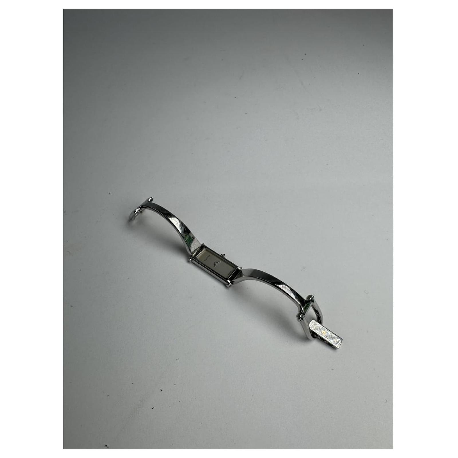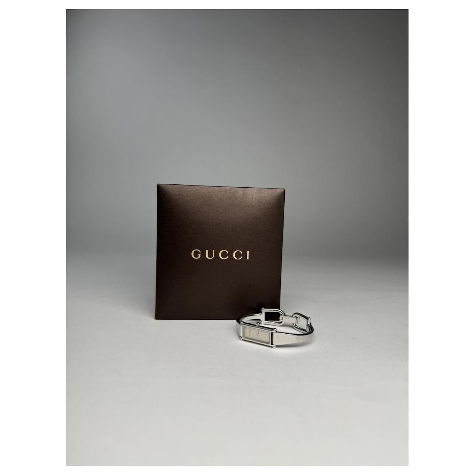 GUCCI Vintage Watch – Horsebit\nThis vintage Gucci \”Horsebit\” watch is crafted from silver-tone stainless steel,\nembodying a sleek and timeless design. The watch is Swiss Made and features a\nrefined white dial with silver hands. The case measures 3 cm in height and 1 cm\nin width, with a total diameter of 6 cm. Despite minor scratches, the overall\ncondition remains very good. The watch comes with its original Gucci watch box.\nSerial number: 11403589.\nModel: Horsebit\nGender: women\nVC Condition: Very good condition\nVC Category: accessories\nVC Subcategory: watches