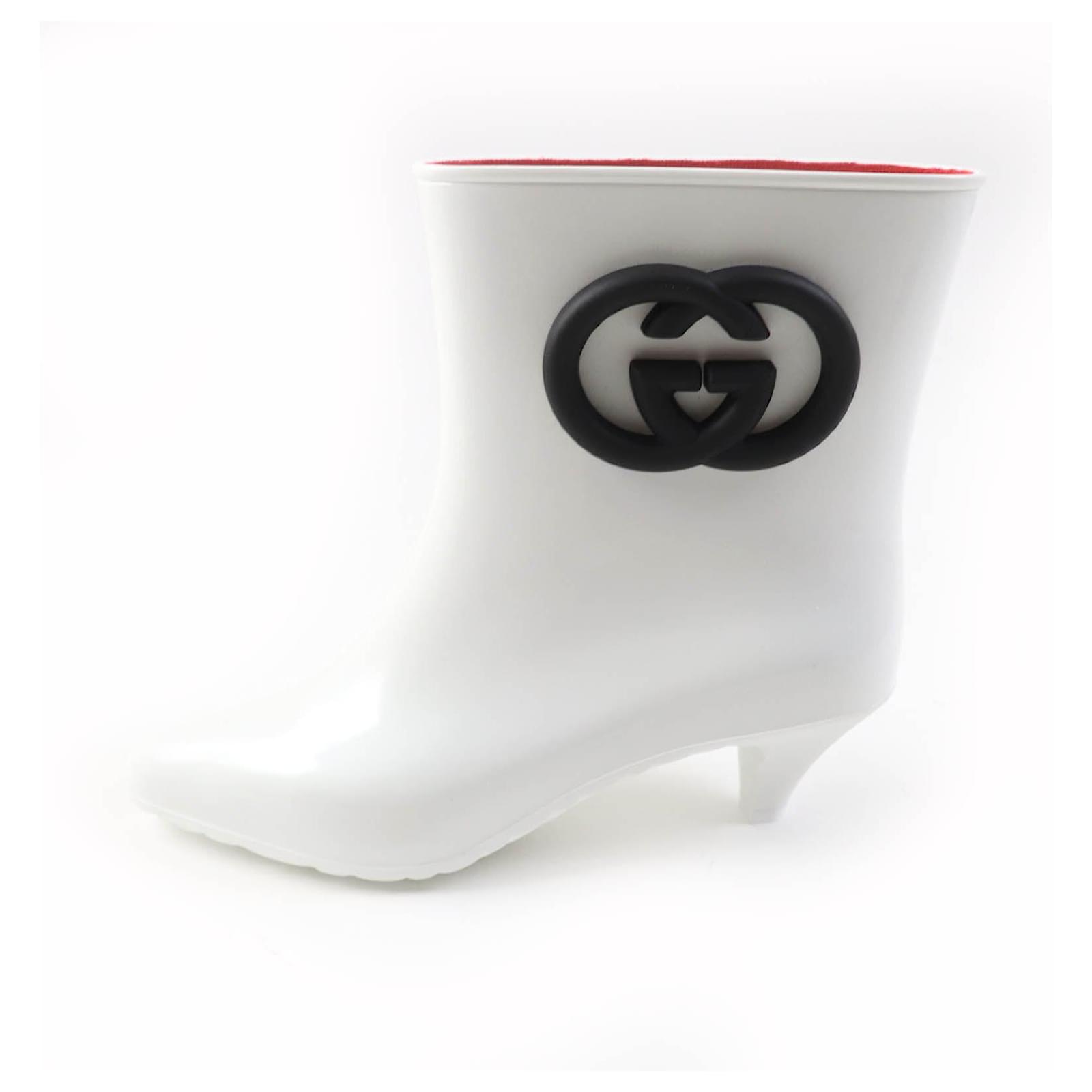– General information – Brand : Gucci Item name : Gucci Interlocking G Rubber Rain Boots Women Model number : 724458 – Design – Type : Shoes Material : Plastic Color : White Gender : Female – Size – Size : Shaft height : 22 Opening circumference : 35 Instep width : 8.5 Heel : 5 Shoe size(JP) : 39 Color : White Black Material : Rubber – Inventory – Serial Number : null SKU : 120250000673200A0025478728 – Included Items – Accessories : null *Before purchasing, please refer to the images of the accessories included with the item. – Condition – Condition : Pristine Condition Rank : Used A Unused. Storefront display. Condition Notice : Before purchasing, please refer to the images for the exact condition of the item.