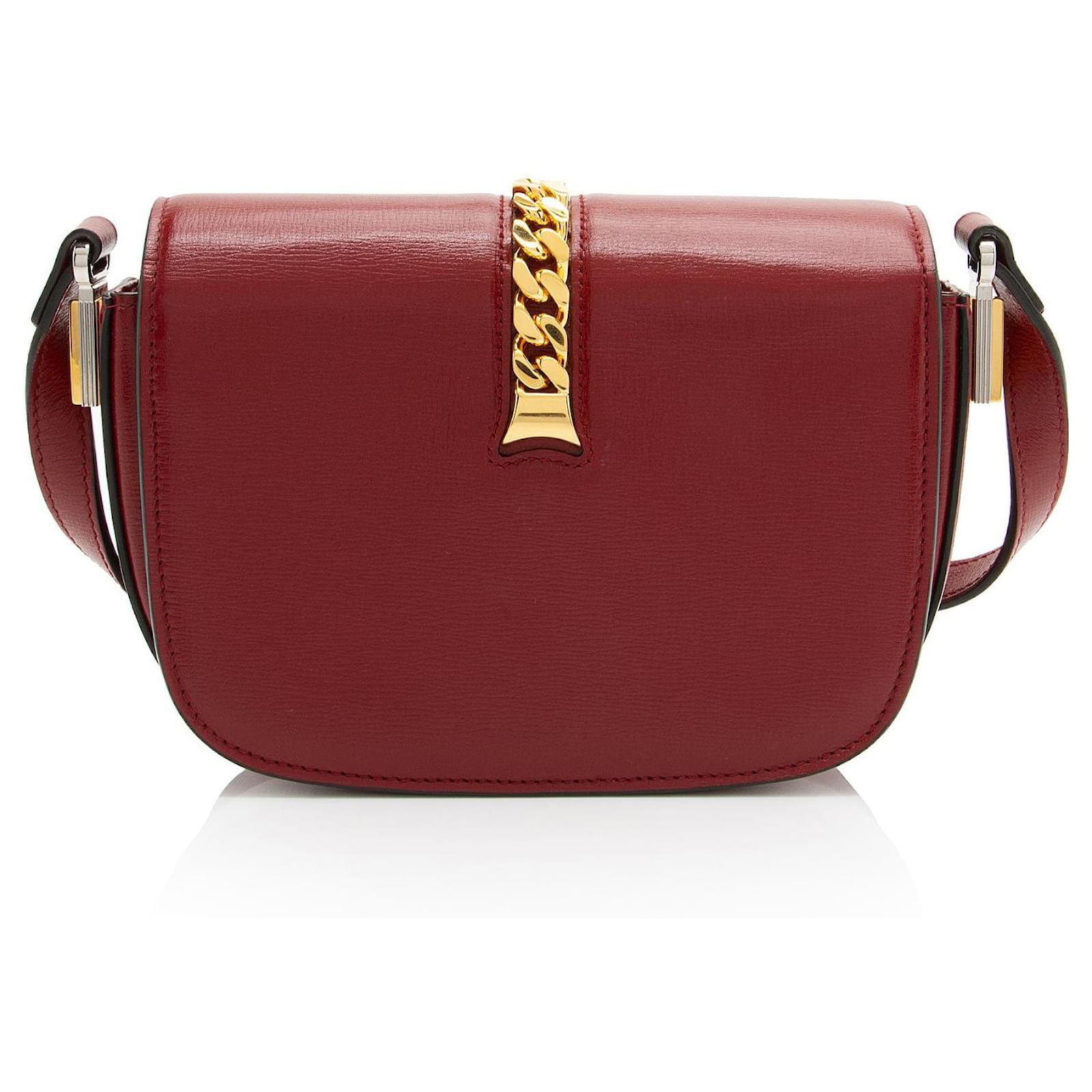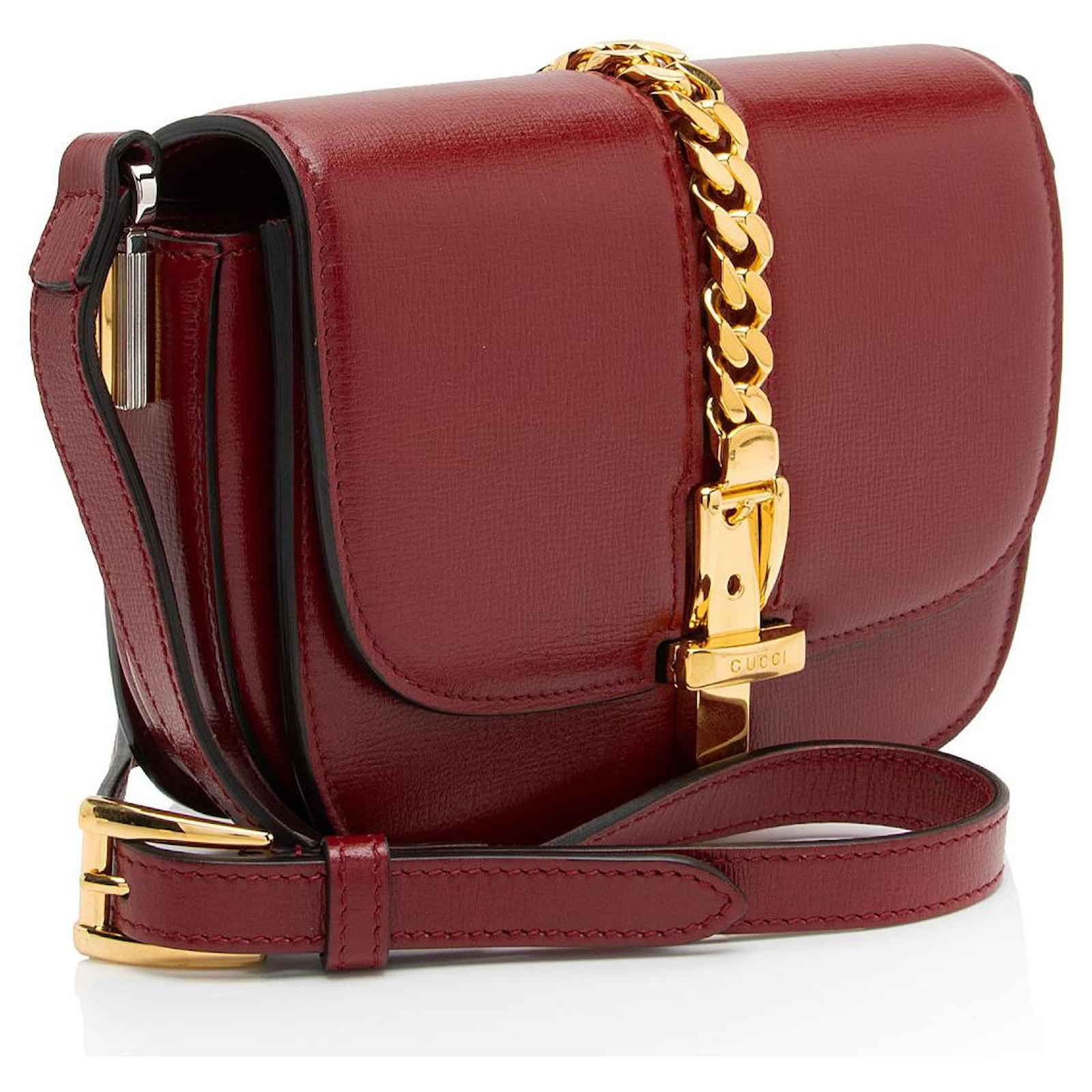 The Italian fashion house of Gucci continues to reinterpret its rich heritage under current Creative Director Alessandro Michele (2015). Maintaining a balance between historical reference and contemporary eclectic flare, the brand’s signature “double g” remains iconic. Gucci has been recognized as a worldwide leader in the luxury goods market for 90 years.Condition Notes: Light scuffs throughout exterior. Creases to shoulder strap. Surface scratches to hardware. Wear to interior flap.Width (at base): 6\”Height: 5\”Depth: 2\”Shoulder Strap Drop: 21\”, AdjustableType of Material: LeatherColor: RedLining: Grey LeatherPockets: NoneHardware: Silver Tone, Gold ToneClosure: Turn LockOrigin: Italy Measurments: width: 152 mm height: 127 mm handle drop: 533.4 mm \n Product Id: 511246 \n