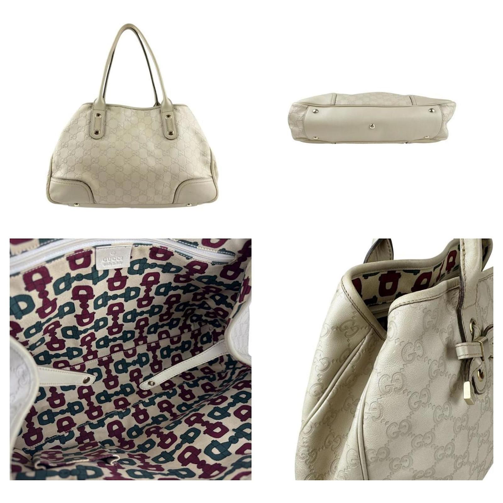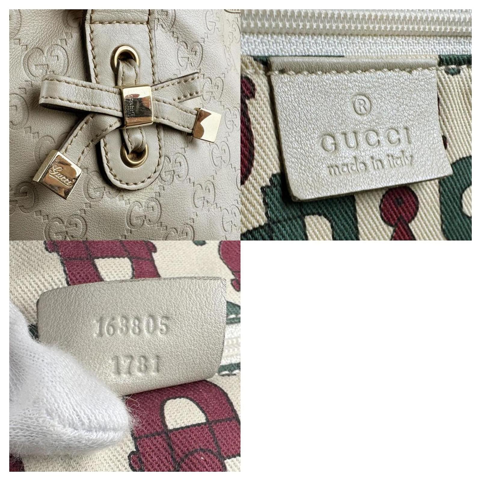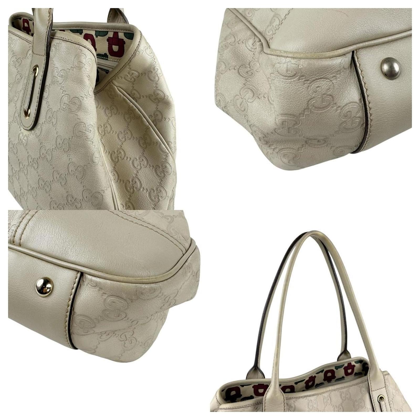 This Gucci shoulder bag is crafted from light beige leather and features an open closure. It includes a zipper pocket and an open pocket inside for organization. The bag measures 23cm in height, 34cm in width, and 10cm in depth, with a strap length of 50cm. \n\nOriginating from Italy, this model (163805) is classified as used but remains in good condition, showing moderate traces of use, including some scratches and dirt. Notable imperfections include scuffs, a pen mark on the exterior, a crack in the strap, and scratches on the hardware. Potential buyers are encouraged to review the provided images for a detailed view of the item’s condition. \n\nNo additional accessories are included with this bag.