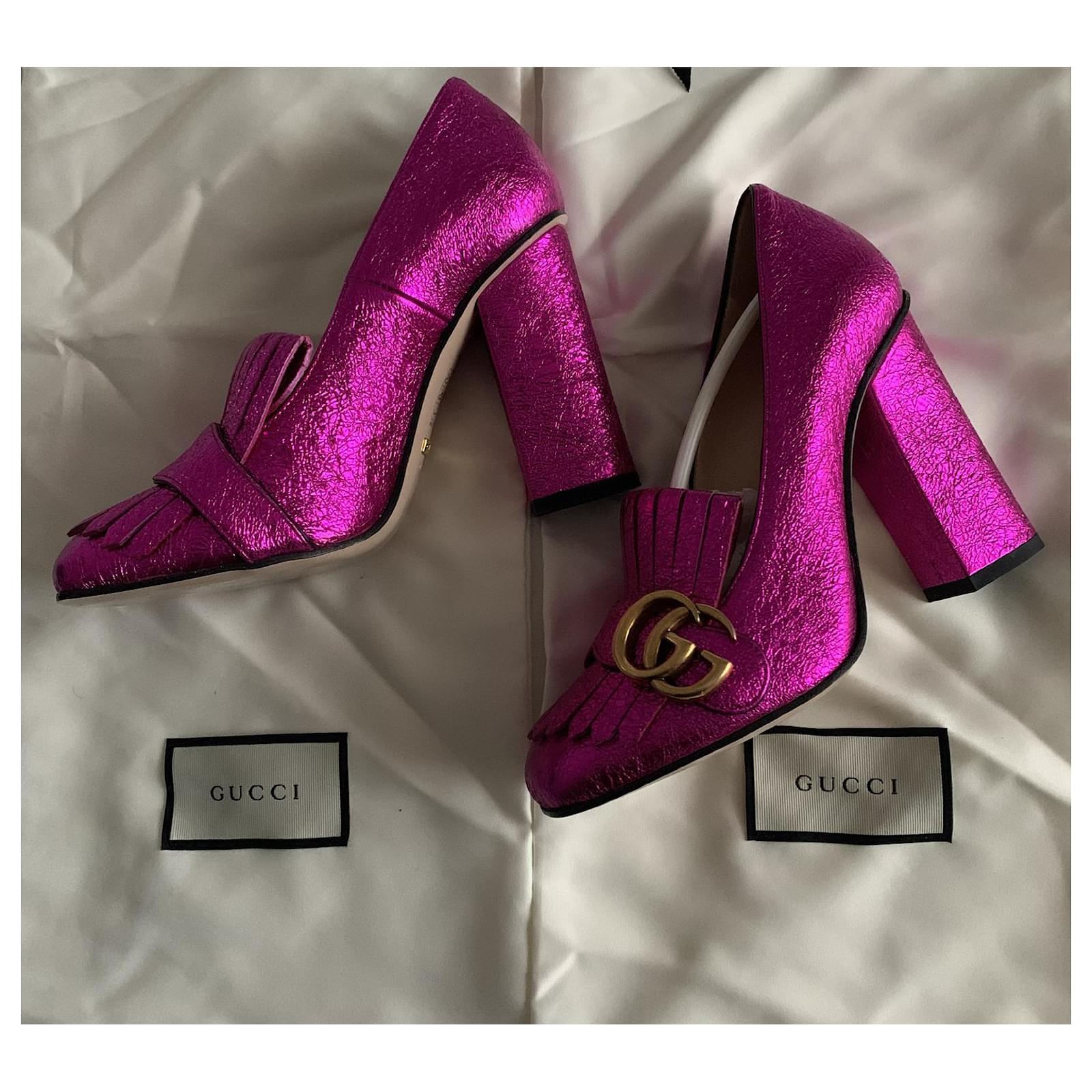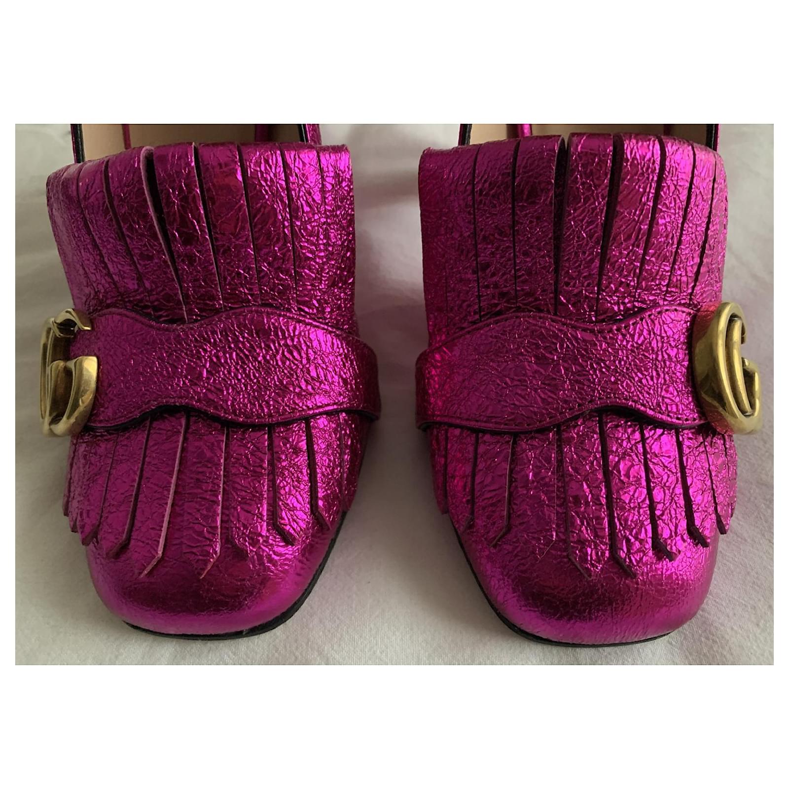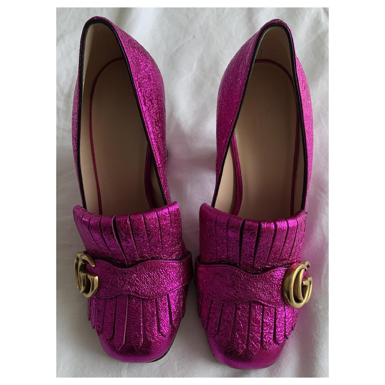Pretty pair of metallic Fuchsia pumps, with square heels, Marmont model.\r\nIconic model from the Gucci house.\r\nPointure : 36.\r\nHeel height : 10 cm;\r\nDelivered in their original box with its 2 dustbags.\r\nTrès bon état.