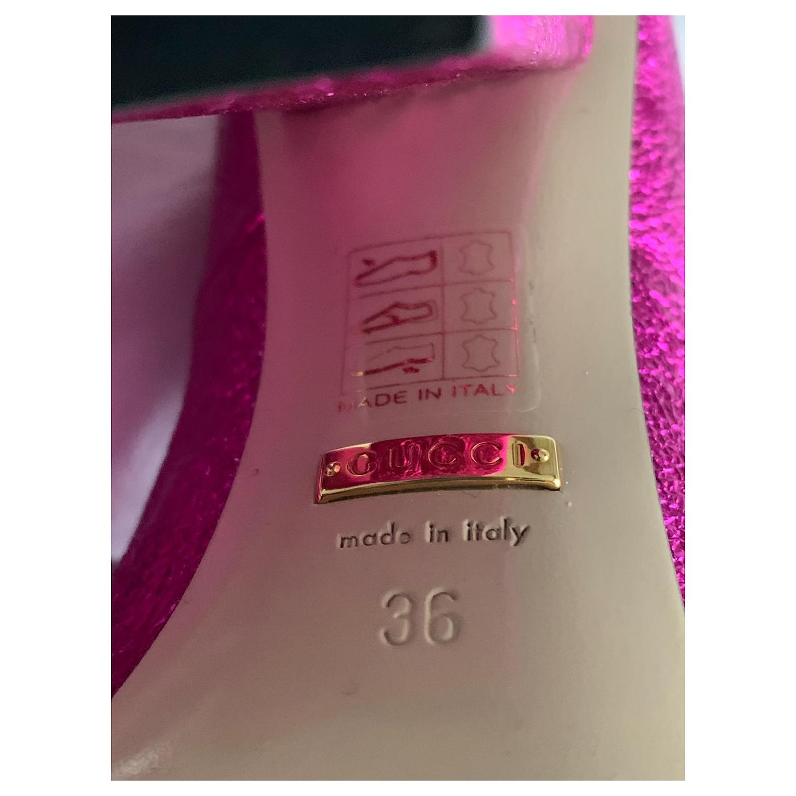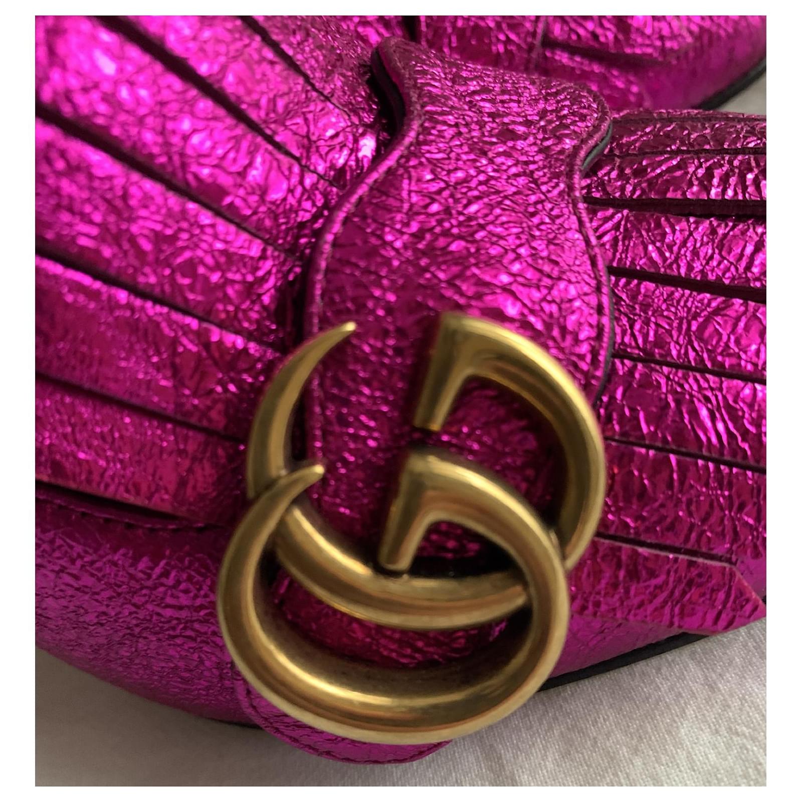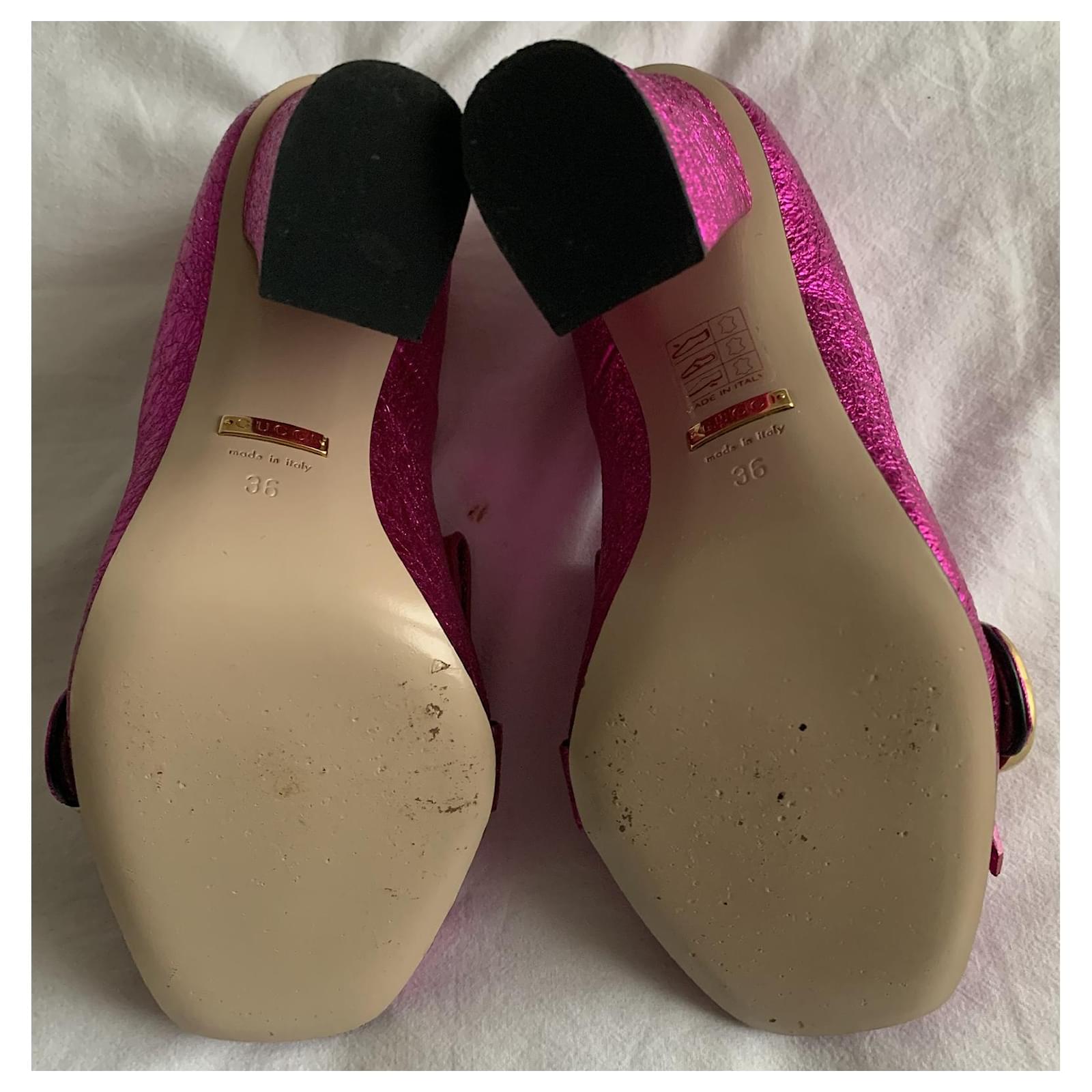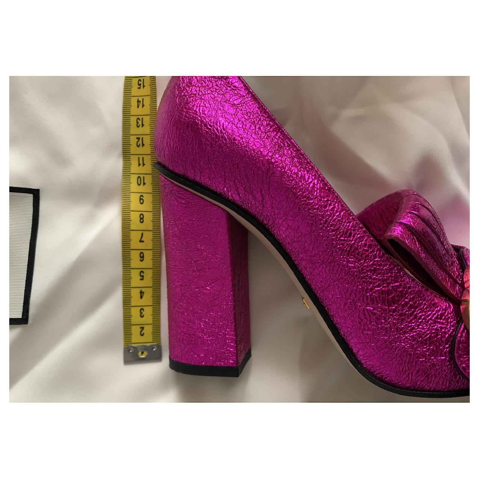 Pretty pair of metallic Fuchsia pumps, with square heels, Marmont model.\r\nIconic model from the Gucci house.\r\nPointure : 36.\r\nHeel height : 10 cm;\r\nDelivered in their original box with its 2 dustbags.\r\nTrès bon état.