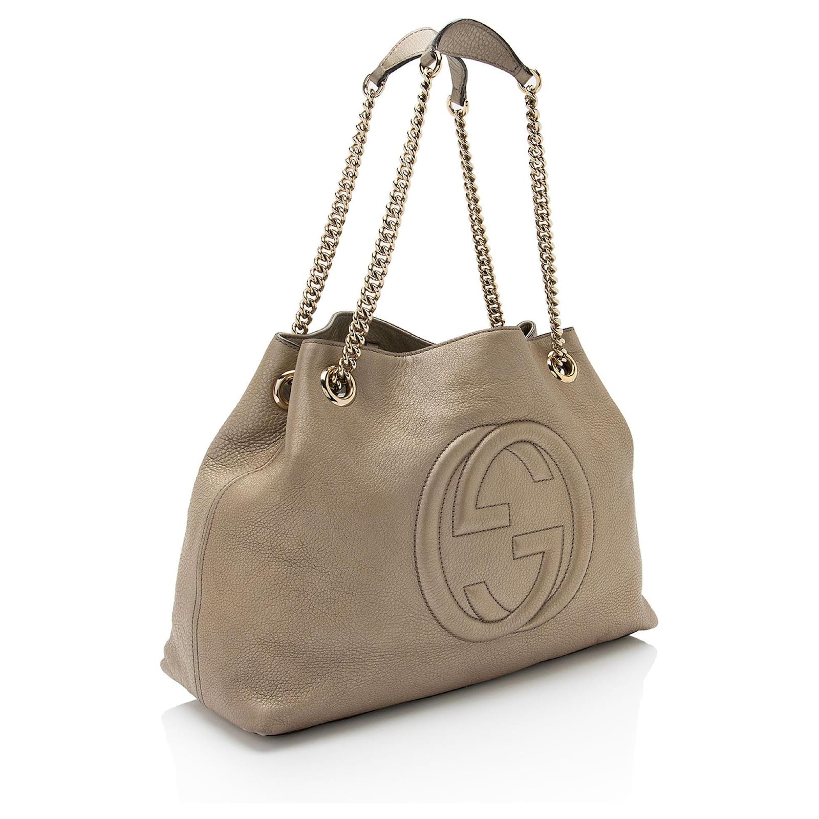 The Italian fashion house of Gucci continues to reinterpret its rich heritage under current Creative Director Alessandro Michele (2015). Maintaining a balance between historical reference and contemporary eclectic flare, the brand’s signature “double g” remains iconic. Gucci has been recognized as a worldwide leader in the luxury goods market for 90 years.Condition Notes: Heavy scuffs and wear to exterior bottom corners. Creasing and visible scuffs throughout exterior. Light discoloration throughout exterior and leather on handles. Surface scratches to hardware. Marks and light discoloration throughout interior.Width (at base): 15\”Height: 10.5\”Depth: 5.5\”Handle Drop: 9\”Shoulder Strap Drop: 16\”Type of Material: Metallic LeatherColor: GoldLining: Beige CanvasPockets: Three InteriorHardware: Gold ToneClosure: Spring ClaspOrigin: Italy Measurments: width: 381 mm height: 266 mm strap length: 406.4 mm handle drop: 228.6 mm \n Product Id: 525714 \n