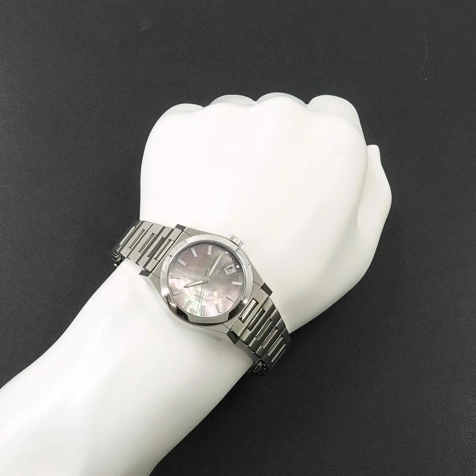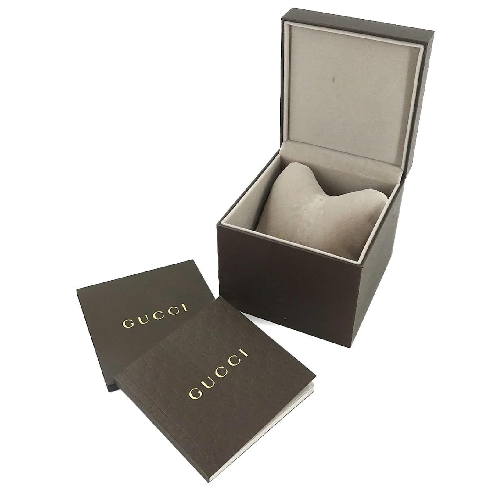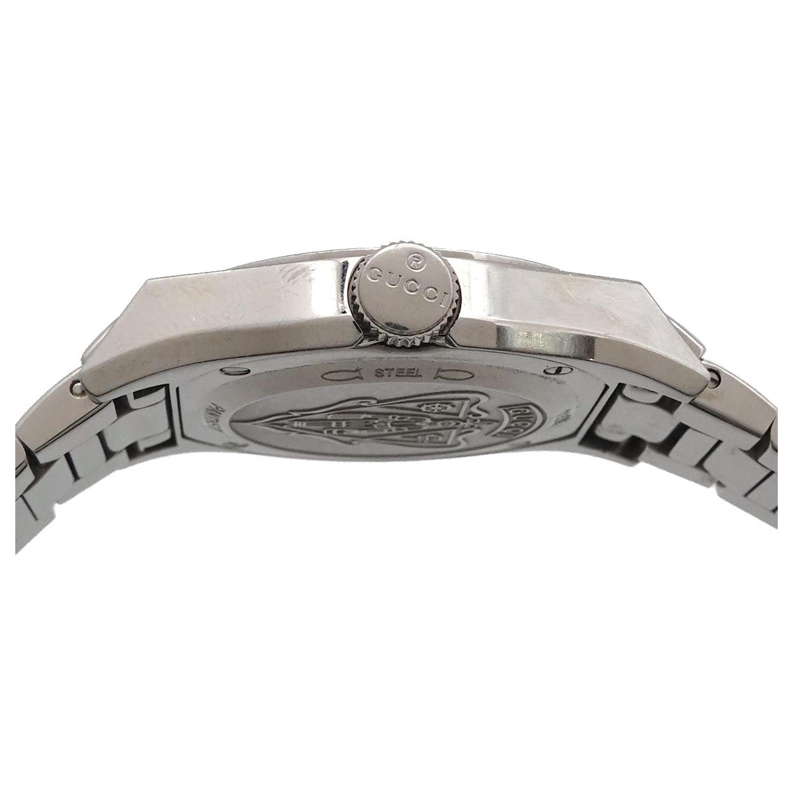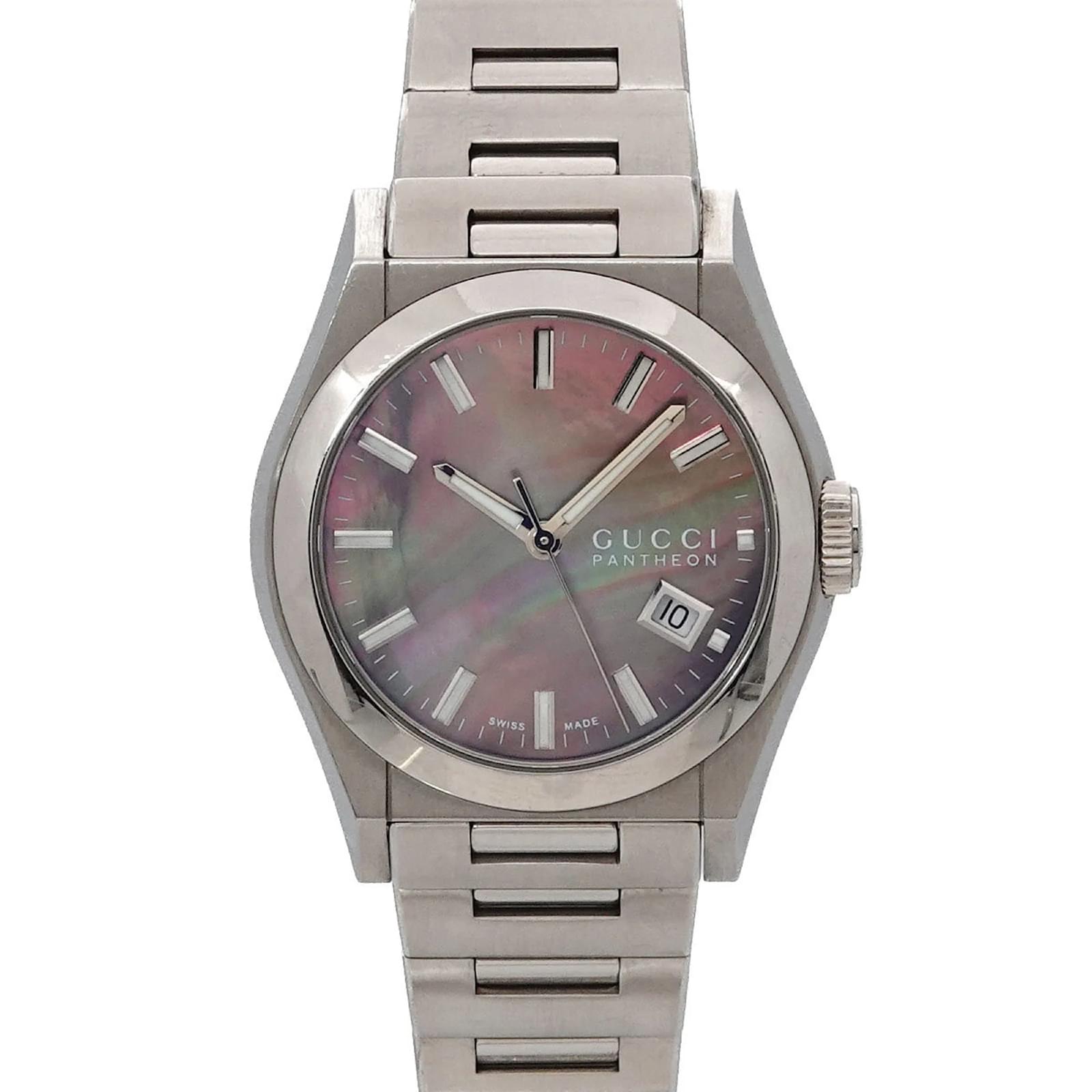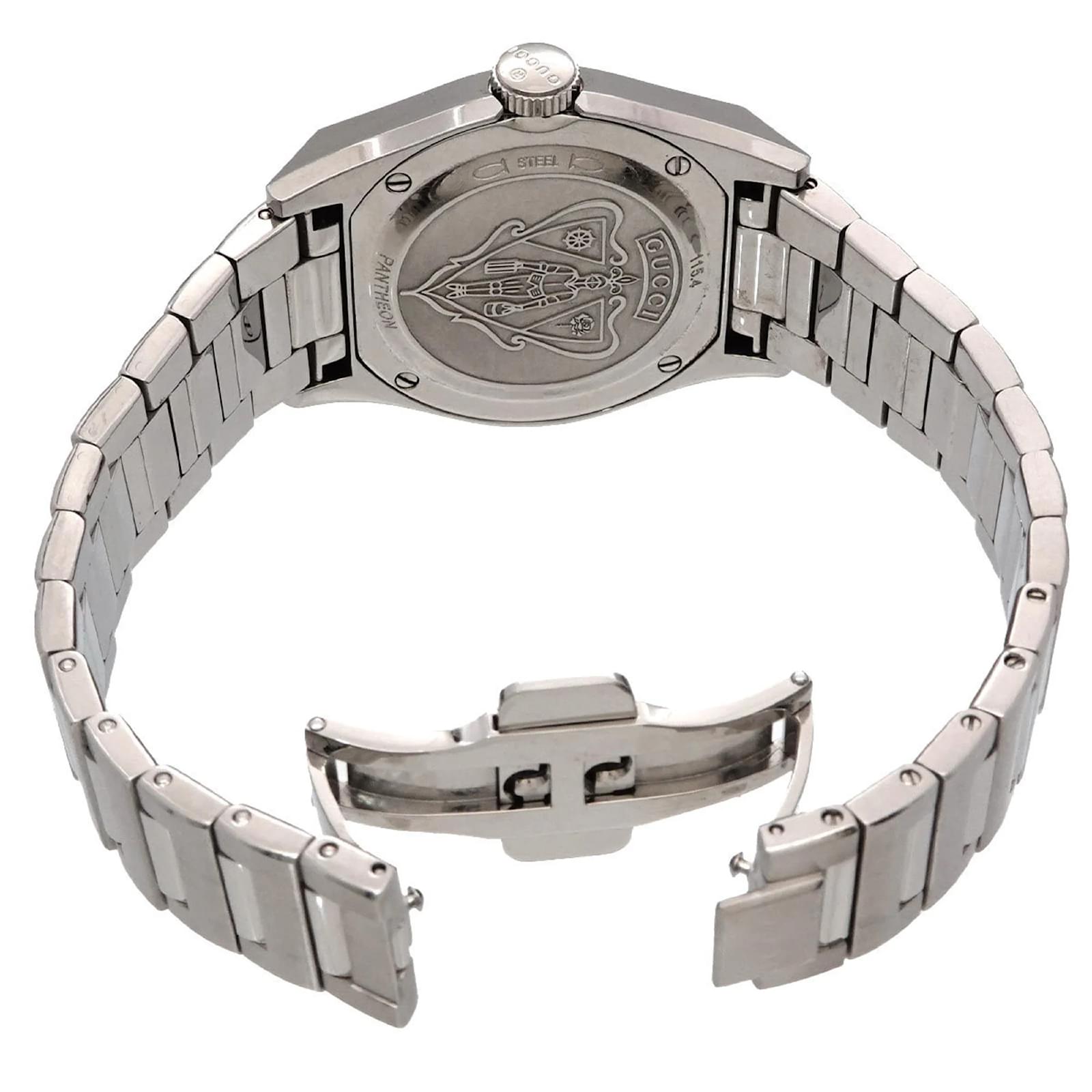 The GUCCI Pantheon 115.4 Boys Watch features a black shell dial and is crafted from stainless steel for both the case and band. This wristwatch is powered by a reliable quartz movement and is designed to fit a wrist size of 18.5cm (7.28 inches) with a case diameter of 36mm (1.42 inches). \n\nThis pre-owned timepiece is in very good condition, showing only insignificant signs of wear such as minor scratches on the bezel and case back. The battery has been replaced, ensuring it is in working order. The watch comes with a certificate, inner box, and manual. Potential buyers are encouraged to review the provided images for a detailed view of the item’s condition and included accessories.