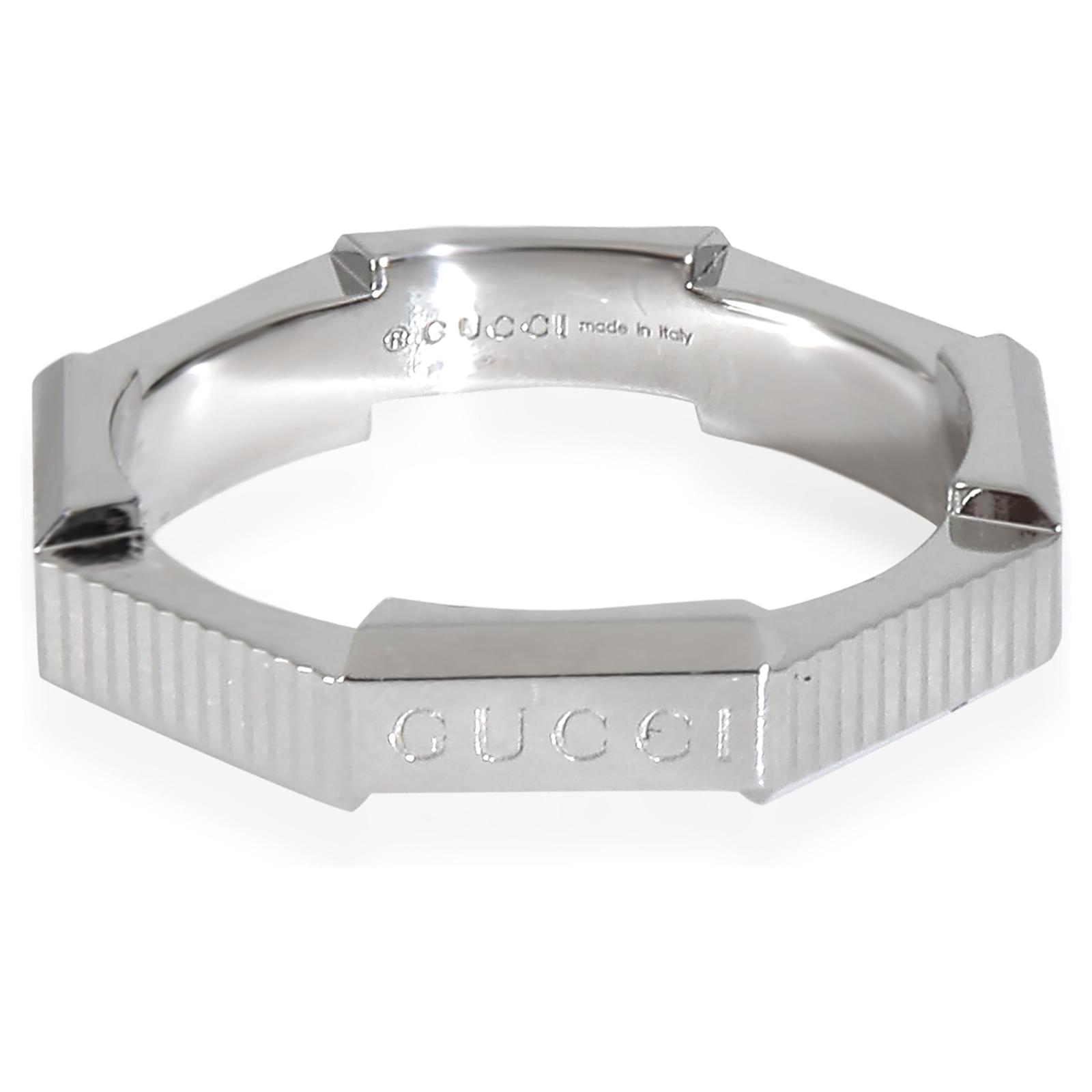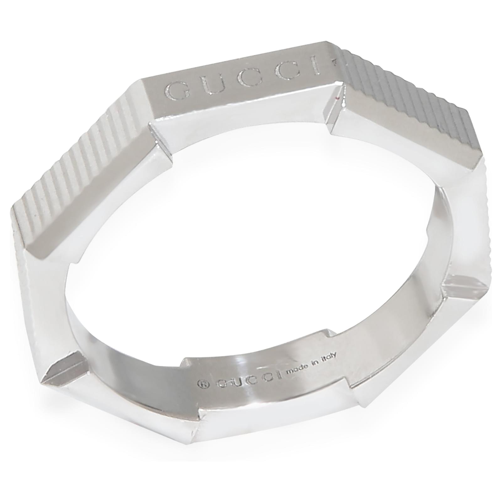 Gucci White Gold Link To Love Ring\n\nPRIMARY DETAILS\nSKU: 146425\nListing Title: Gucci White Gold Link To Love Ring\nCondition Description: Retails for 1500 USD. In excellent condition. Ring size is 5.75. Comes with Pouch;\nBrand: Gucci\nCollection/Series: Link To Love\nMetal Type: White Gold\nMetal Purity: 18k\nRing Size: 5.75\nPre-Owned Jewelry Condition: Excellent\n\nSIDE STONE INFORMATION\nOriginal Box?: No\nOriginal Papers?: No