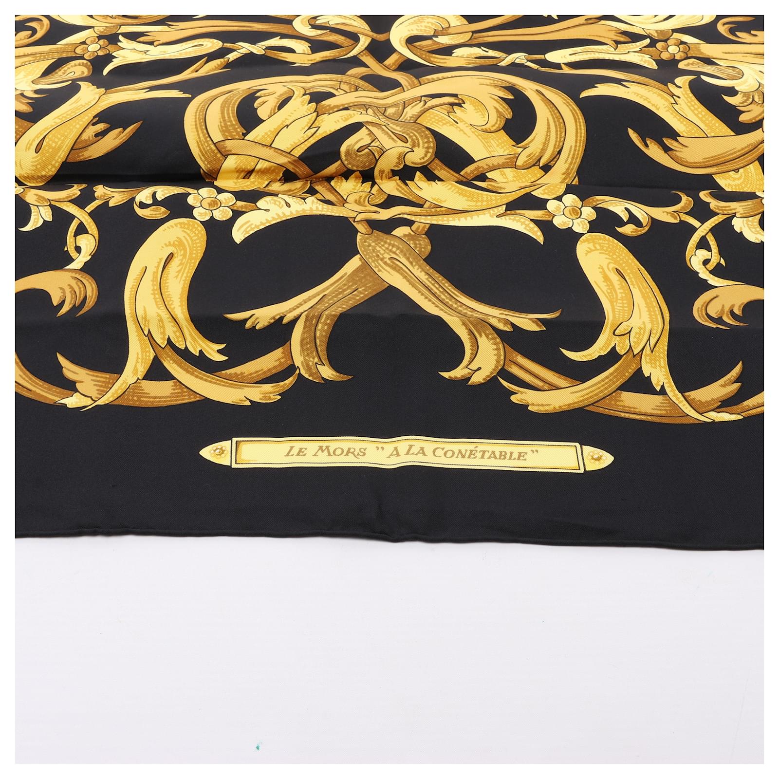 Hermès Carré 90 “Le Mors à la Conétable” scarf in 100% silk, showcasing an\nopulent gold equestrian motif against a deep black background. A bold, regal\naccessory that embodies classic Hermès elegance and grandeur.\nBrand: Hermes\nSize: 90×90 cm \nCondition: Never worn\nCondition Details: -\nMain Colour: Black\nColours: Gold\nMain material: 100% silk\nManufactured In: France\nComes With: –