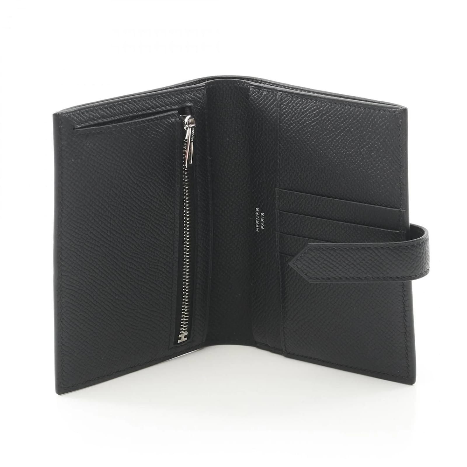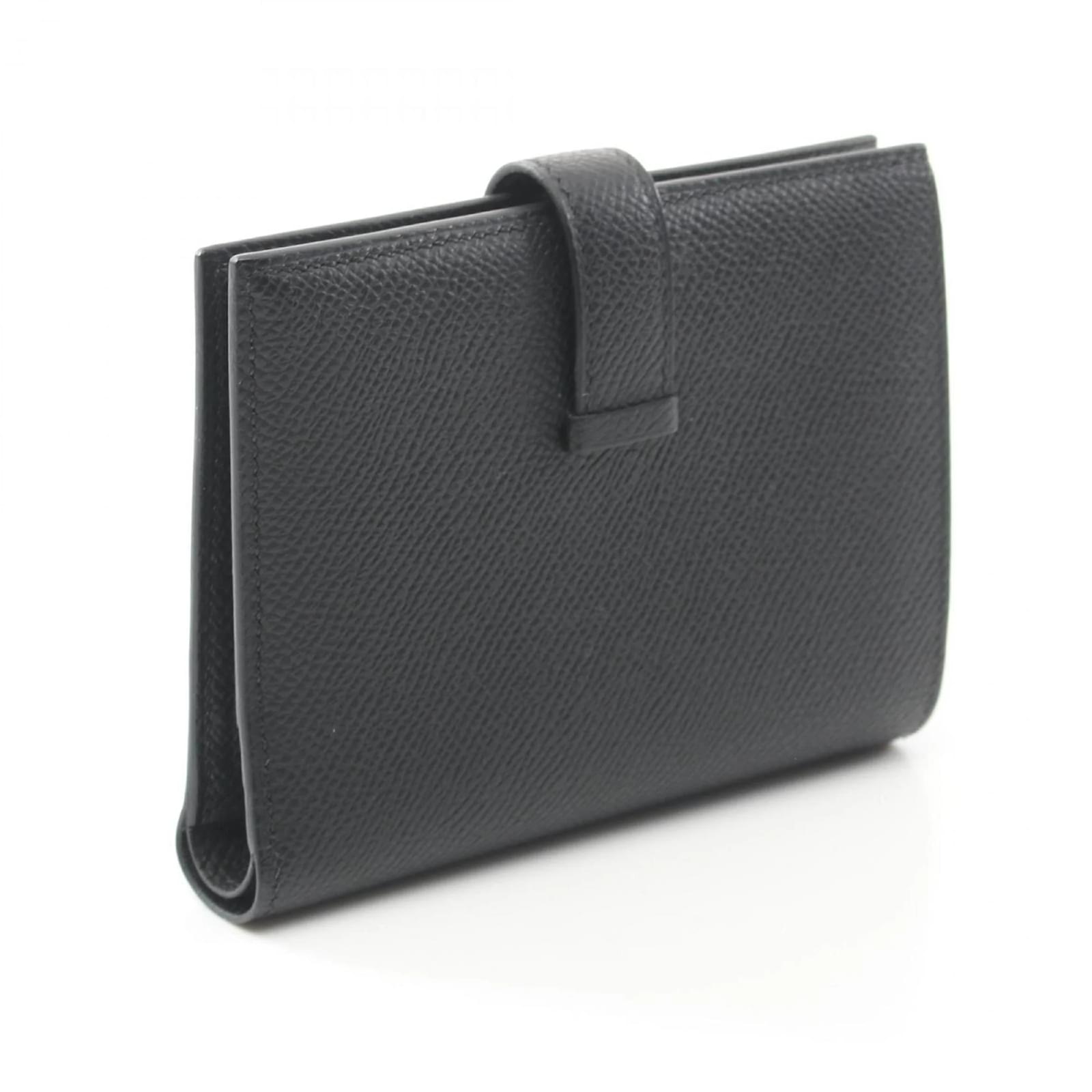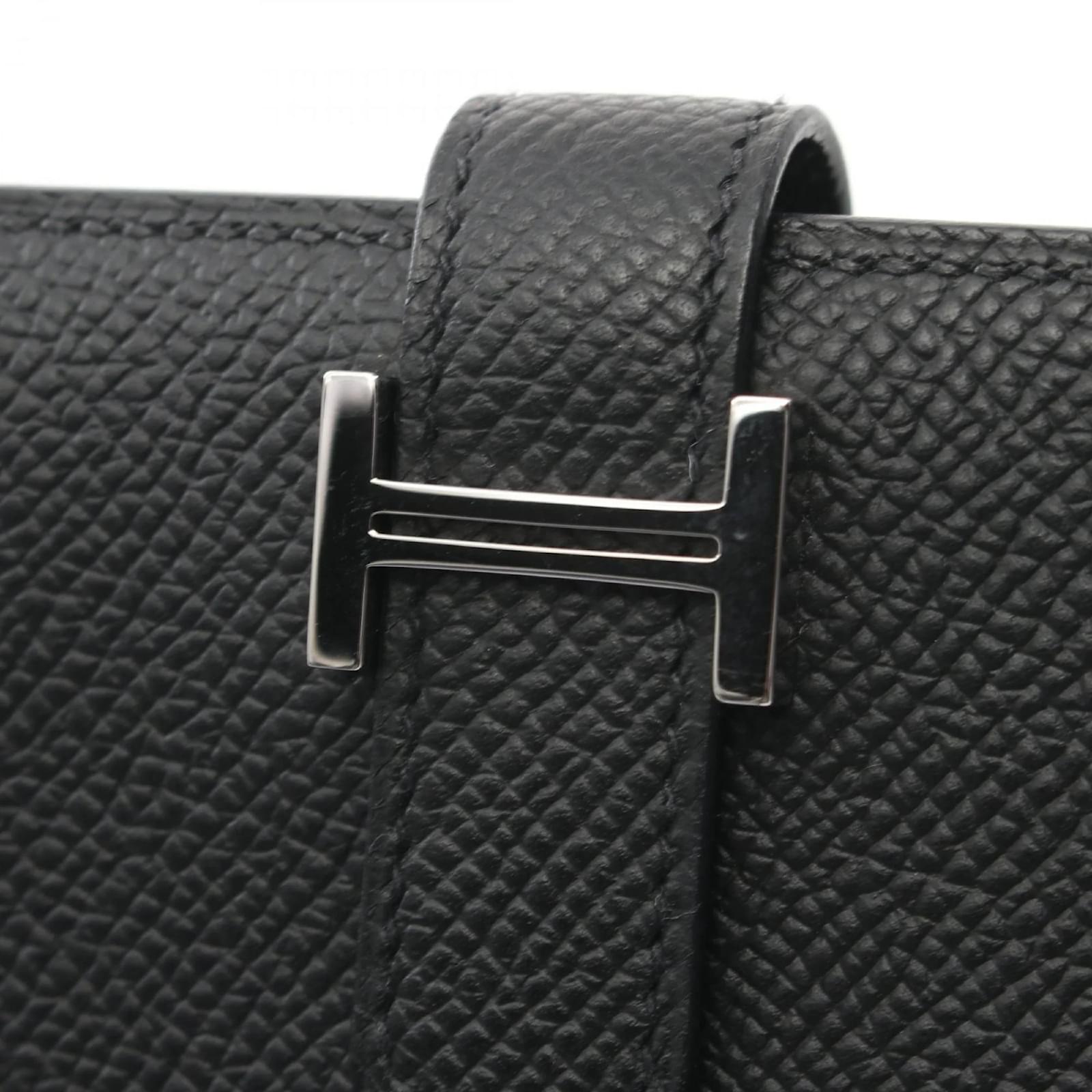 The Hermes Bearn Compact Bi-fold Wallet is crafted from Epsom leather in a classic black color. This wallet measures 9cm x 12cm x 2cm, making it a practical choice for everyday use. It is a pre-owned item in good condition, with slight traces of use, including minor scratches and dirt. The wallet is ranked as AB, indicating it has been well-maintained despite visible signs of wear. Buyers are encouraged to review the provided images for a detailed view of the item’s condition and included accessories. The wallet features a serial number, BBN008HG, ensuring its authenticity.