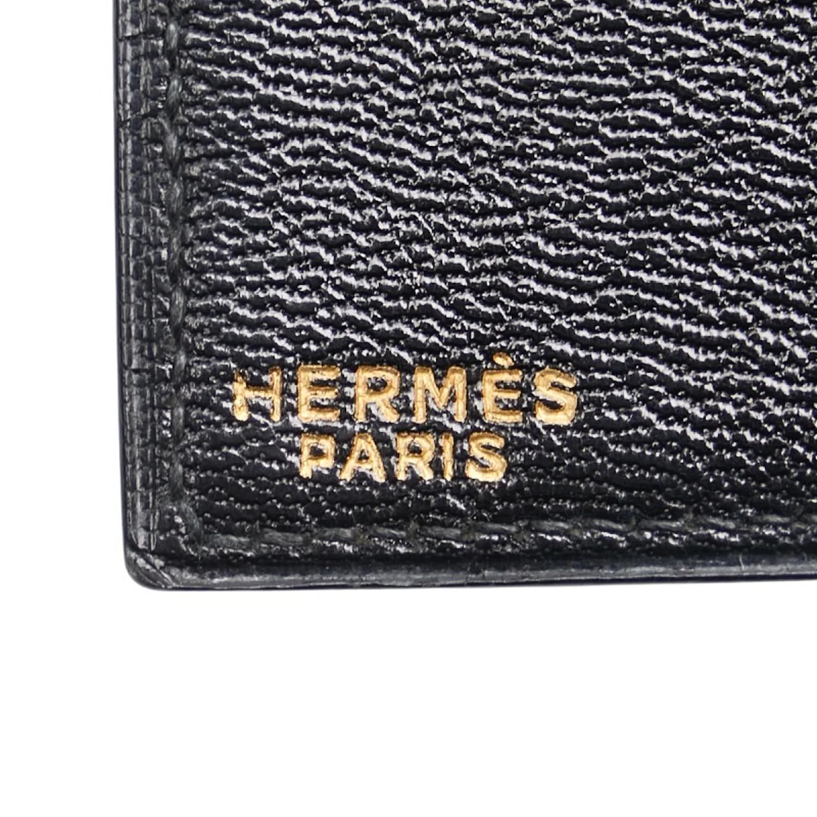 This Hermes bi-fold wallet is crafted from black leather, offering a classic and sophisticated design. Measuring 11cm x 10cm x 1cm, it is compact yet functional for everyday use. The wallet is pre-owned and in good condition, with some slight traces of usage, including minor scratches and dirt. It is advisable to review the provided images for a detailed view of its condition. Accessories included with the wallet should also be checked in the images before purchase.