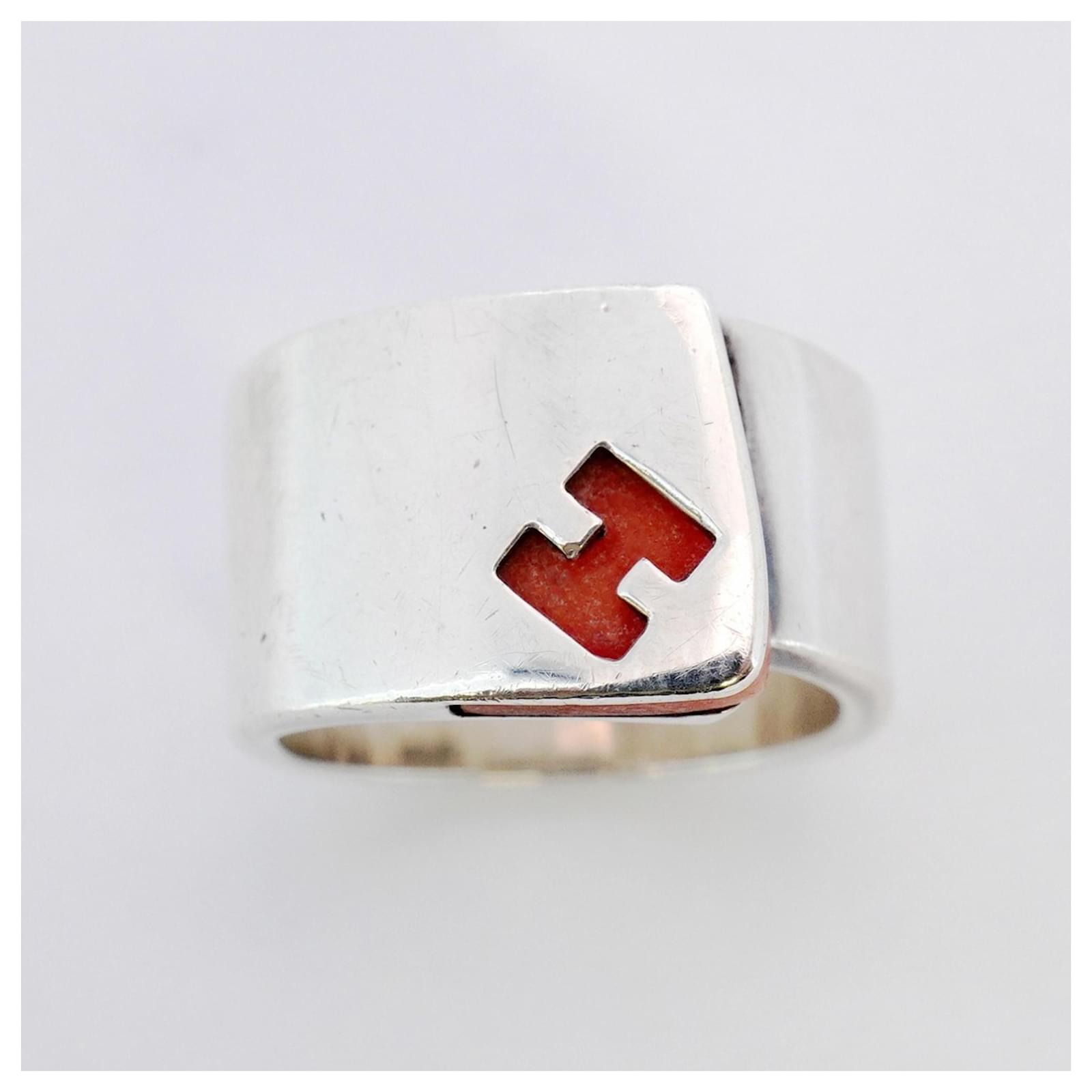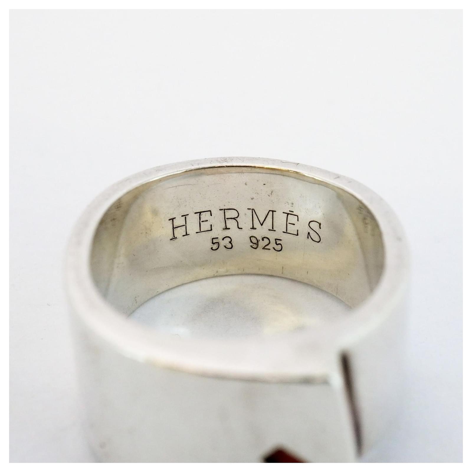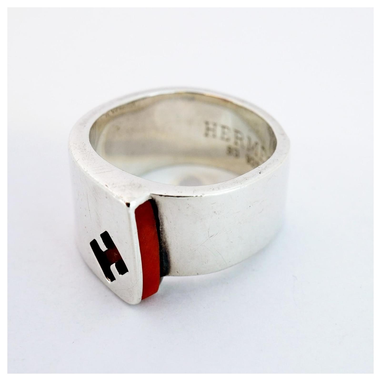 This Hermes band ring features a vibrant orange color and is crafted from Silver 925. It is designed for ladies and is available in a brand size of 53, which corresponds to a US size of 6.5. The ring is classified as used but is in good condition, showing slight traces of use, including minor scratches and dirt. It is important to review the provided images for a clear understanding of the item’s condition. No additional accessories are included with the purchase.