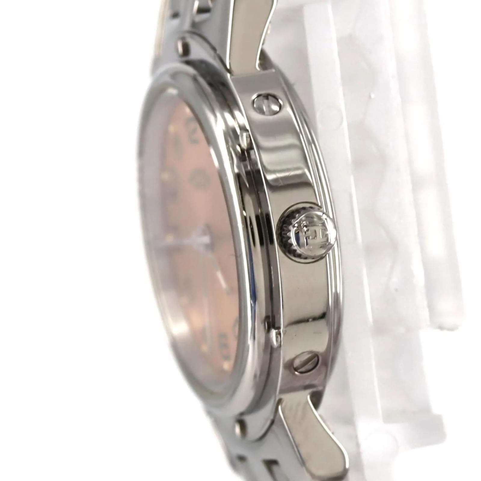 The Hermes Clipper CL4.210 is a stylish wristwatch featuring a pink dial and an analog display. Crafted from stainless steel, both the case and band offer durability and a sleek appearance. This watch is powered by a reliable quartz movement and is designed for a wrist size of 16.5cm (6.49 inches) with a case diameter of 24mm (0.94 inches). \n\nThis pre-owned timepiece is in good condition, showing slight signs of wear including minor scratches on the bezel, case, and band. The watch has been maintained with a battery replacement and polishing. It comes with a warranty for added assurance. For a detailed view of its condition, potential buyers are encouraged to refer to the provided images.