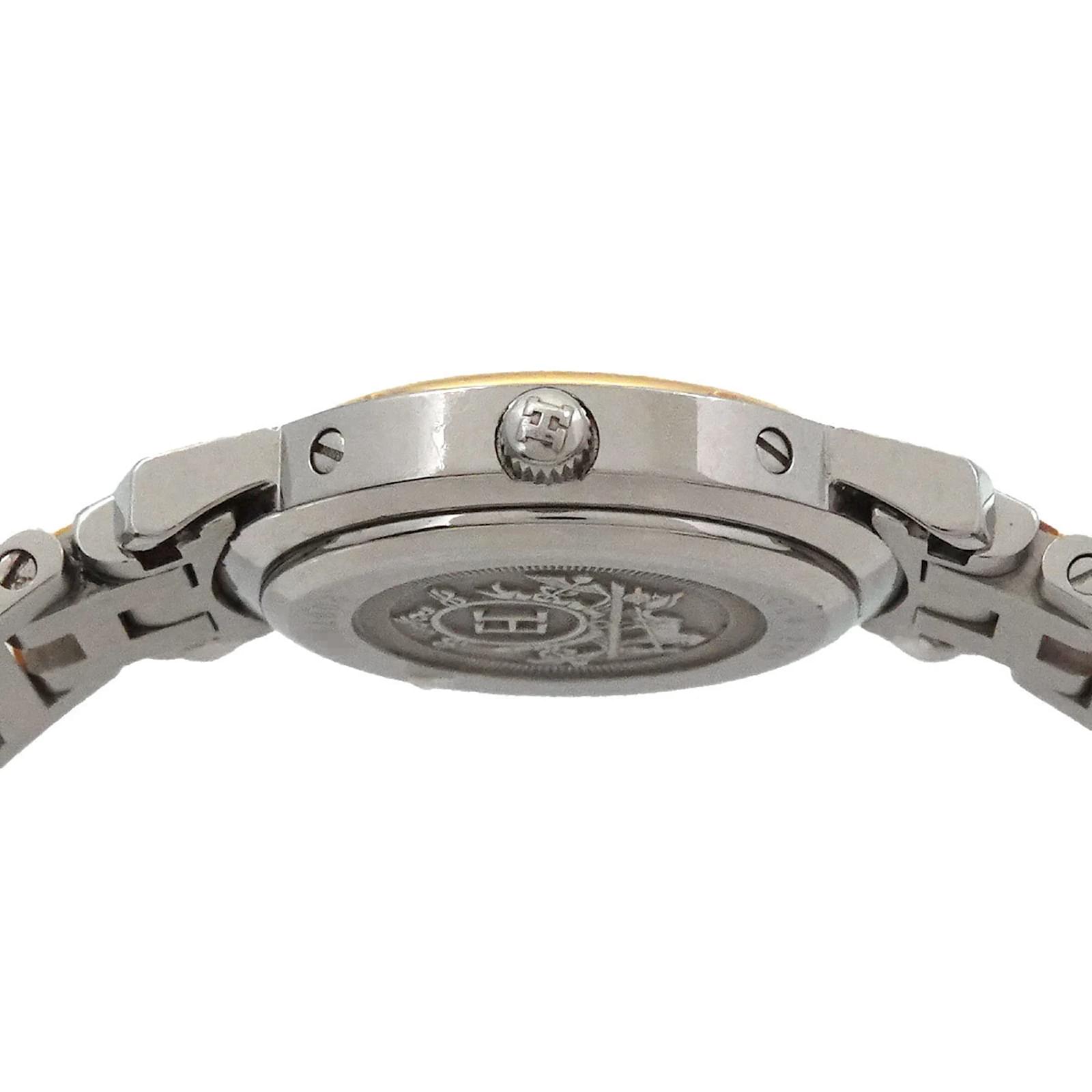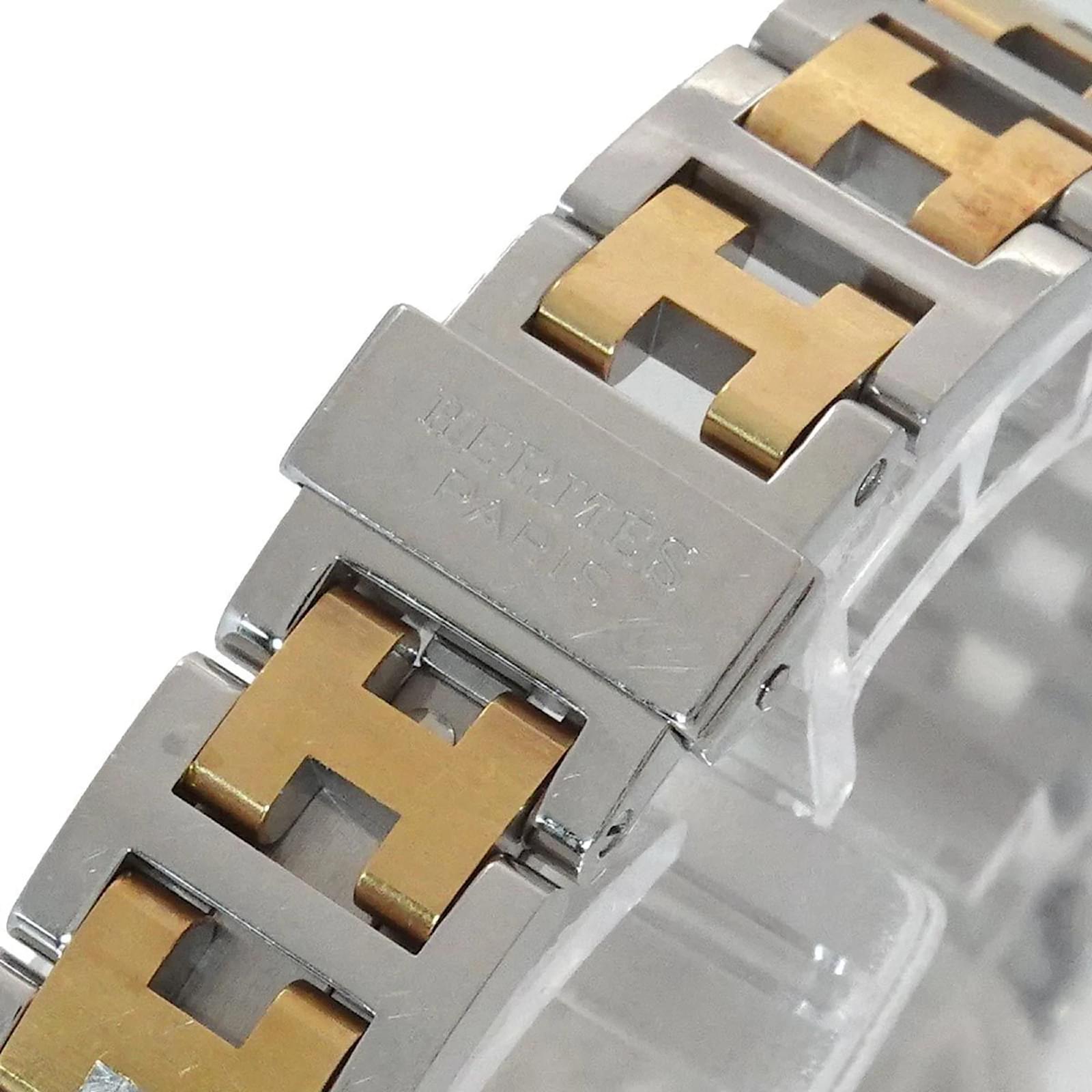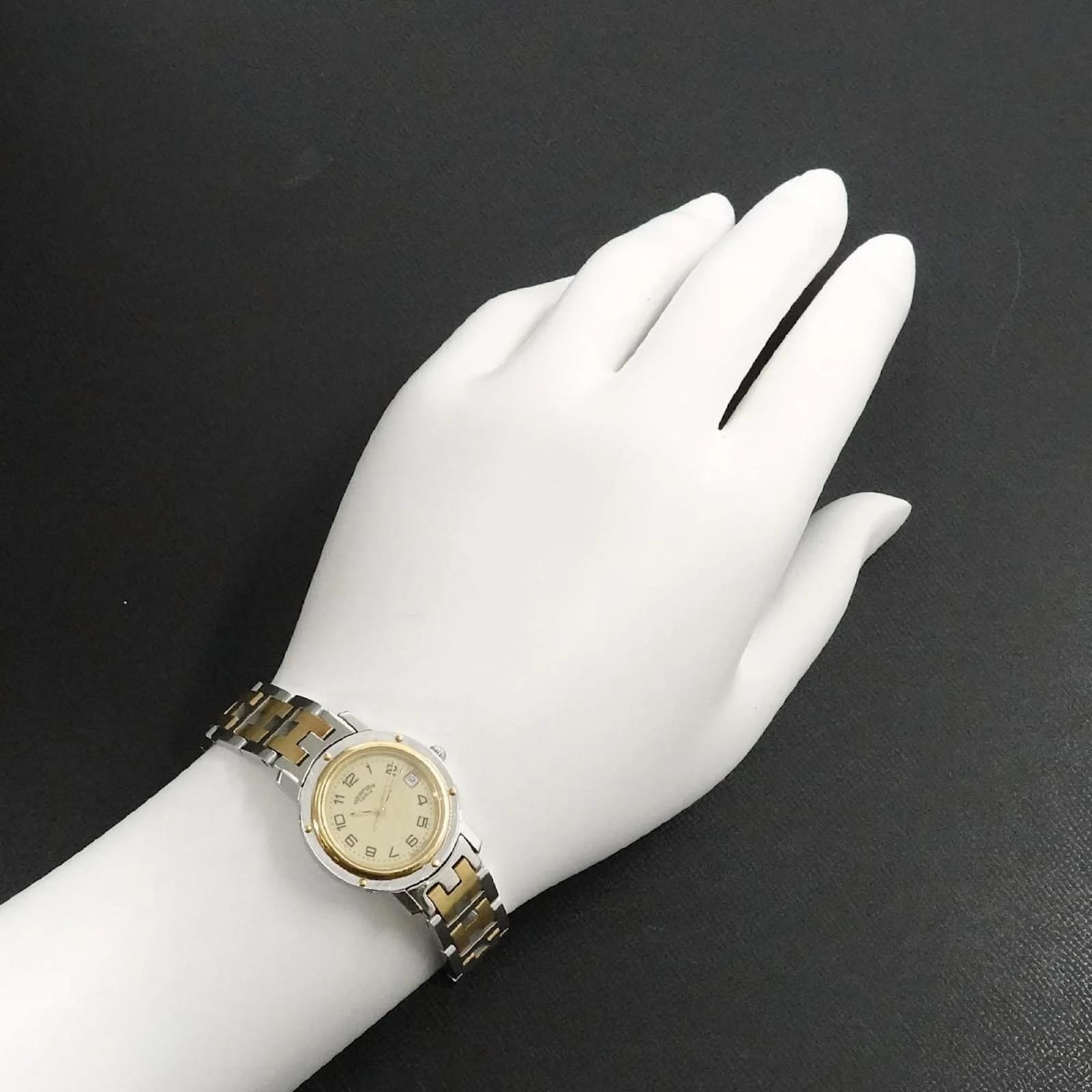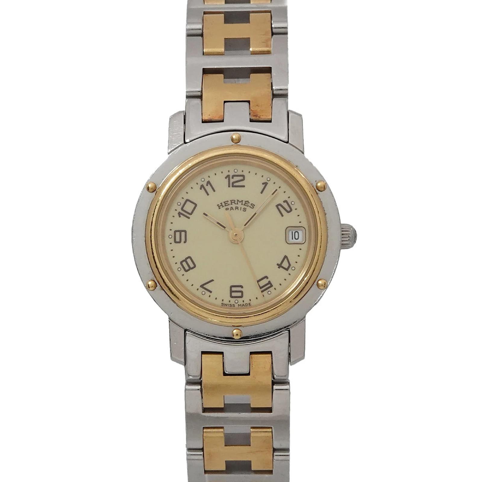 The Hermes Clipper Combi CL4 220 is a ladies wristwatch featuring an elegant ivory dial. The case is crafted from gold-plated stainless steel, providing a sophisticated look. This watch is powered by a reliable quartz movement and has a case diameter of 24mm, suitable for a wrist size of 15.5cm (6.1 inches). \n\nThis pre-owned timepiece is in like-new condition, with insignificant scratches on the bezel and case, and no visible scratches on the dial or glass. The battery has been replaced, ensuring it is in working order. The watch comes without additional accessories, and potential buyers are encouraged to review the images for a detailed view of its condition.