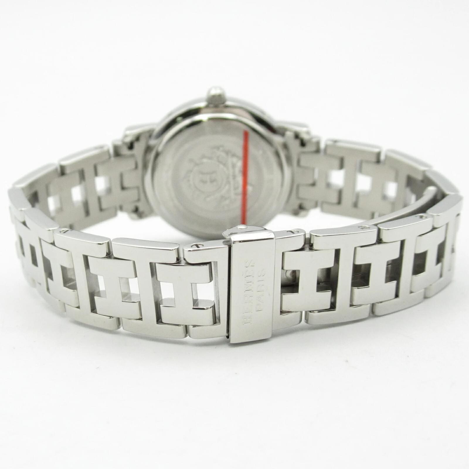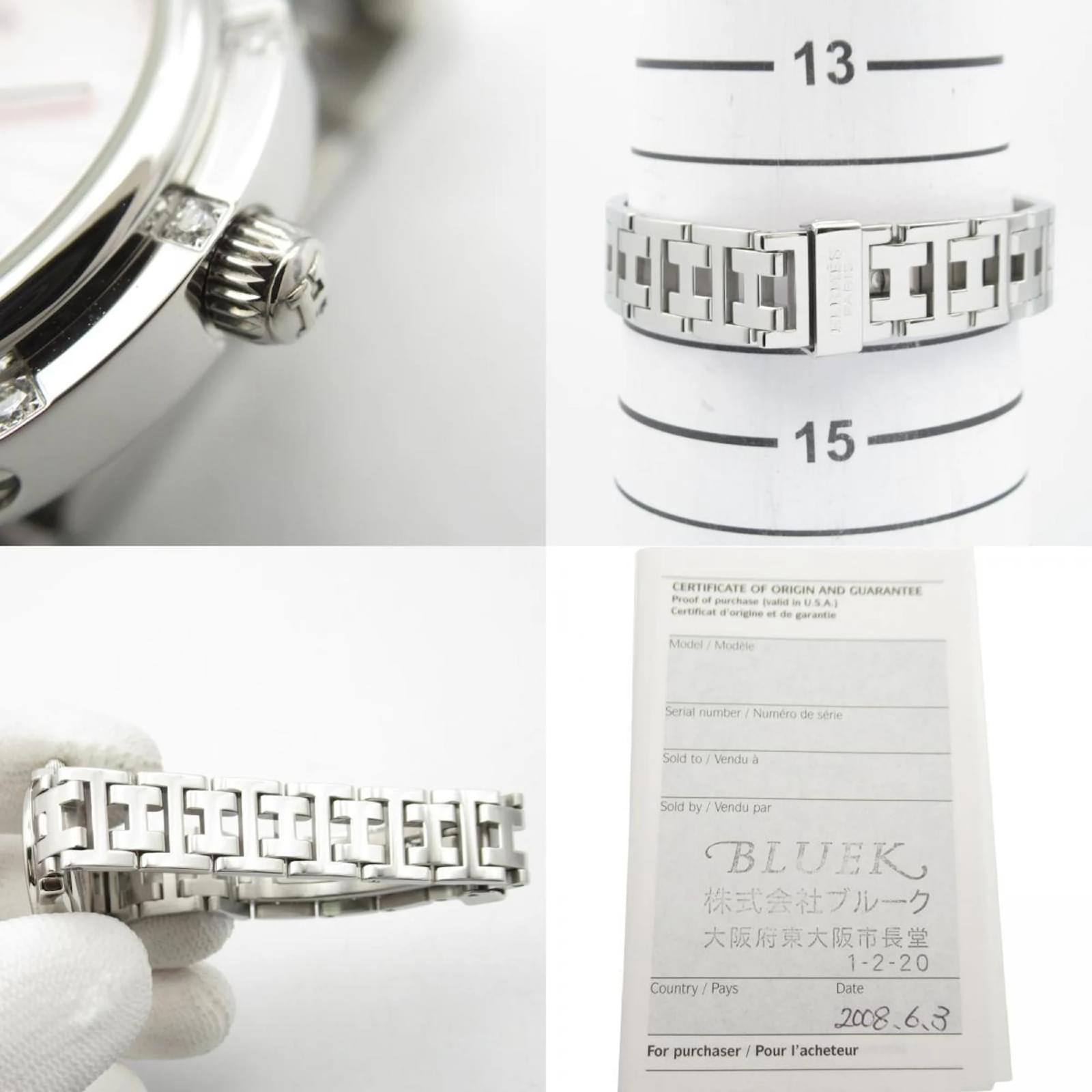 The Hermes Clipper Nacle 12P Diamond Watch is a stylish wristwatch designed for women, featuring a pink shell dial that adds a touch of elegance. The case and band are made from stainless steel, ensuring durability and a polished look. This watch operates on a quartz movement and has a case diameter of 24mm, suitable for a wrist size of 14cm (5.51 inches). \n\nThis pre-owned timepiece is in good condition, with insignificant bezel and crown scratches, and slight scratches on the glass and case. The battery has been replaced, and the watch has been polished for a refreshed appearance. Included with the watch are a guarantee card, inner box, and outer box. Potential buyers are encouraged to review the images for a detailed view of the item’s condition.