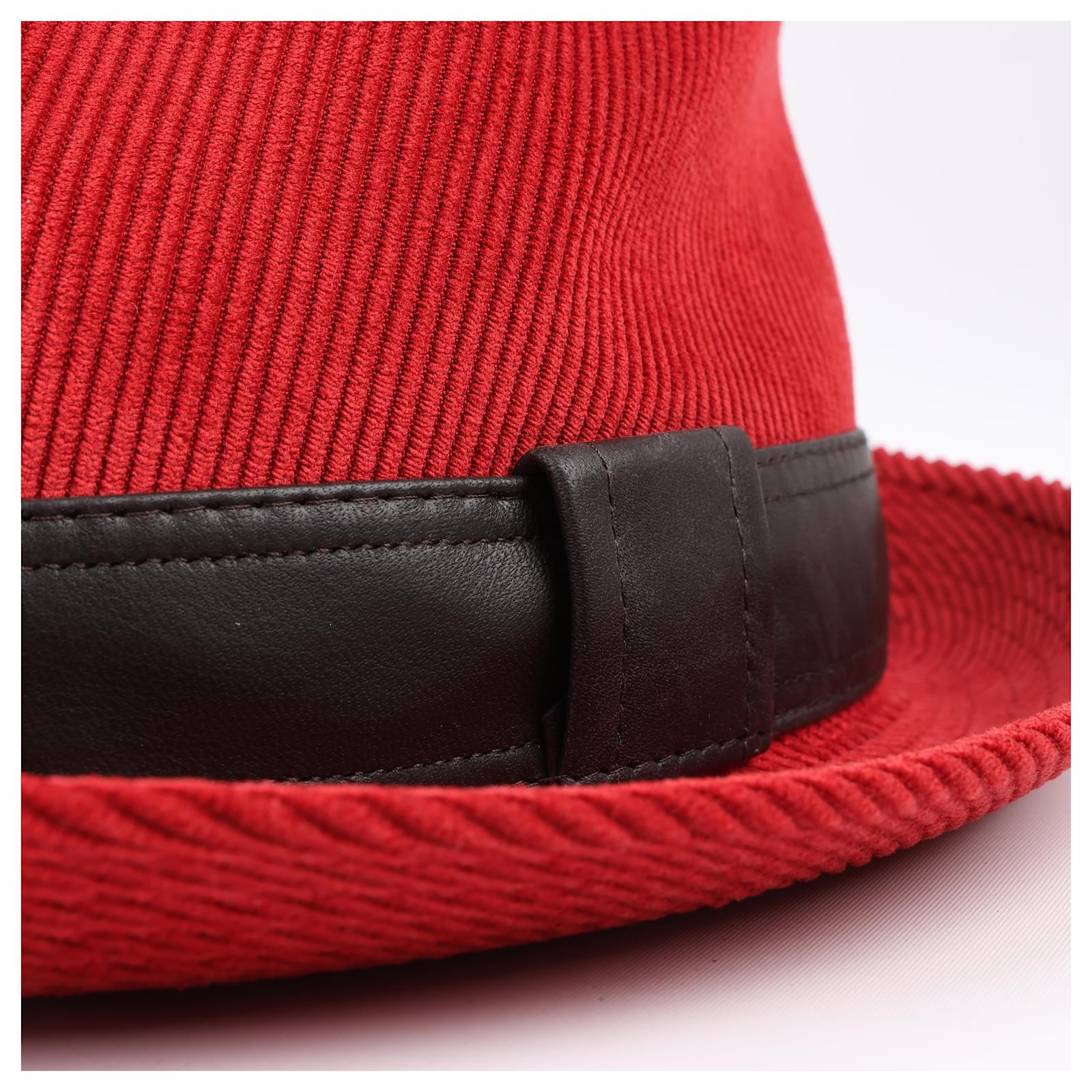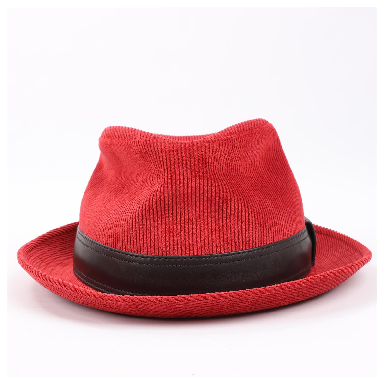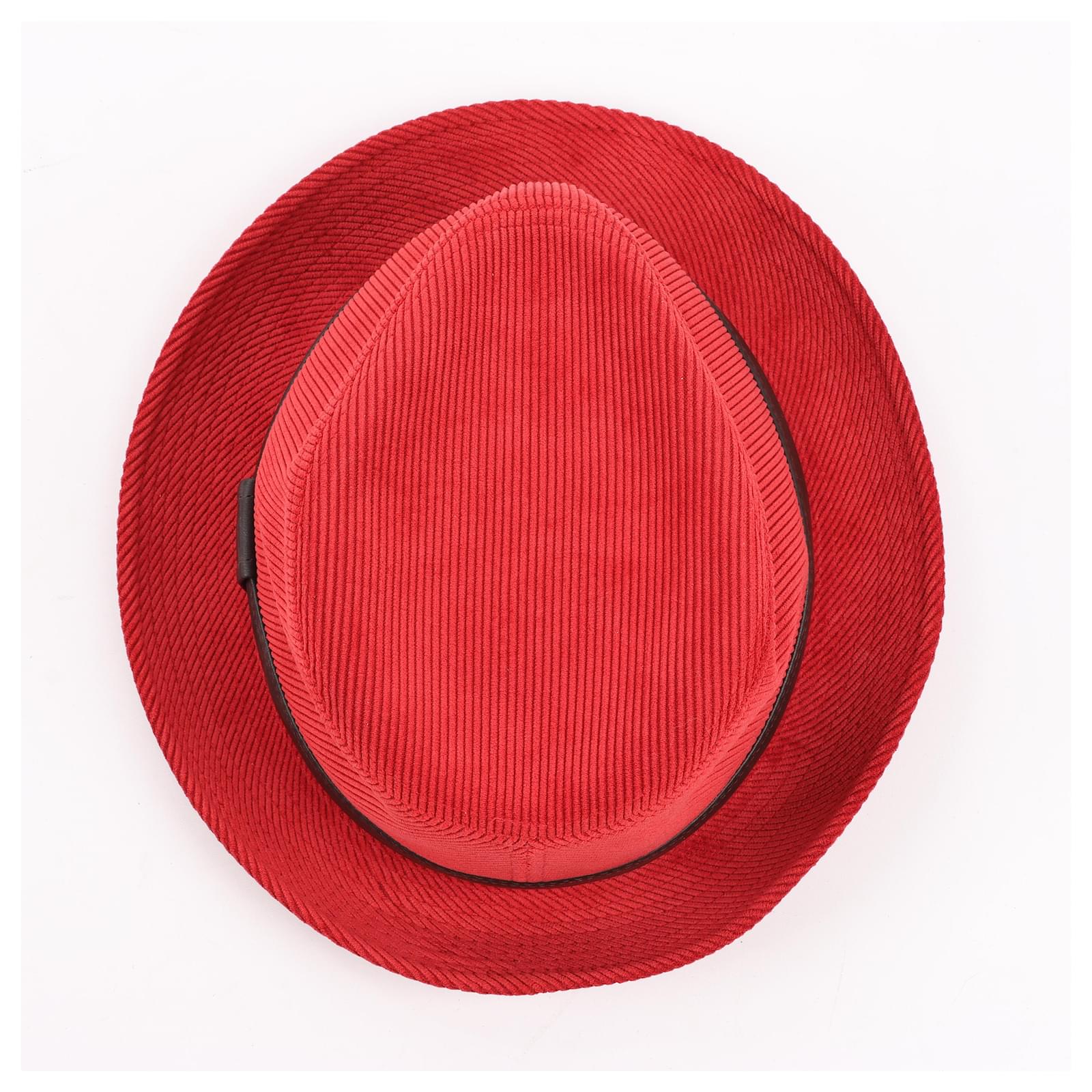 Hermès Corduroy Fedora Hat in vibrant red, featuring a sleek black leather band.\nThis sophisticated hat showcases Hermès’ renowned craftsmanship, blending bold\ndesign with luxurious texture for a statement accessory perfect for elevating\nany ensemble.\nBrand: Hermes\nSize: 57\nDimensions: 20 x 16.5 cm\nCondition: Never worn \nCondition Details: -\nMain Colour: Red\nColours: Brown\nMain material: Polyester\nMaterials: Leather, Nylon, Acetate\nProduct Code: -\nManufactured In: France\nComes With: Box