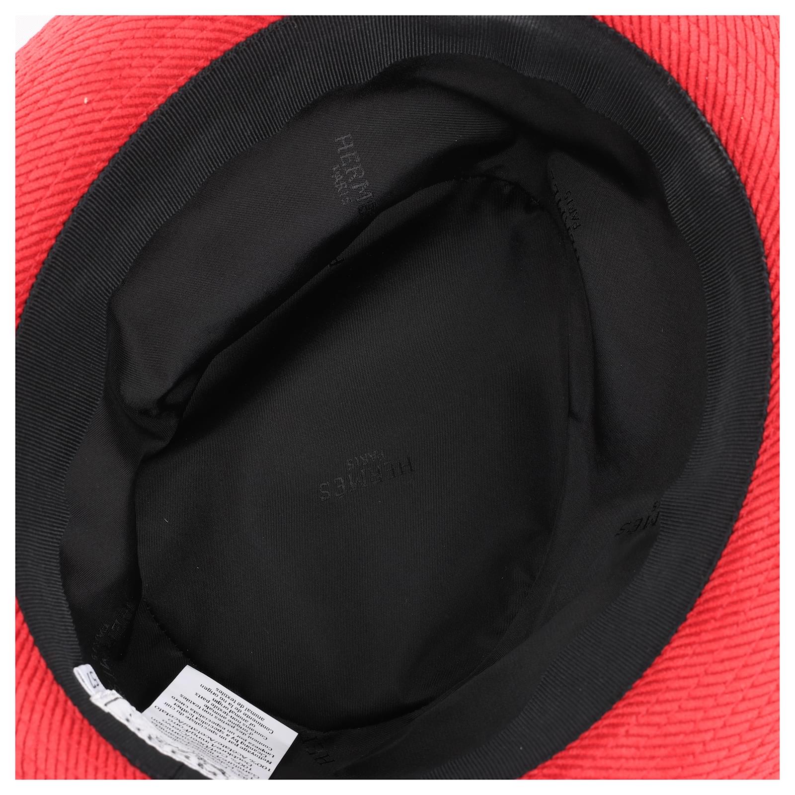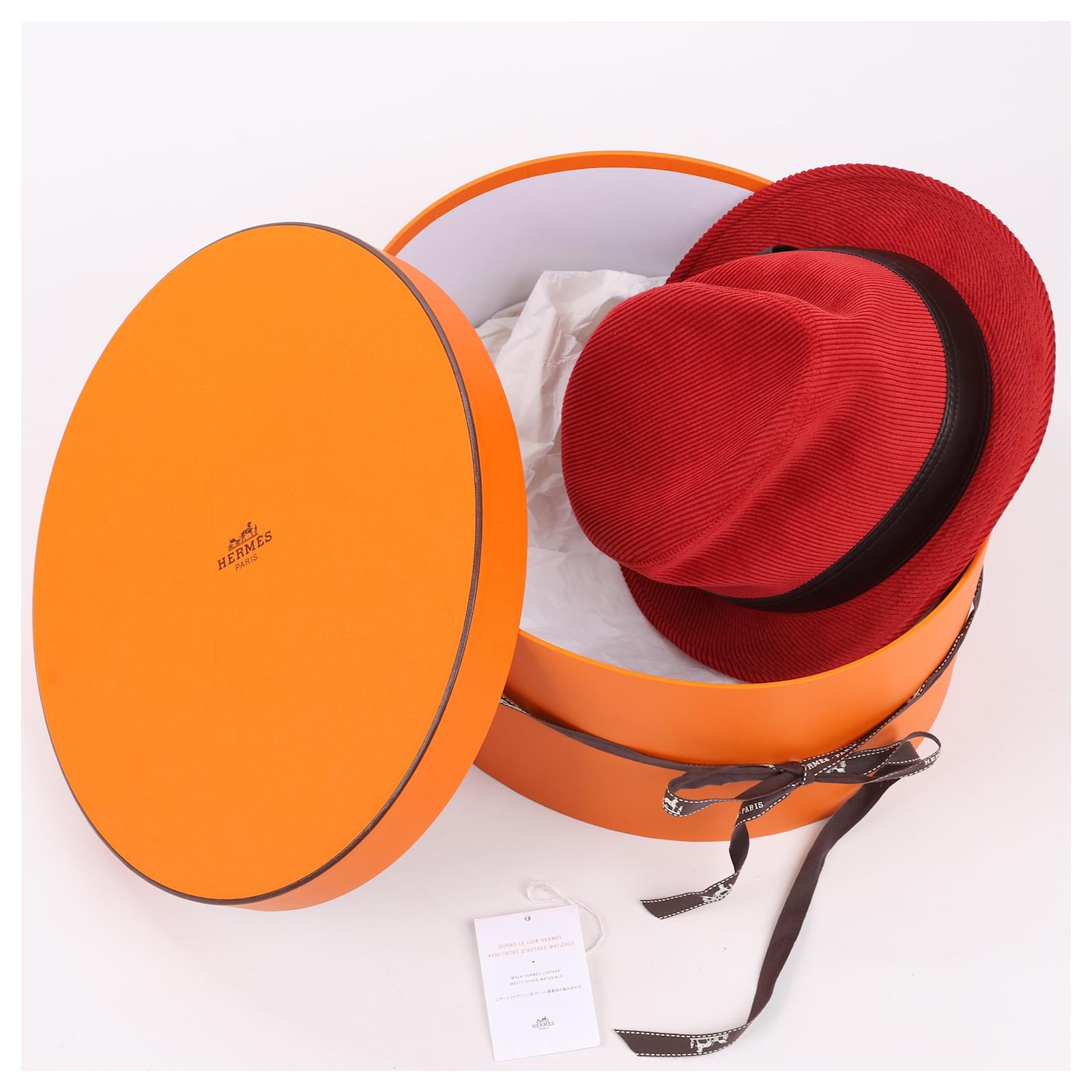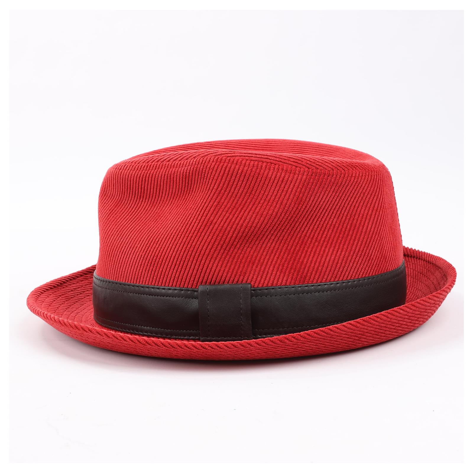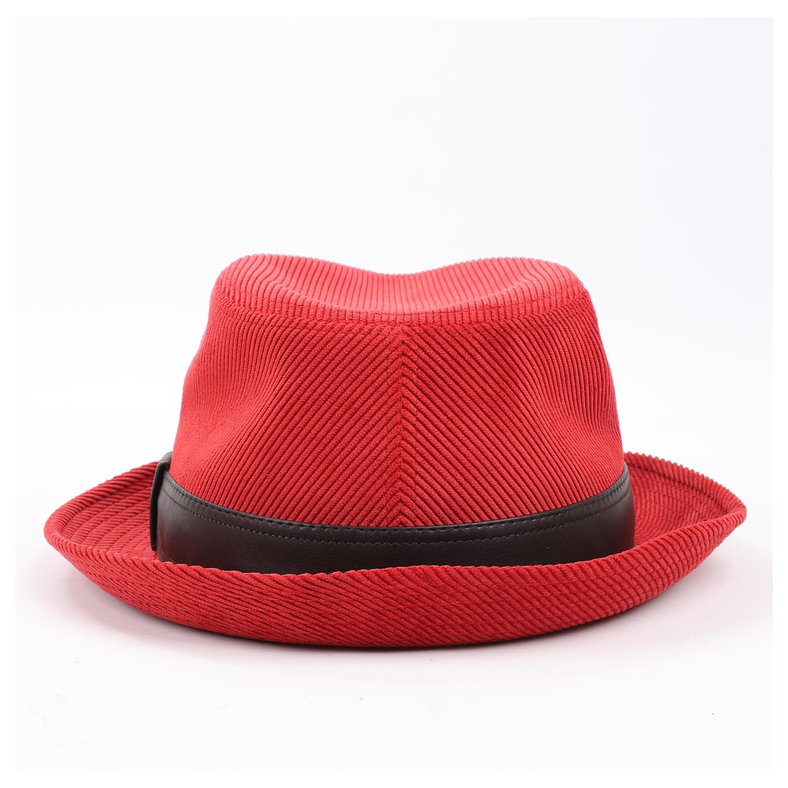Hermès Corduroy Fedora Hat in vibrant red, featuring a sleek black leather band.\nThis sophisticated hat showcases Hermès’ renowned craftsmanship, blending bold\ndesign with luxurious texture for a statement accessory perfect for elevating\nany ensemble.\nBrand: Hermes\nSize: 57\nDimensions: 20 x 16.5 cm\nCondition: Never worn \nCondition Details: -\nMain Colour: Red\nColours: Brown\nMain material: Polyester\nMaterials: Leather, Nylon, Acetate\nProduct Code: -\nManufactured In: France\nComes With: Box