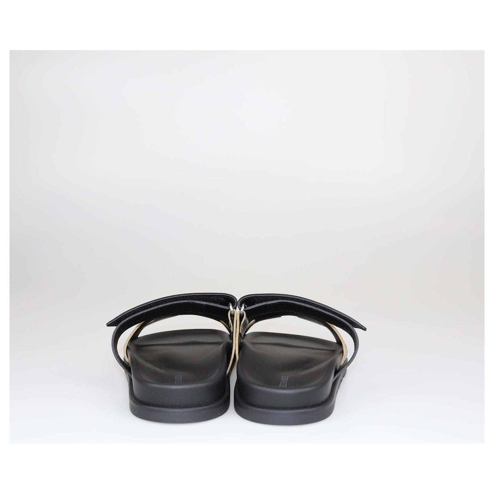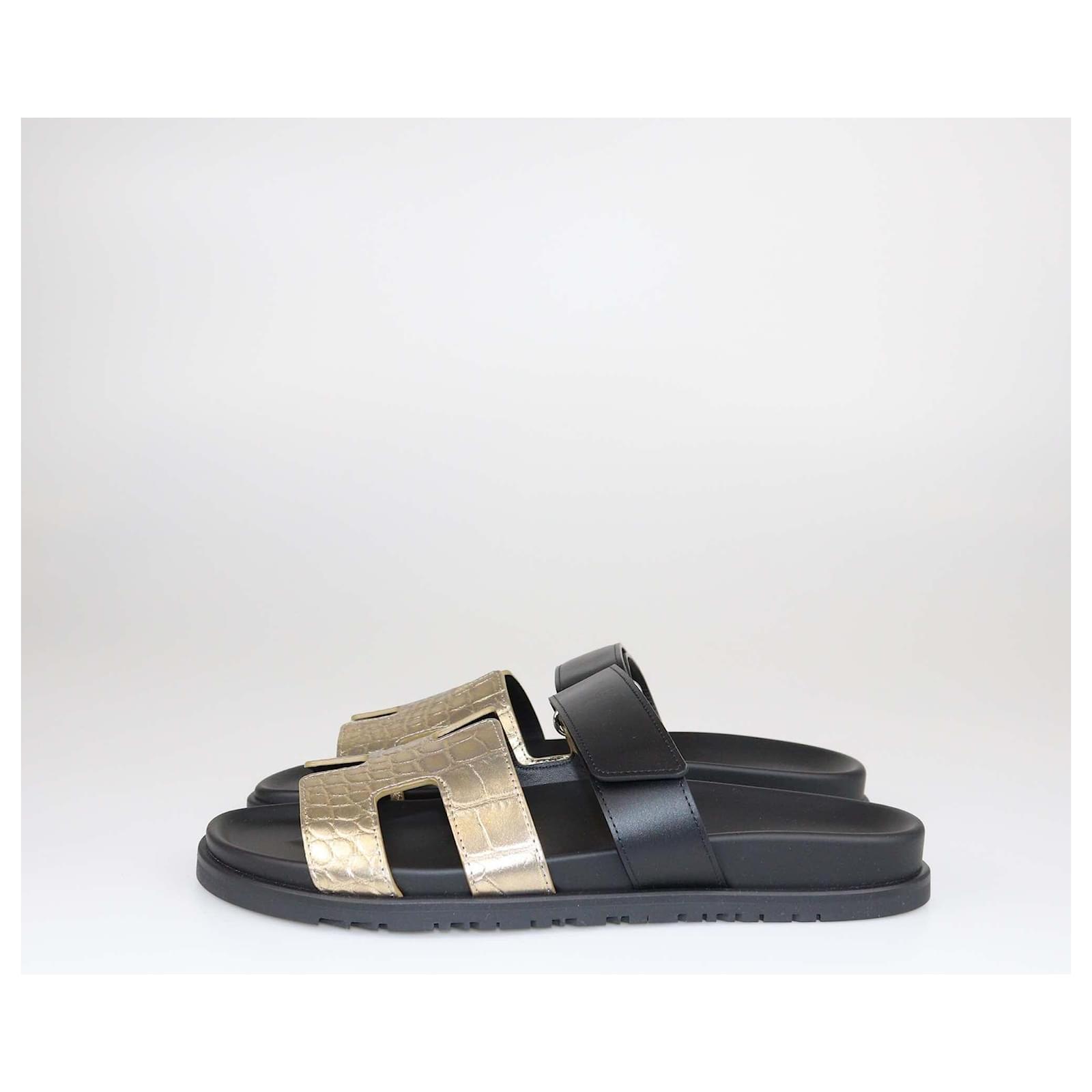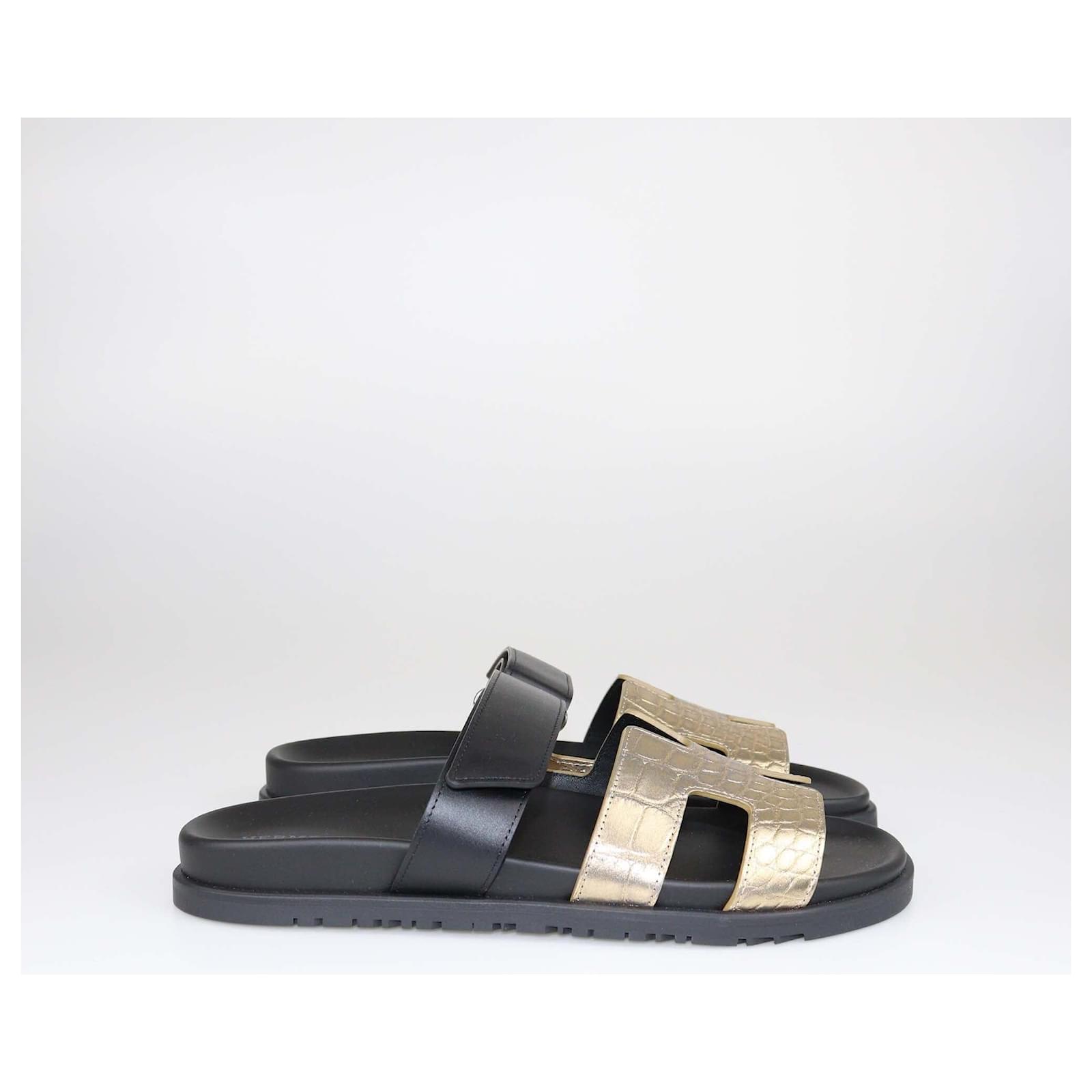 Hermes Gold/Black Alligator Chypre Flat Sandals\n- Inclusion: Box, Original Dust Bag, Booklet, Valid Cites Certificate\n- Exterior Material: Leather, Alligator\n- Origin: Italy\n- Size: 41\n- Condition: Brand New\n- Sku: 527-37