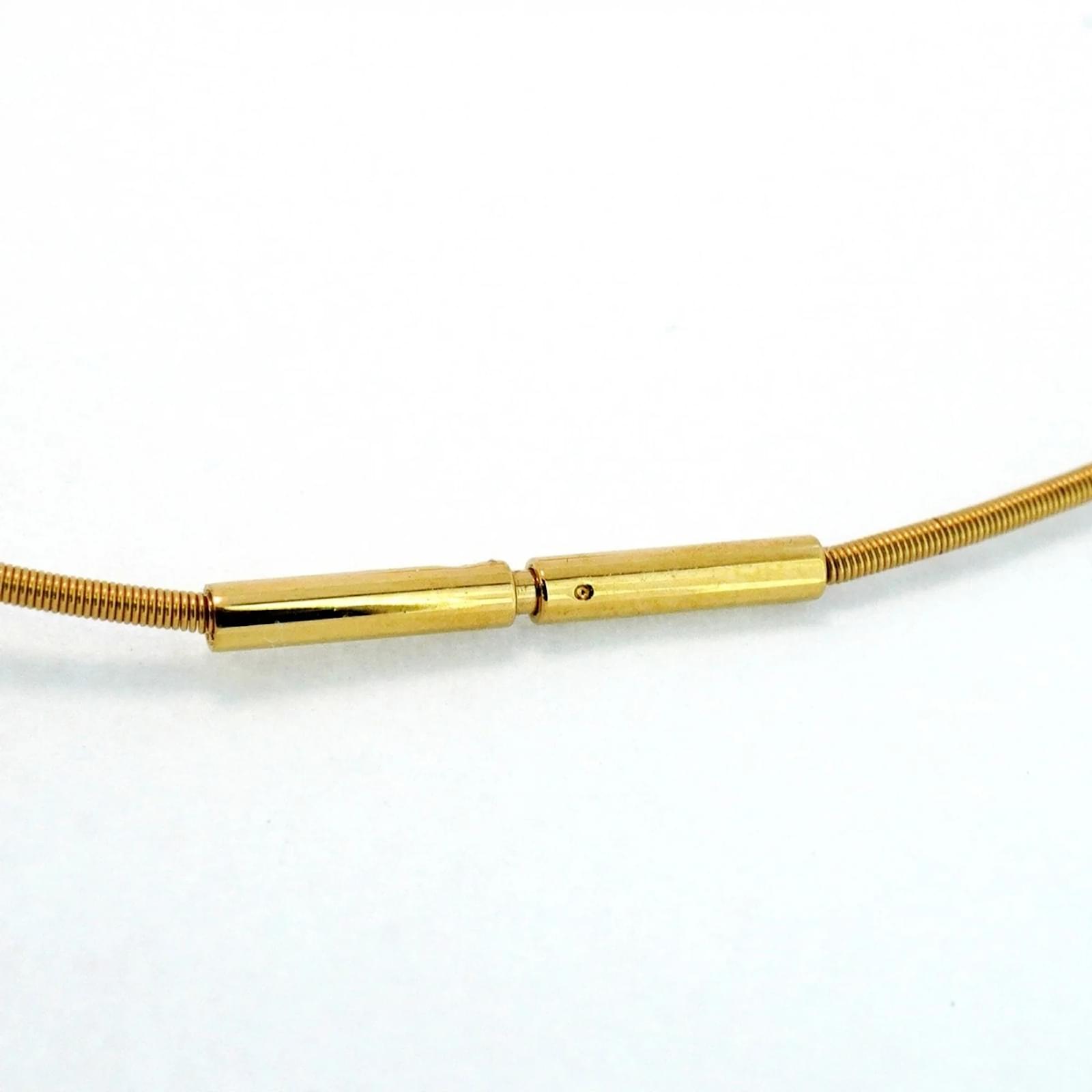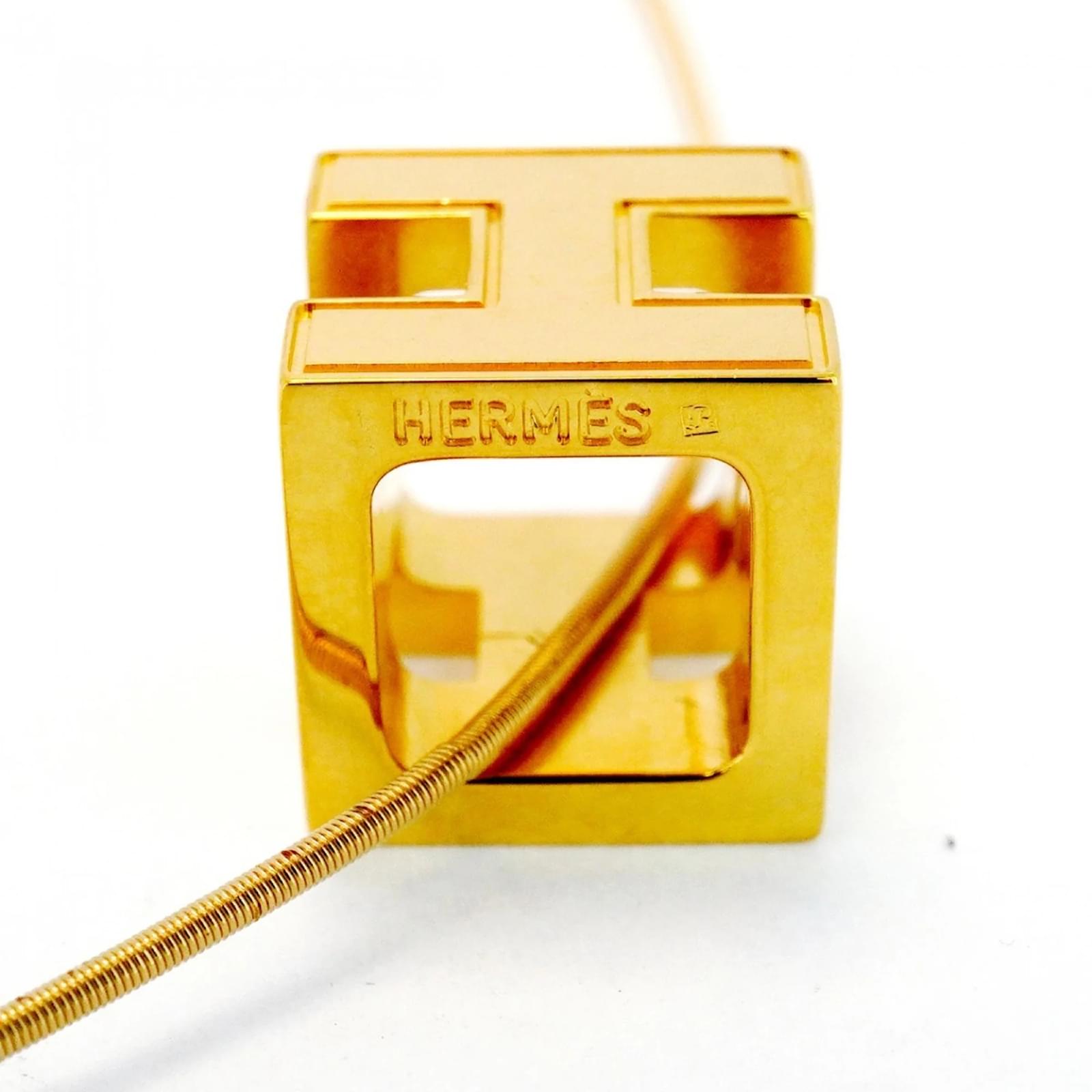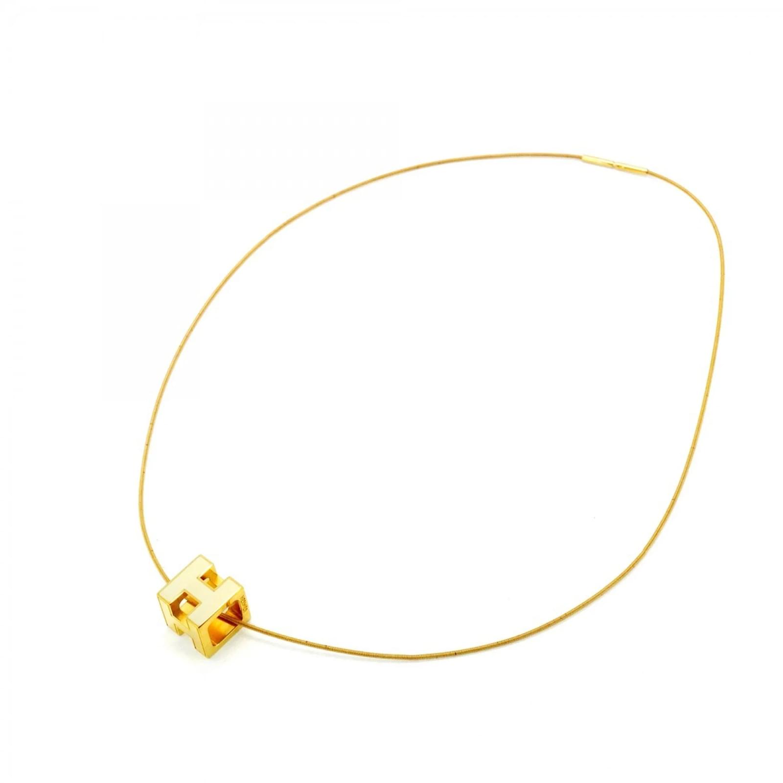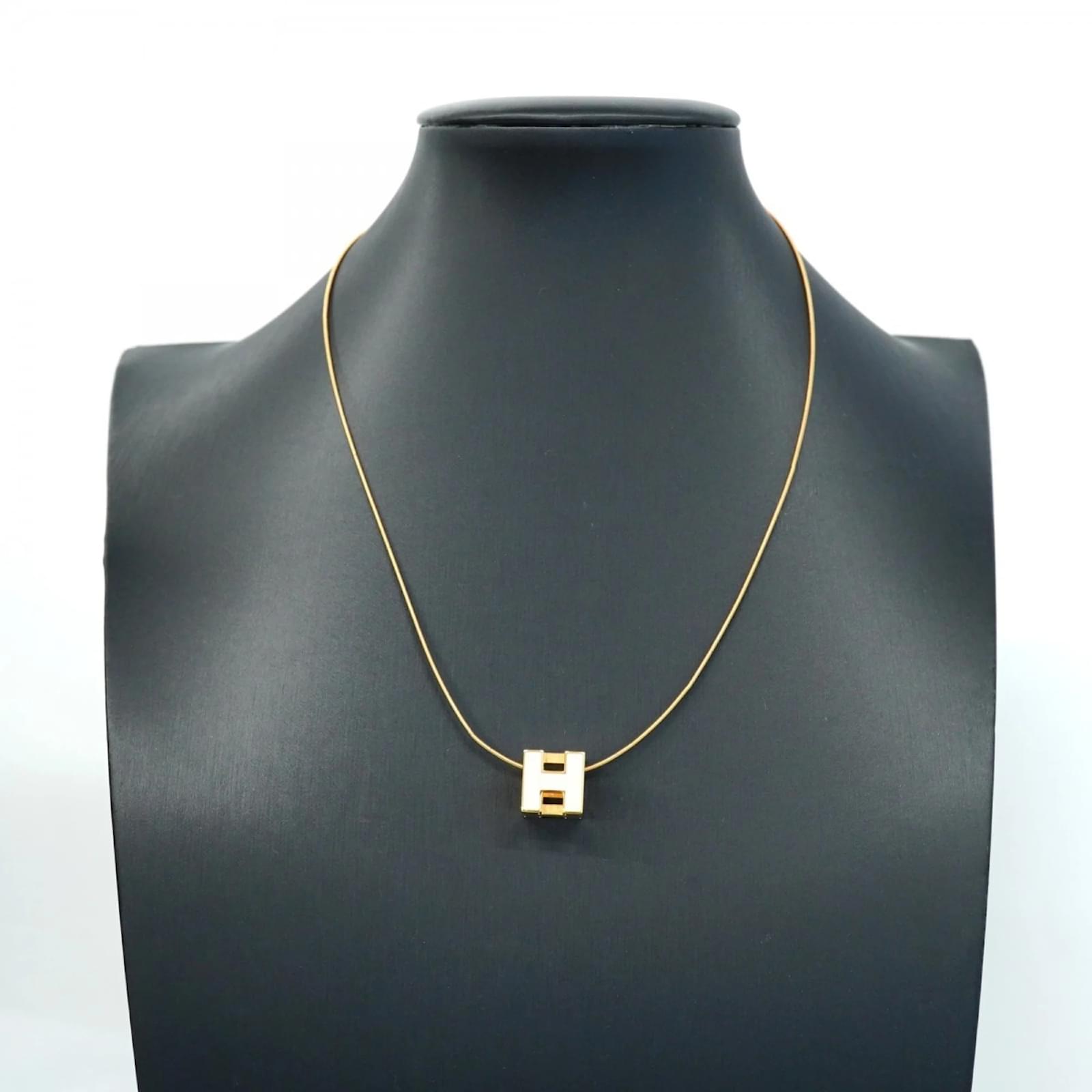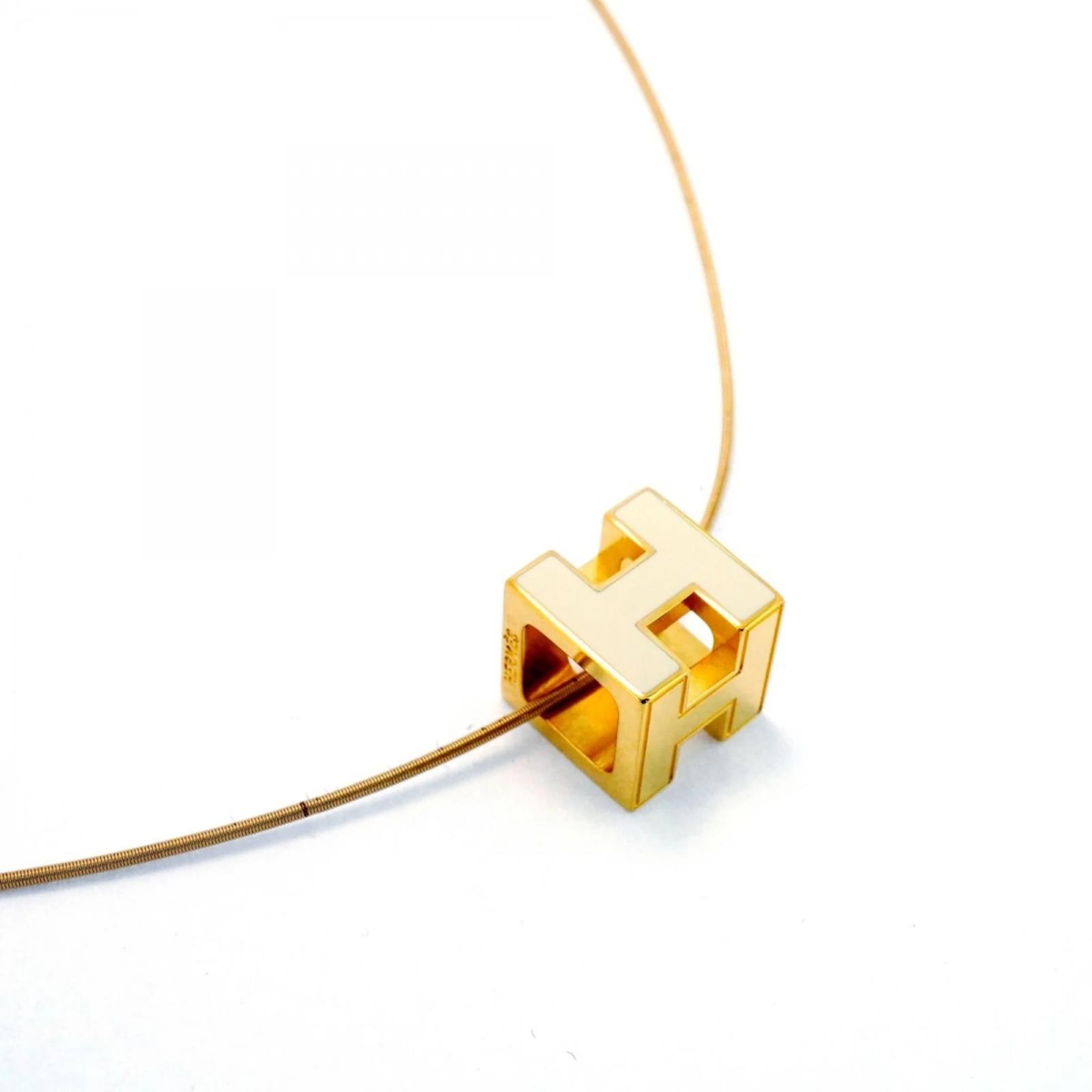 This Hermes necklace features a distinctive H Cube Cage design, crafted with gold plating and accented in white. The pendant measures 11.9mm x 11.9mm (0.46” x 0.46”), and the necklace has a circumference of 42.5 cm (16.73”). \n\nThe item is classified as used and is in good condition, with slight traces of usage, including minor scratches and dirt. It is important to review the provided images for a clear understanding of the item’s condition. No additional accessories are included with the necklace.