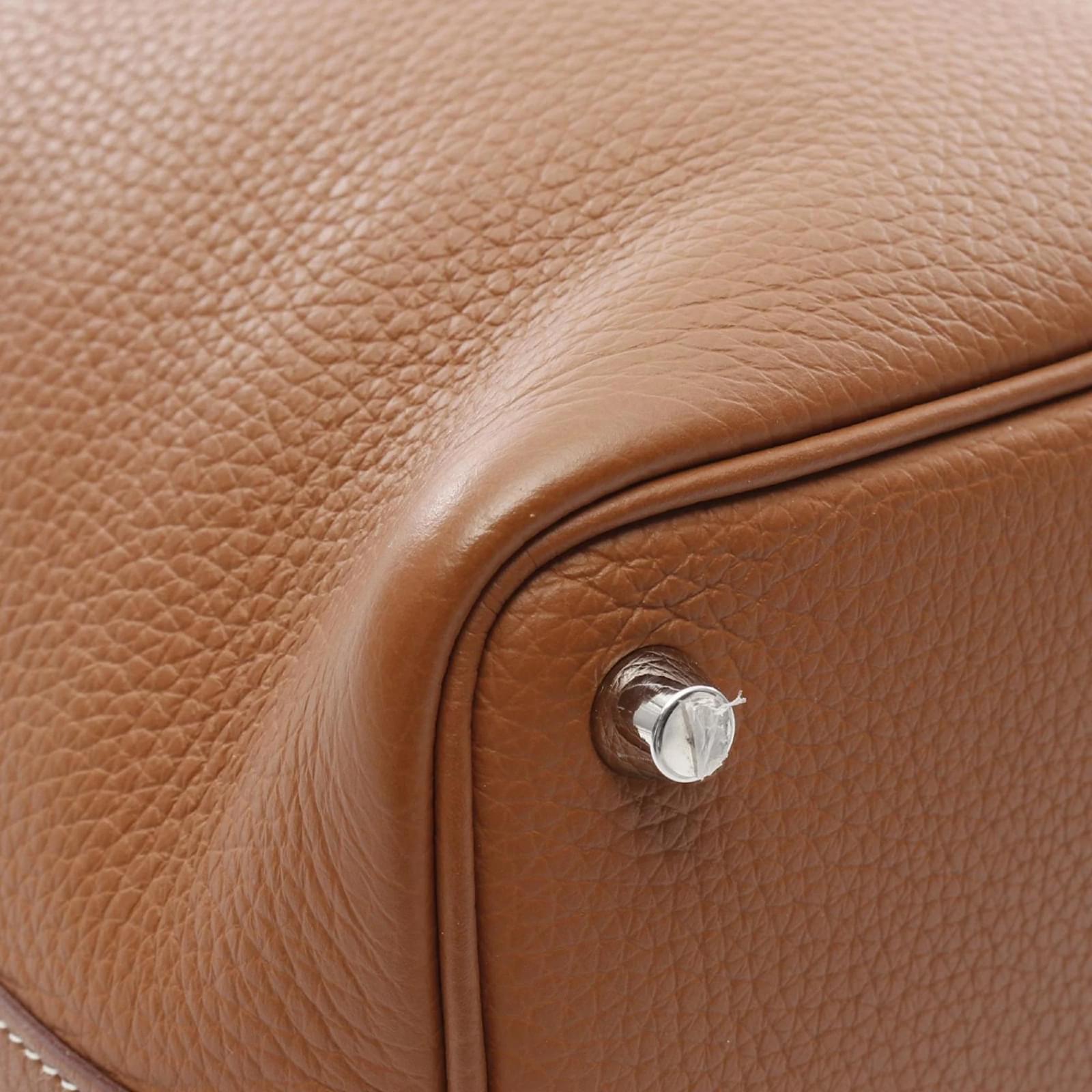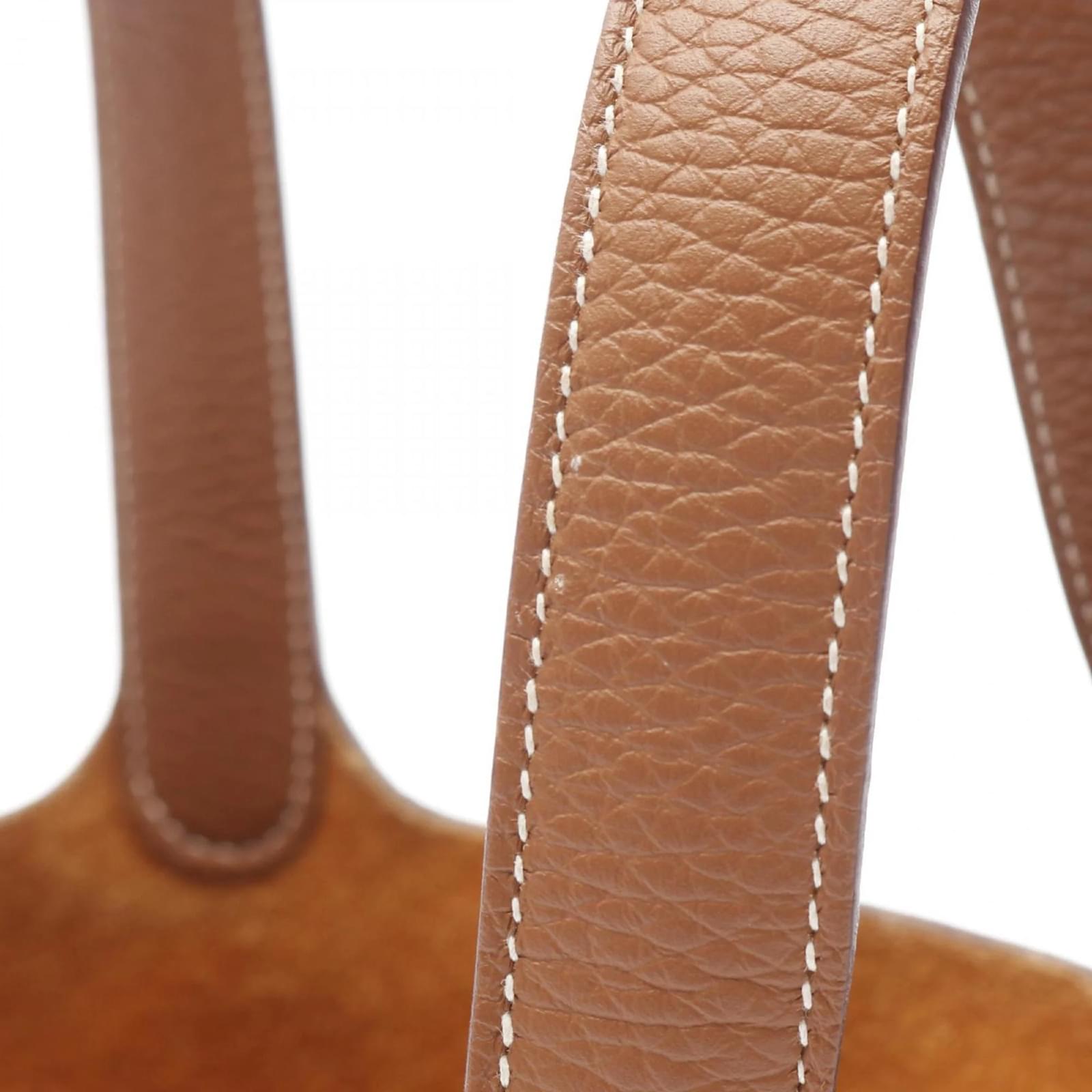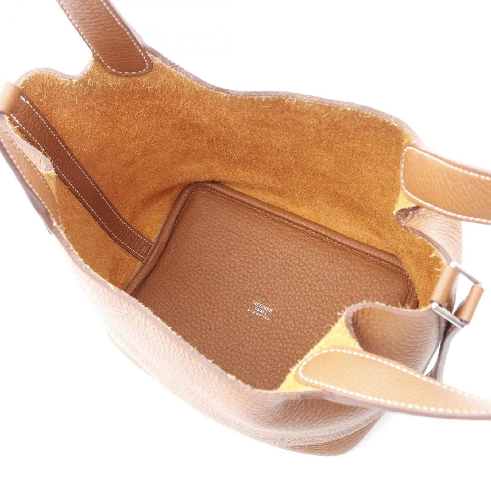 The Hermes Picotin PM Handbag is crafted from Taurillon clemence leather in a rich brown color. This handbag measures 18cm x 18cm x 13cm, making it a compact yet functional accessory. It is a pre-owned item in very good condition, classified as Rank A, with only slight traces of use, including minor scratches and dirt. The handbag comes with a key and padlock, and potential buyers are encouraged to review the images for a detailed view of its condition and included accessories.