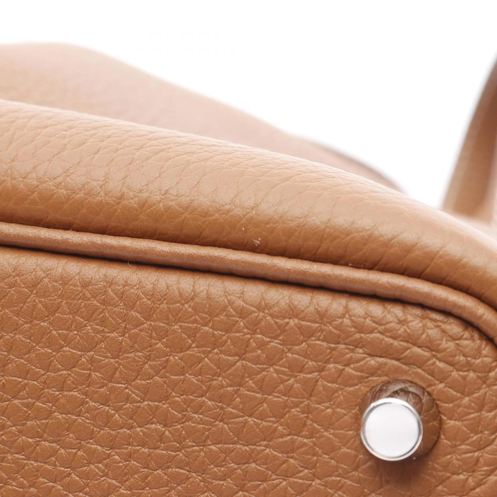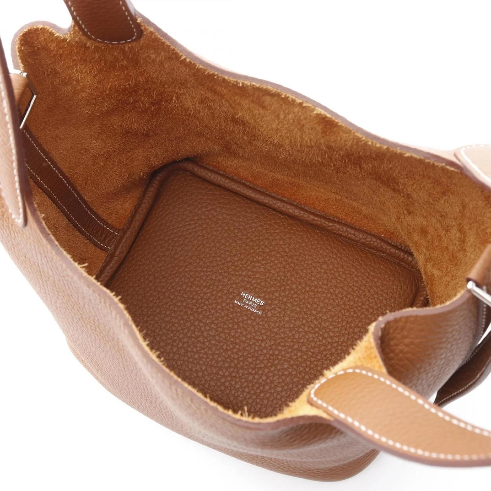 The Hermes Picotin PM Handbag is crafted from Taurillon clemence leather in a rich brown color. This handbag measures 18cm x 18cm x 13cm, making it a compact yet functional accessory. It is a pre-owned item in very good condition, classified as Rank A, with only slight traces of use, including minor scratches and dirt. The handbag comes with a key and padlock, and potential buyers are encouraged to review the images for a detailed view of its condition and included accessories.