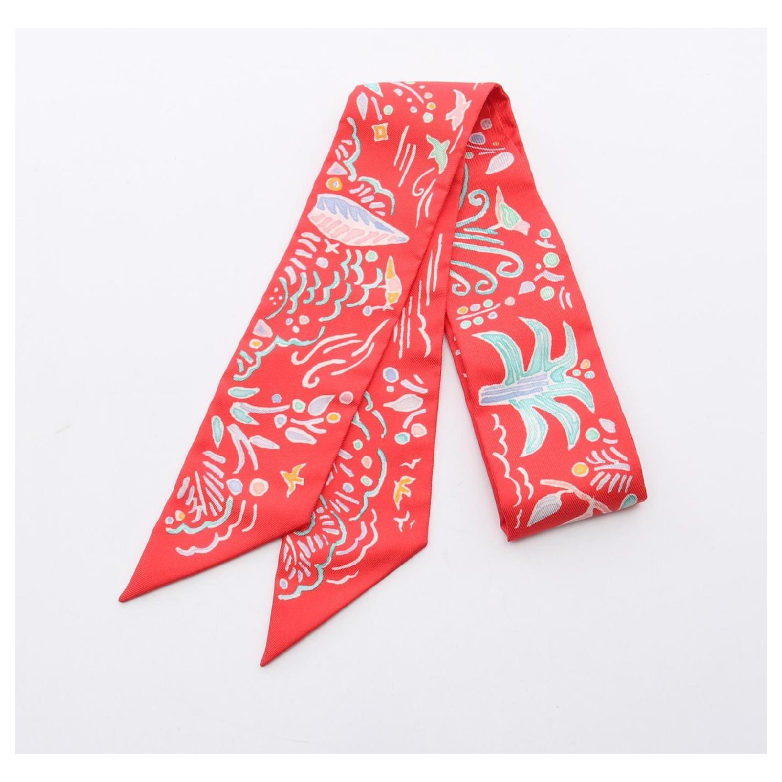 The Hermes Twilly Isola di Primavera scarf is a stylish accessory designed for women. Made from silk, this multi-colored scarf features a vibrant red hue and measures 85cm x 5cm (33.46” x 1.96”). It is part of the Hermes brand and belongs to the Twilly line. The item is in opened condition but has never been used, making it suitable for display. It comes with a box, and potential buyers are encouraged to review the images for a clear understanding of the item’s condition and included accessories.