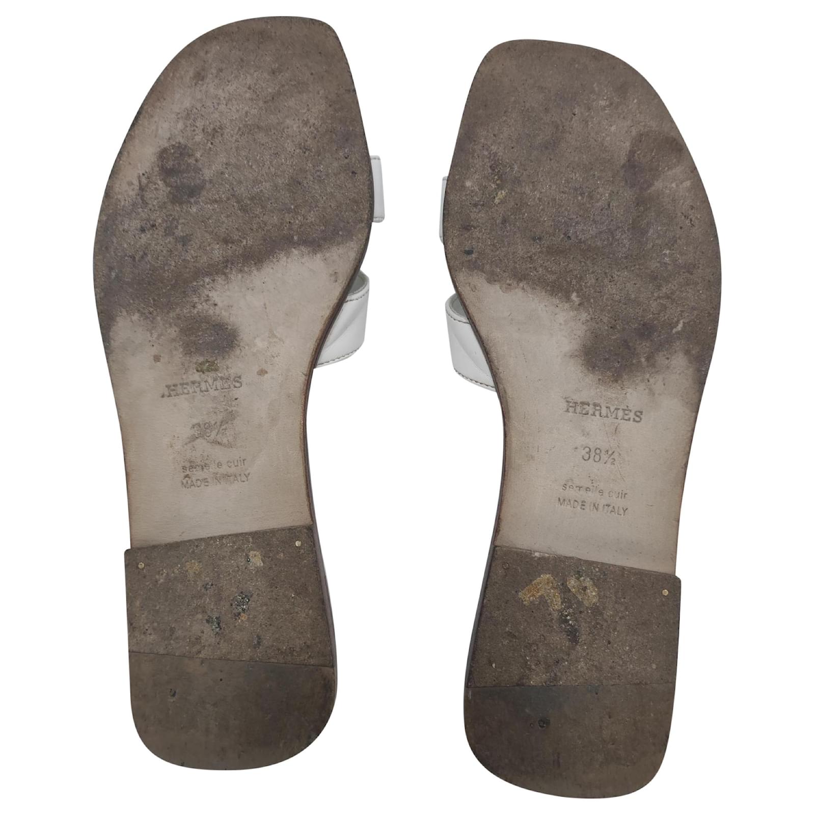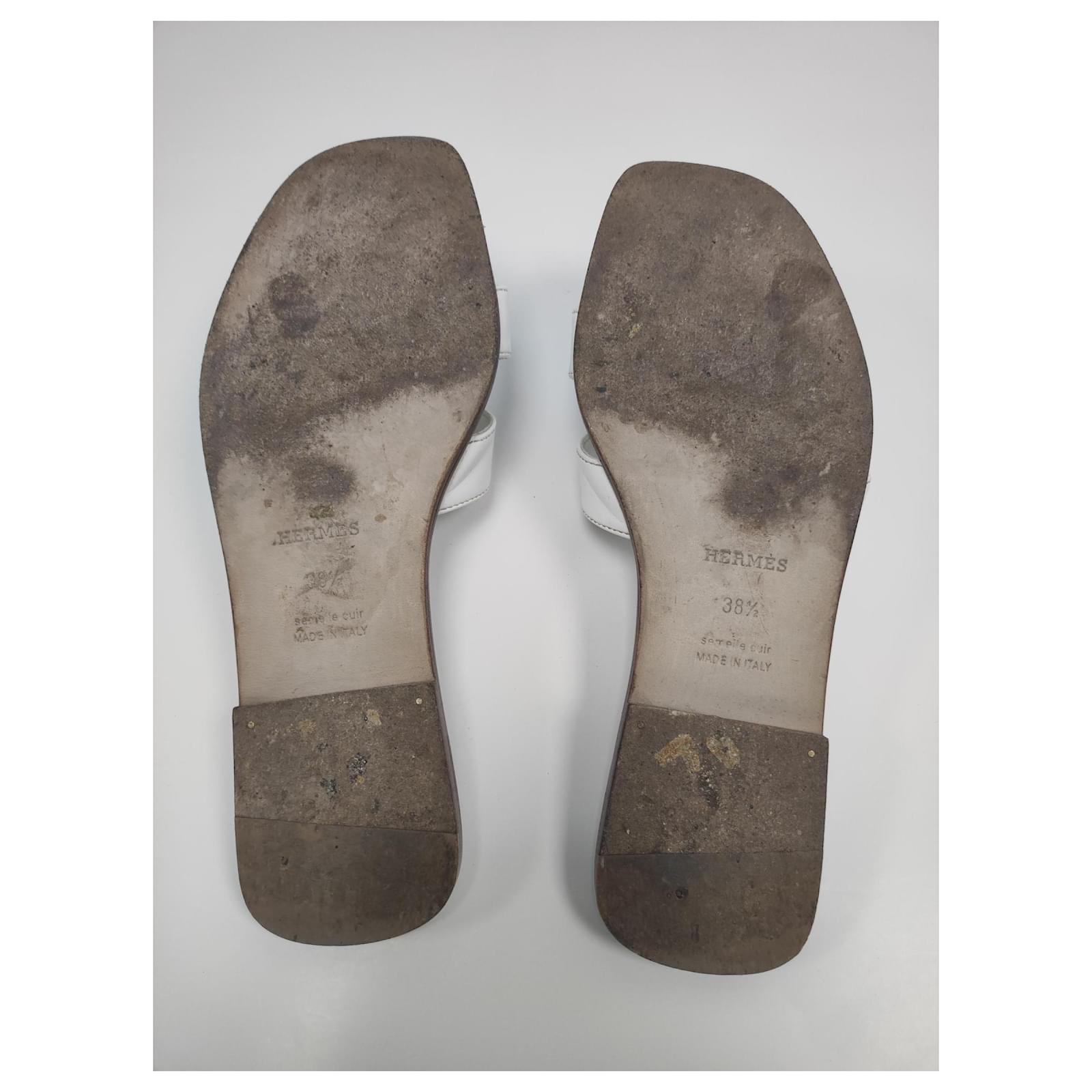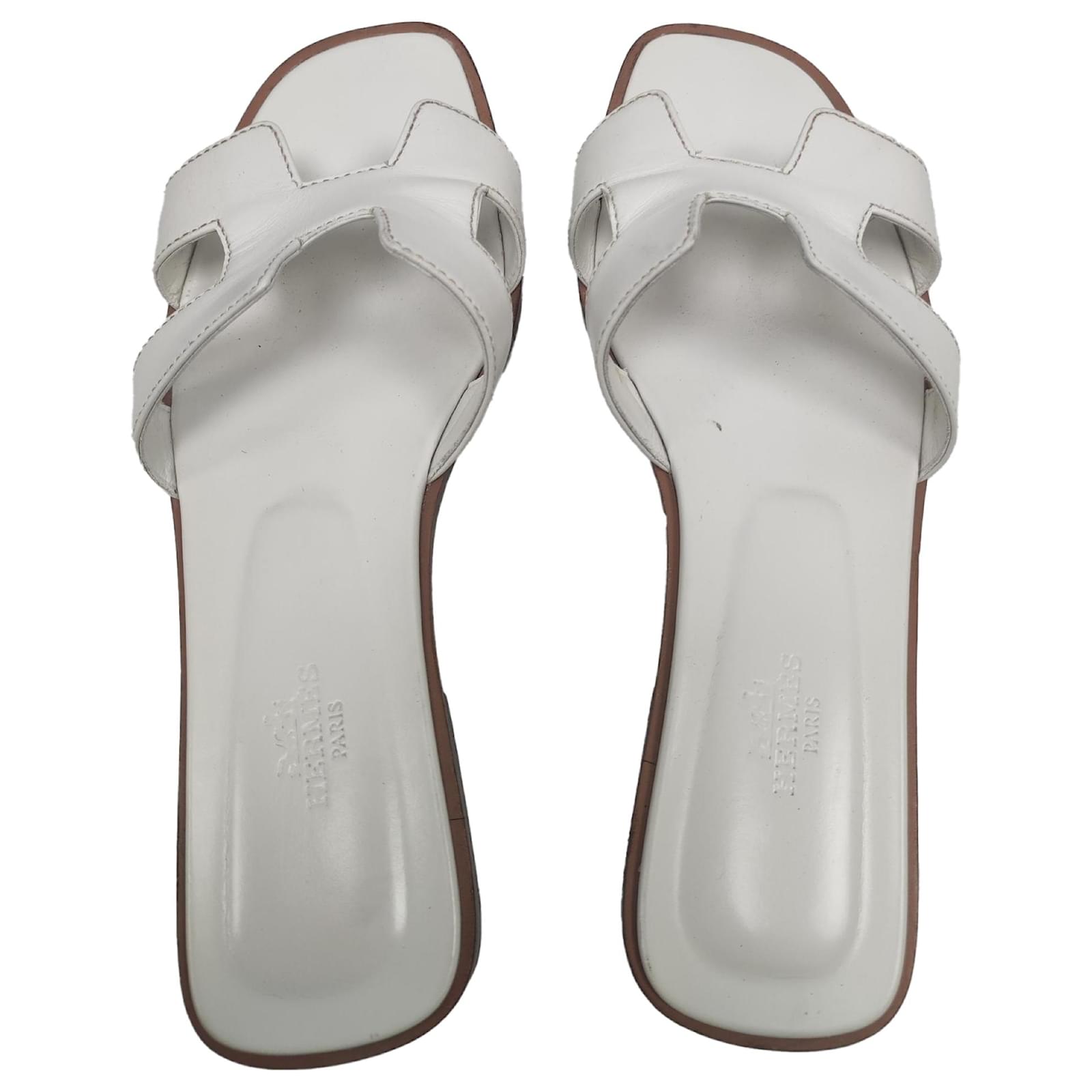 The Hermès Oran Flat Slides in White Leather are a true celebration of timeless design and understated elegance. With their signature \”H\” cut-out and luxurious calfskin leather, these sandals embody the heritage and refinement of the Hermès maison. The fresh white hue adds a clean, contemporary feel that elevates even the simplest outfit.\n\n\nwith Dust bag\nHermès Oran Flat Slides in White Leather\nCondition: Good\nSigns of wear: Moderate signs of wear or markings, moderate scuffing insoles., Used but well maintained. Moderate creasing and marks at surface, wear at soles or replaced soles.\nPackaging: Dust bag\nColor: White |\nMaterial: Leather | leather\nSize: EU | 38.5\nMeasurements: Insole length: 250\nSKU: MUSEPUAESH474211W \n Product Id: 474211 \n