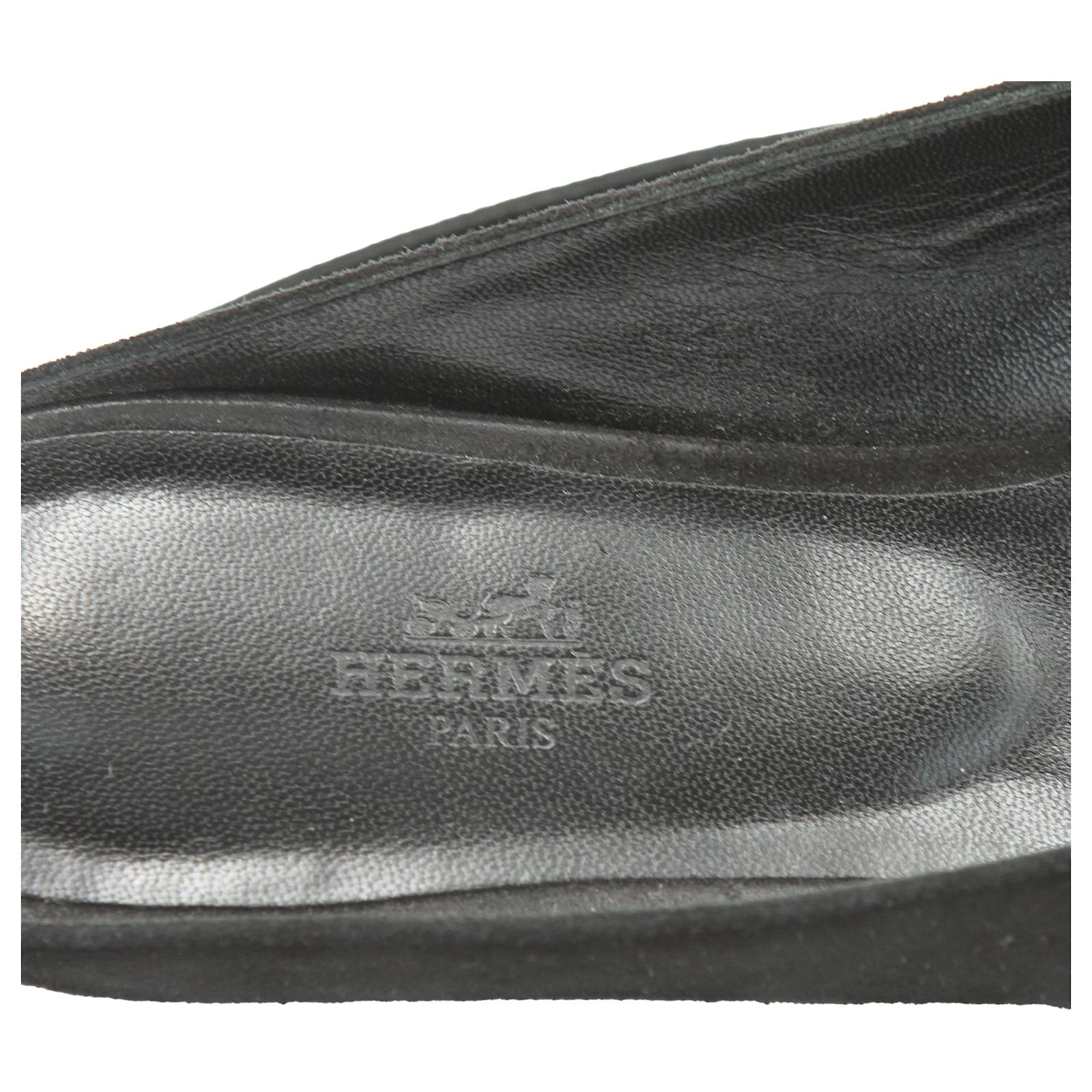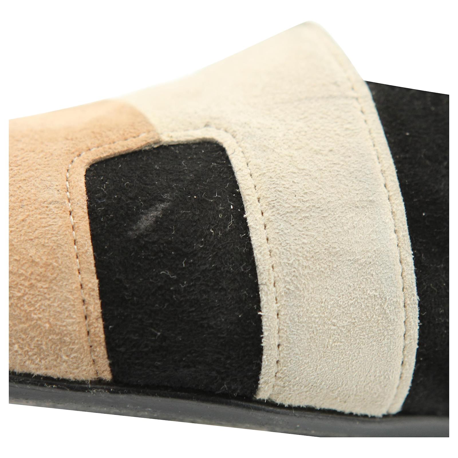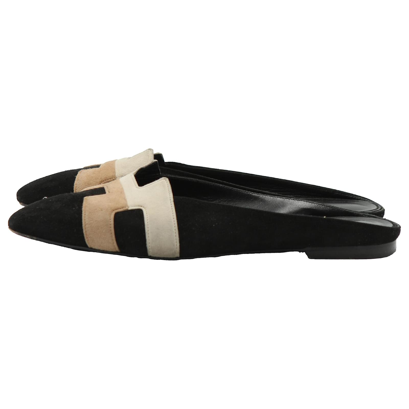HERMES Tricolor Suede Roxane Flat Mules in Suede.\nBlack suede leather upper with contrast beige and tan H logo.\nHeel height : 1 cm.\nSize: EU 39.\nCondition: Very good condition.\nDetails: Marks and scuffs. Lightly wearing.\nOriginal Packaging: With dust bag.\nIN: 2020250.\n38691YH \n Product Id: 466793 \n