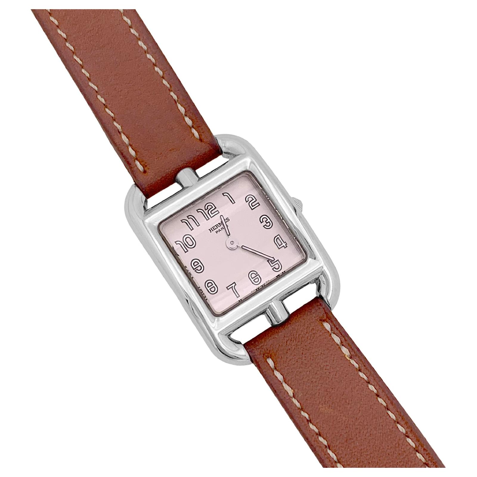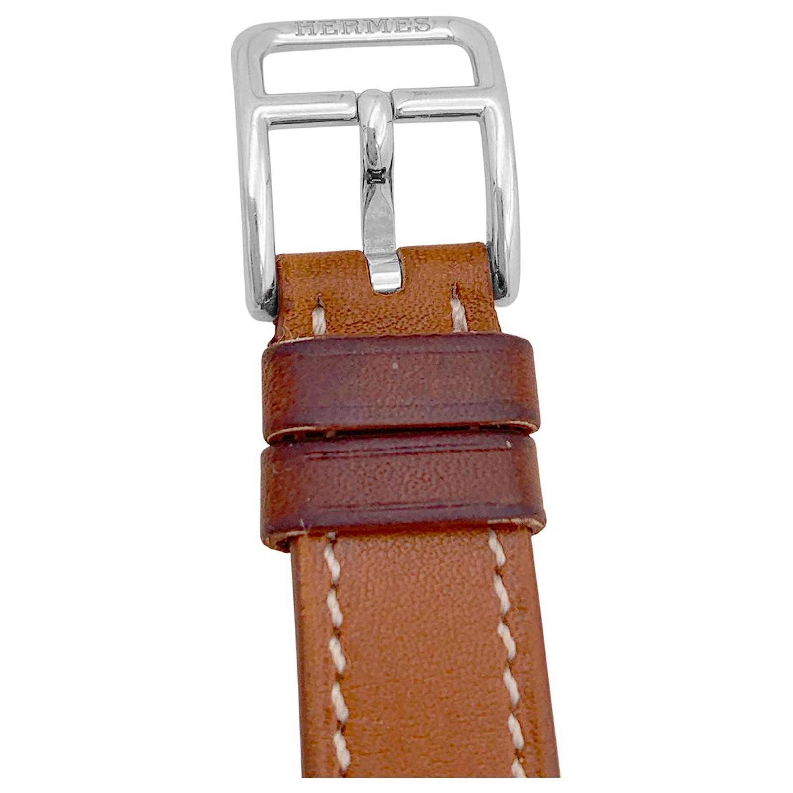 A watch signed by the House of Hermès, ‘Cape Cod’ collection, in steel on a double tour leather strap. Silver opaline dial, silver Arabic numerals.\nSmall model.