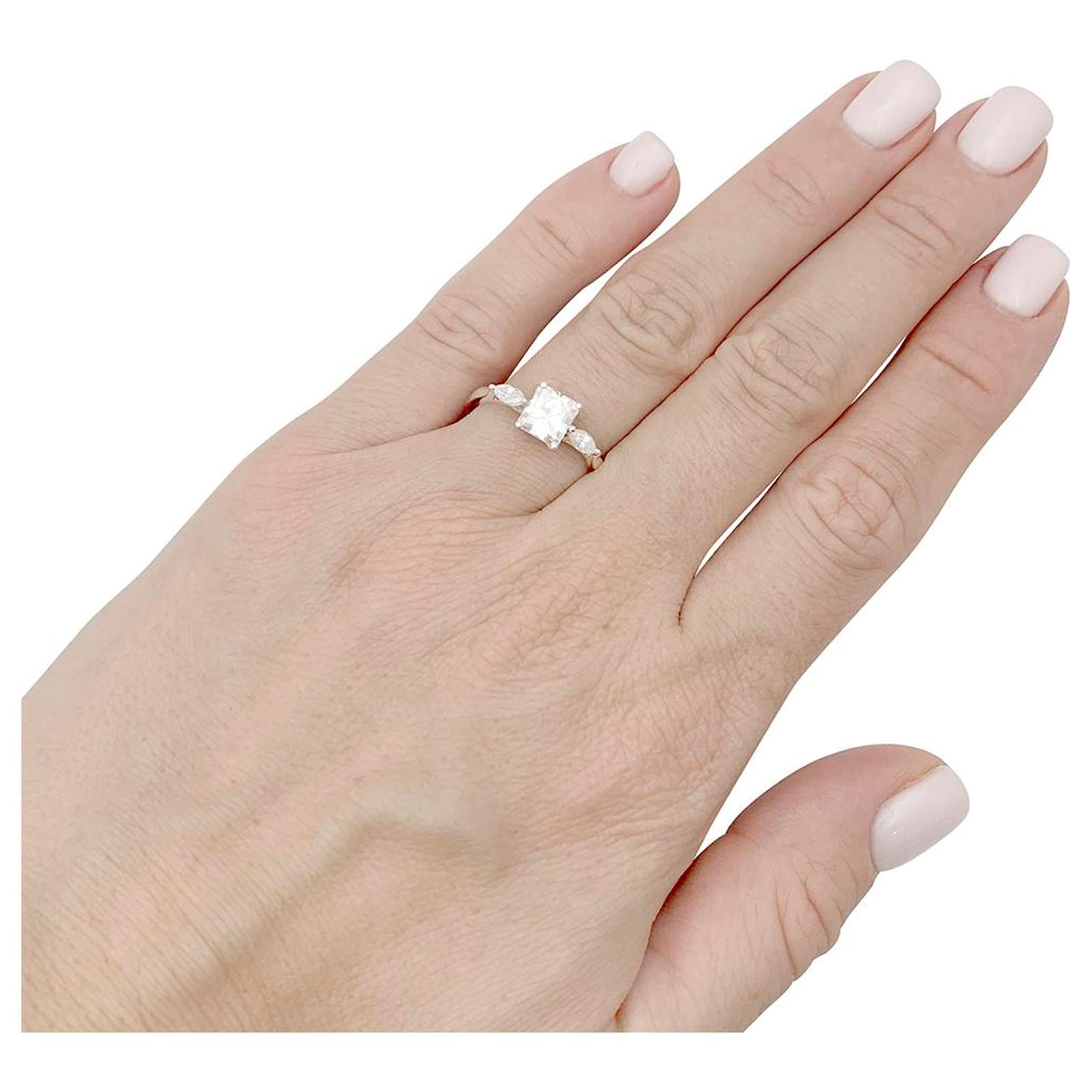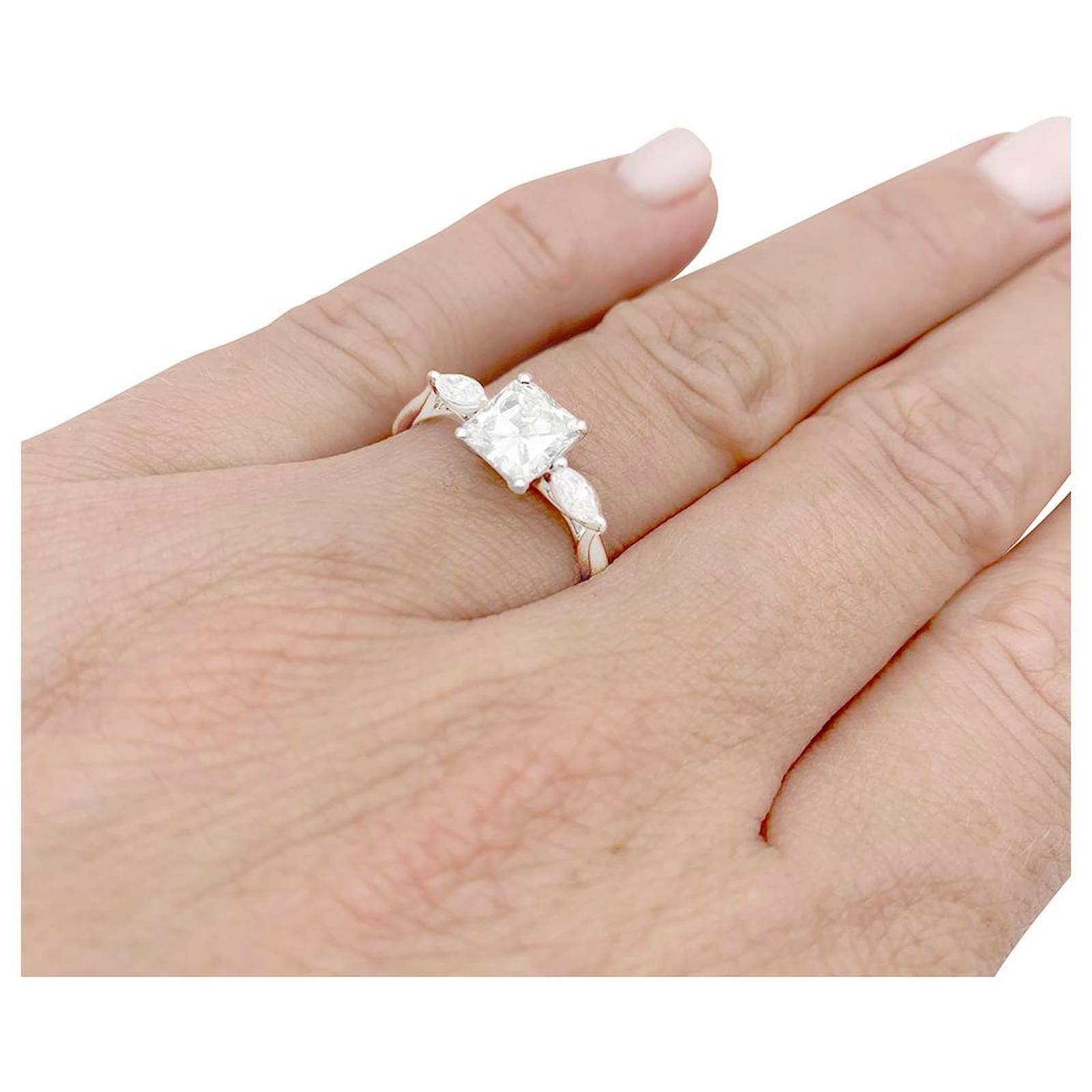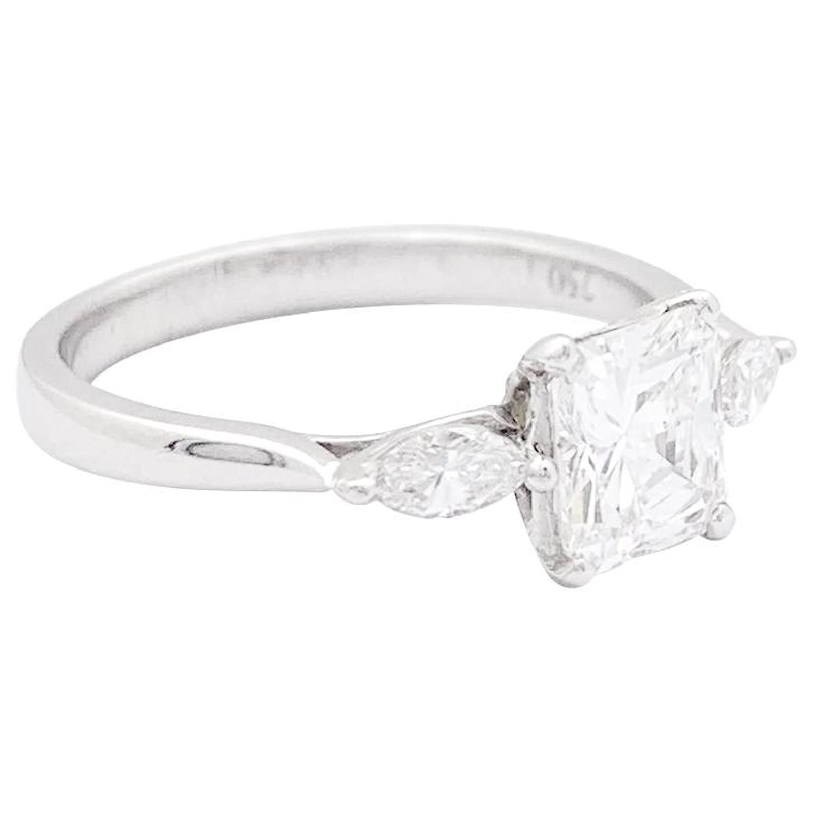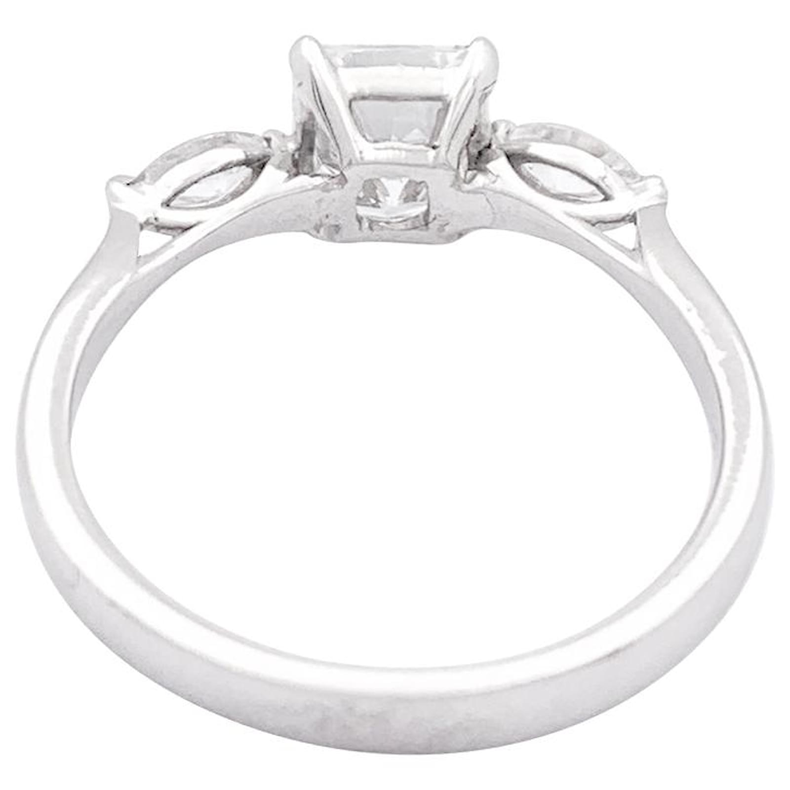 A white gold ring 750/000, set with a central octagonal diamond of 1,08 carat, shouldered with two marquise diamonds 0,23 carat in total.\nGubelin certificate : E/VS1\n\nLargeur : 6 mm\nWeight: 2,8 grams\nDiamond weight : 1,31 carat in total\nturn of a finger : 53