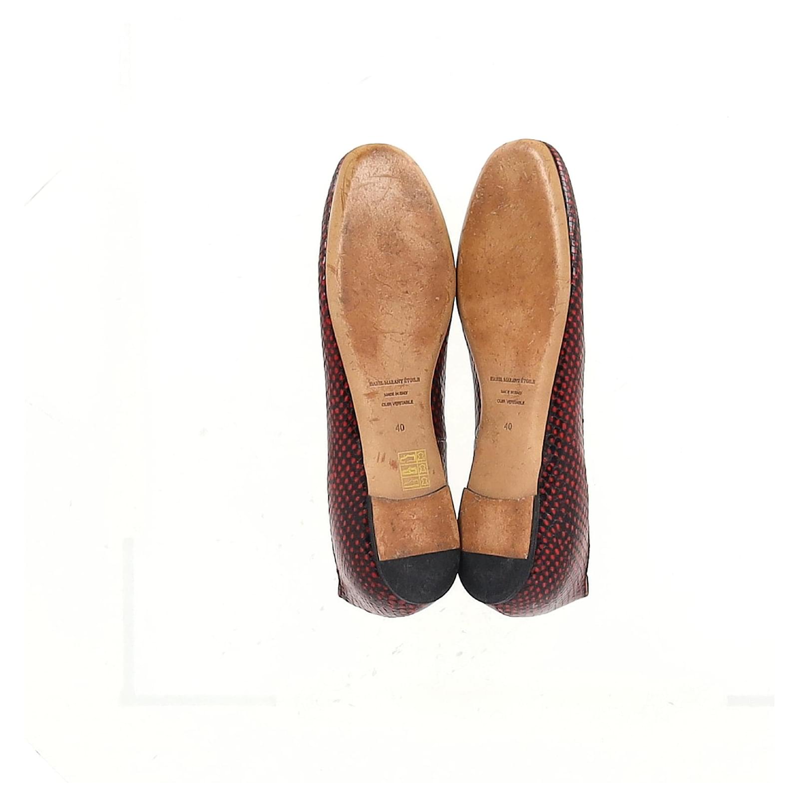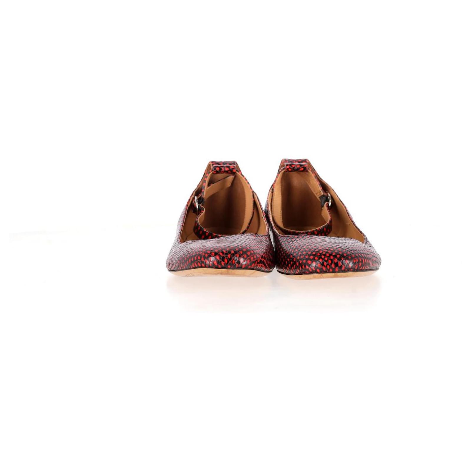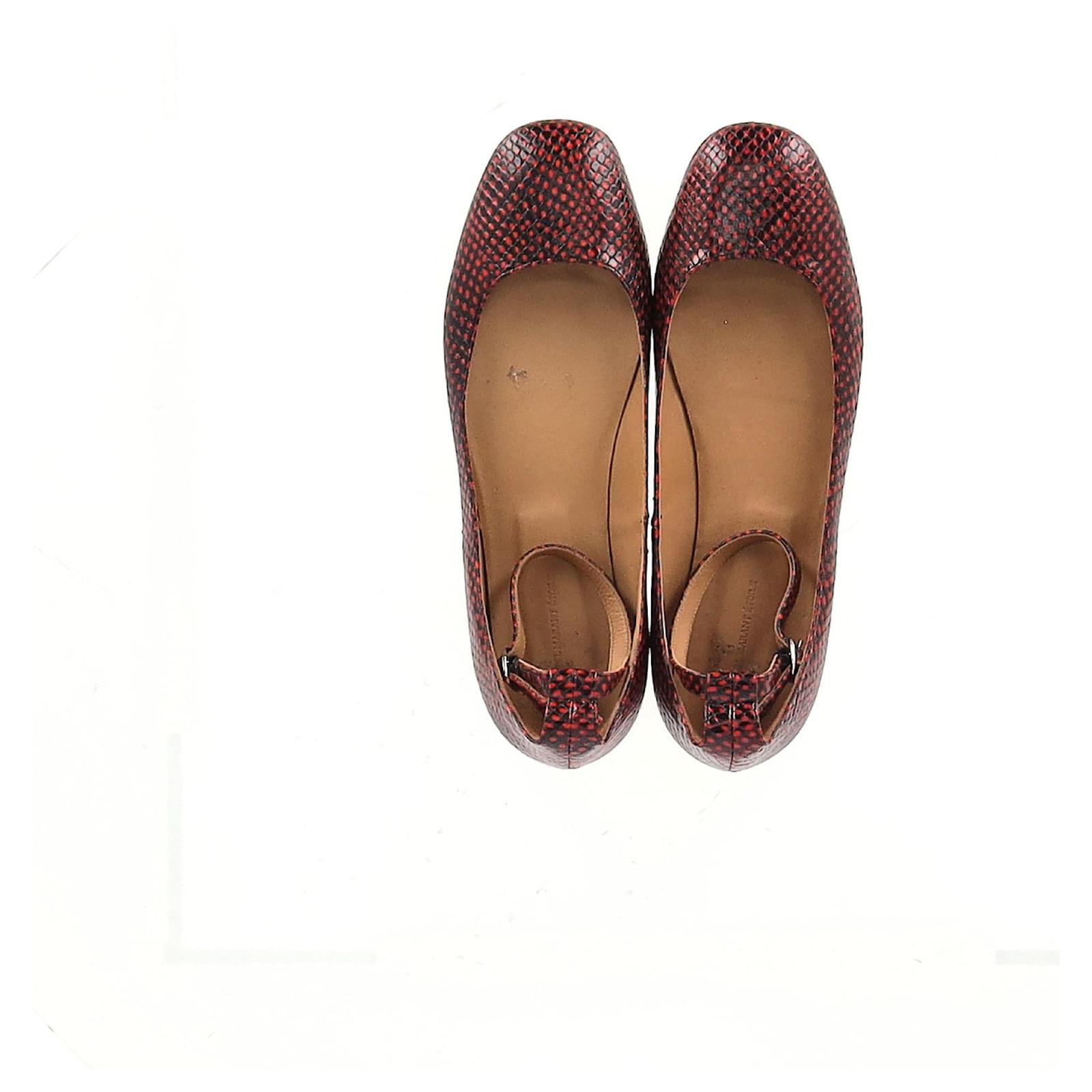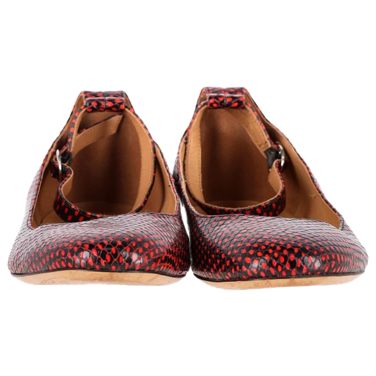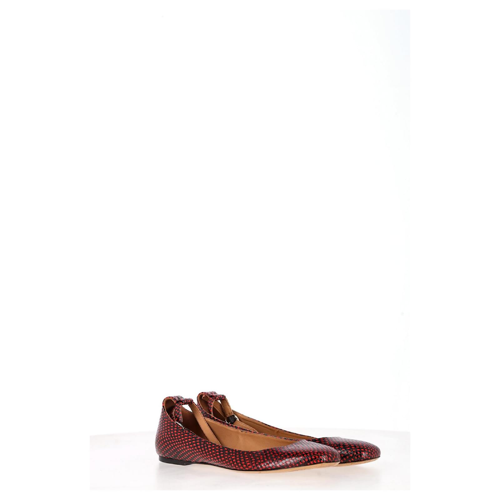 Strike the perfect balance between fierce and feminine with the Lili Ballet Flats from Isabel Marant Étoile. Crafted from red and black calf leather with a python-effect finish, these statement flats feature a modern square toe, dotted texture, and a sleek ankle strap with side buckle fastening. A subtle flat heel and slip-on ease make them as wearable as they are striking—ideal for those who love their everyday with an edge.\n\n\nIsabel Marant Etoile Lili Python-Effect Ballet Flats in Red Leather\nCondition: Very good\nSigns of wear: Minor markings, Lightly used but very well maintained. Minor mark at soles & creasing, light scuffing at the soles and heels.\nPackaging: Dust bag\nColor: Red \nMaterial: Leather\nSize: EU | 40\nMeasurements: Insole length: 260\nSKU: NAPPUGBSH480238W \n Product Id: 480238 \n