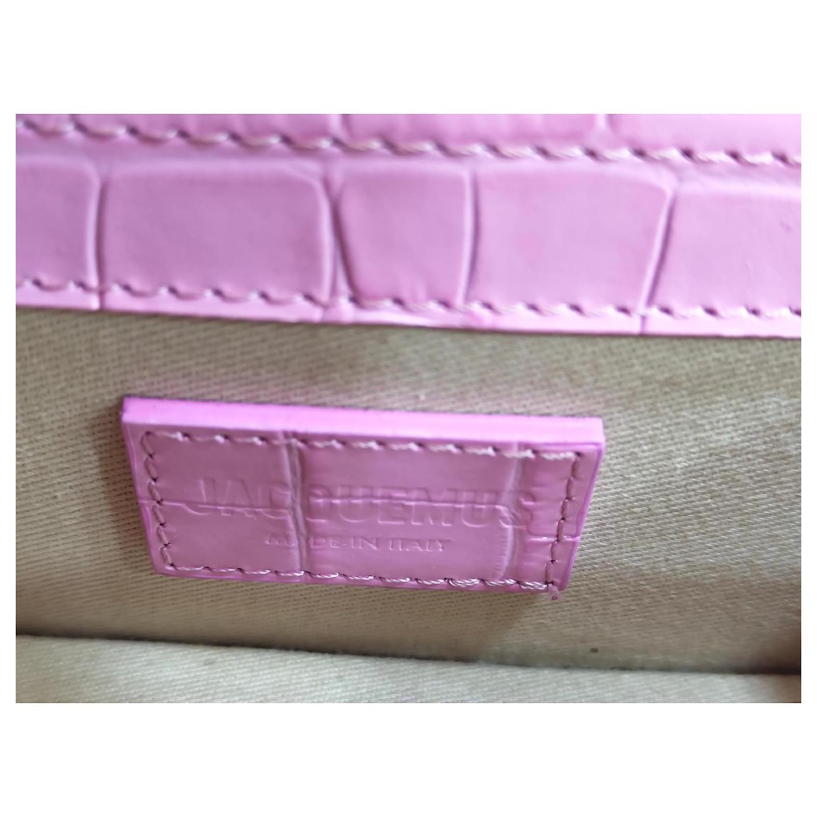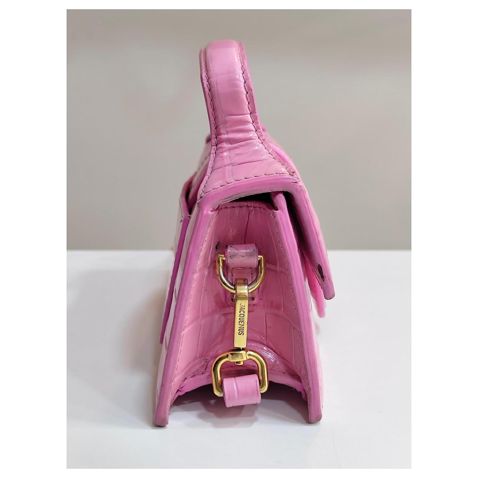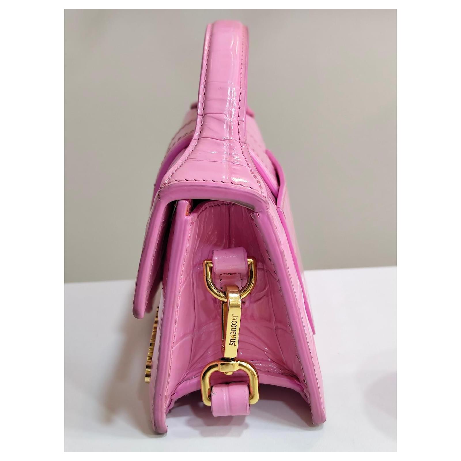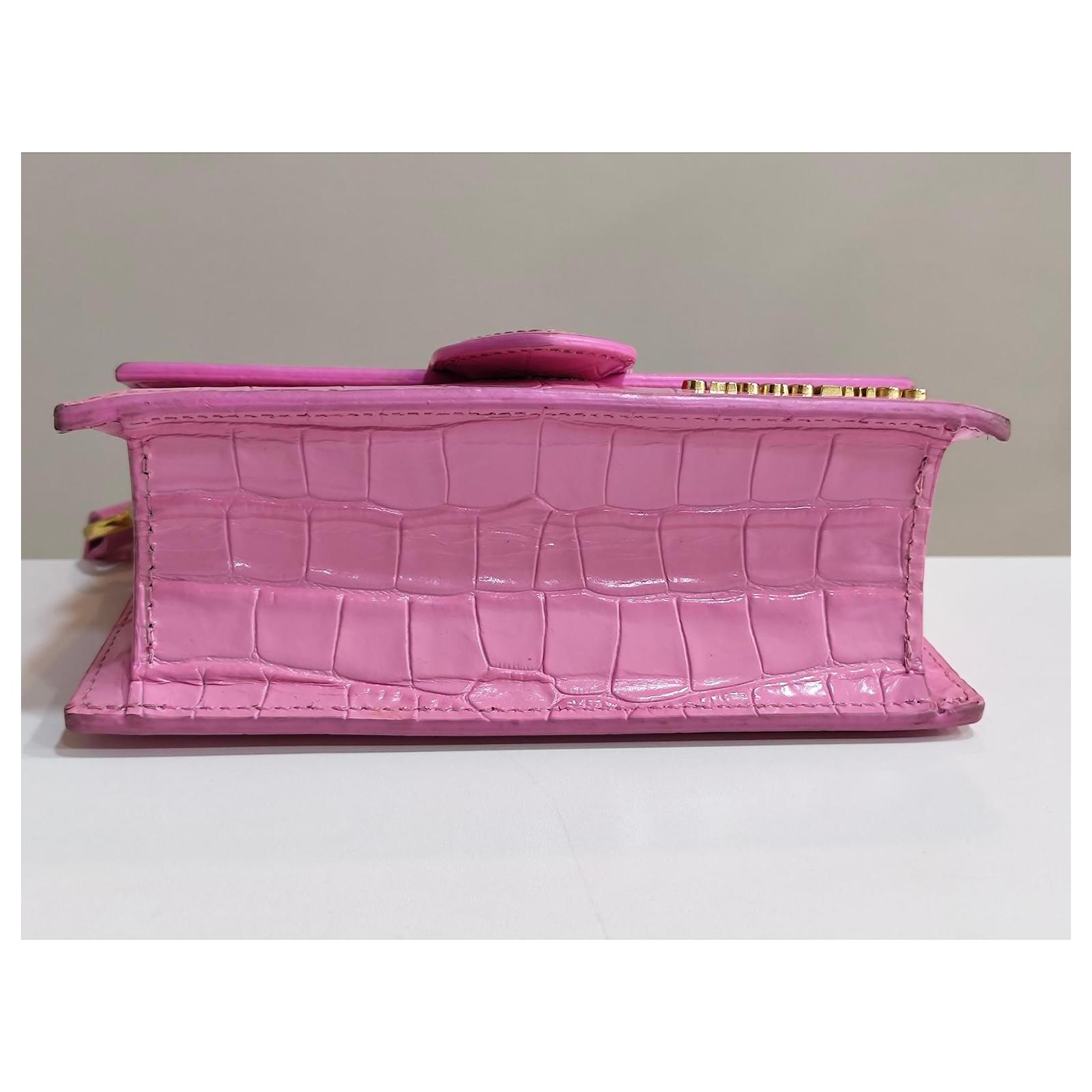 Jacquemus Mini Chiquito Bag\n\n Description: \”Le Chiquito\” bag in pink patent leather with crocodile effect. Compact and elegant, can be carried by hand or crossbody thanks to its removable shoulder strap. Gold Jacquemus branding.\n\n Condition: Very good condition, delivered with original dustbag.\n\n Dimensions: L 18 x H 9 x D 6 cm