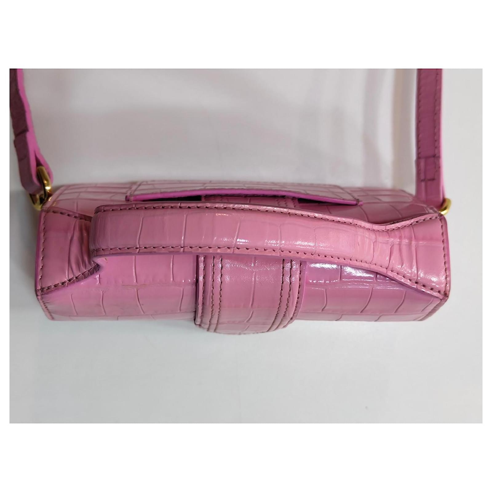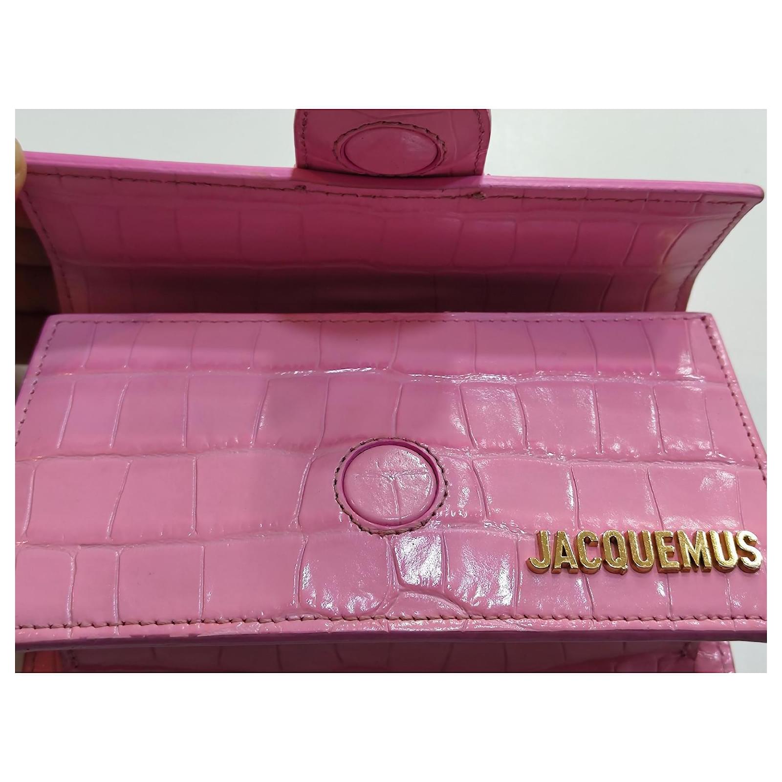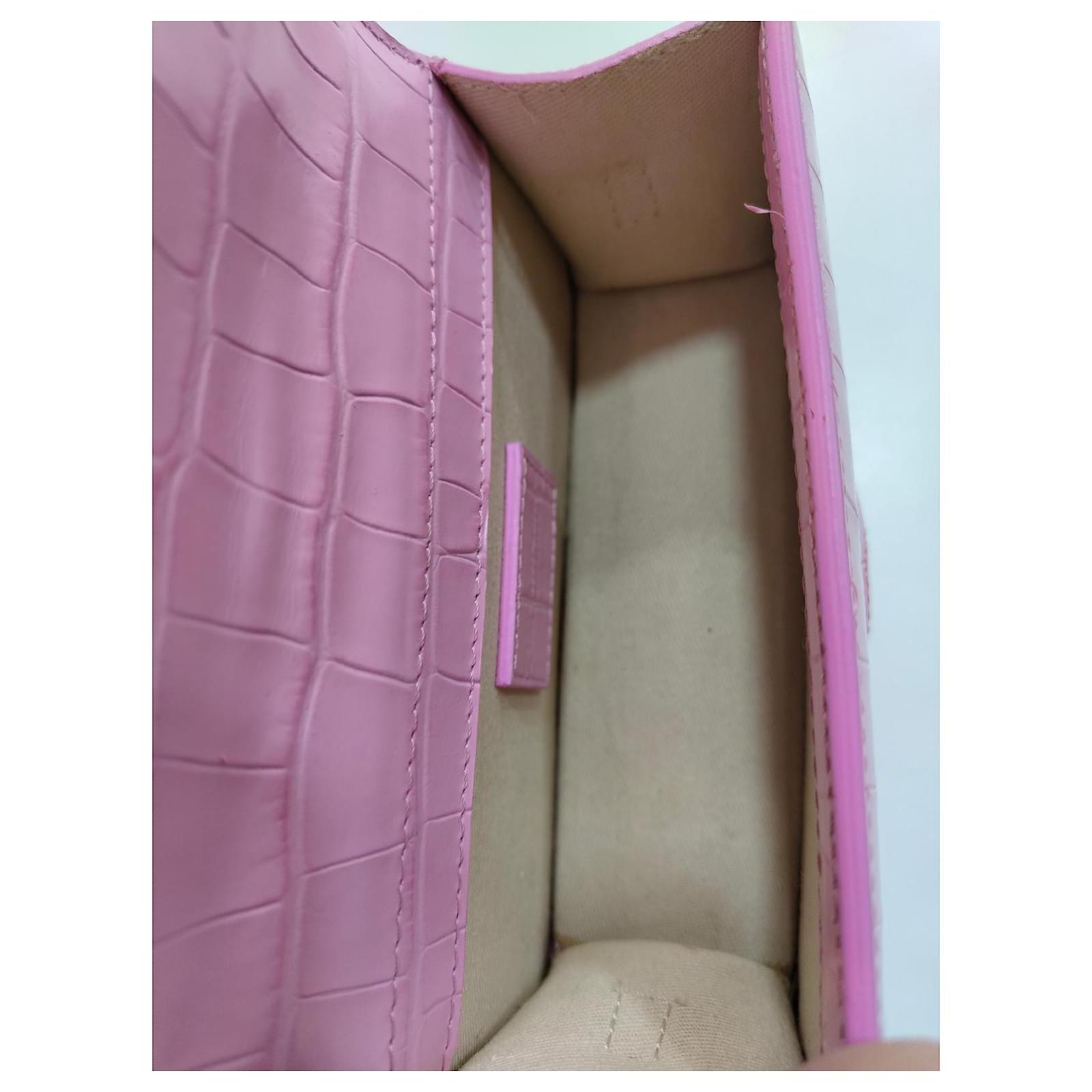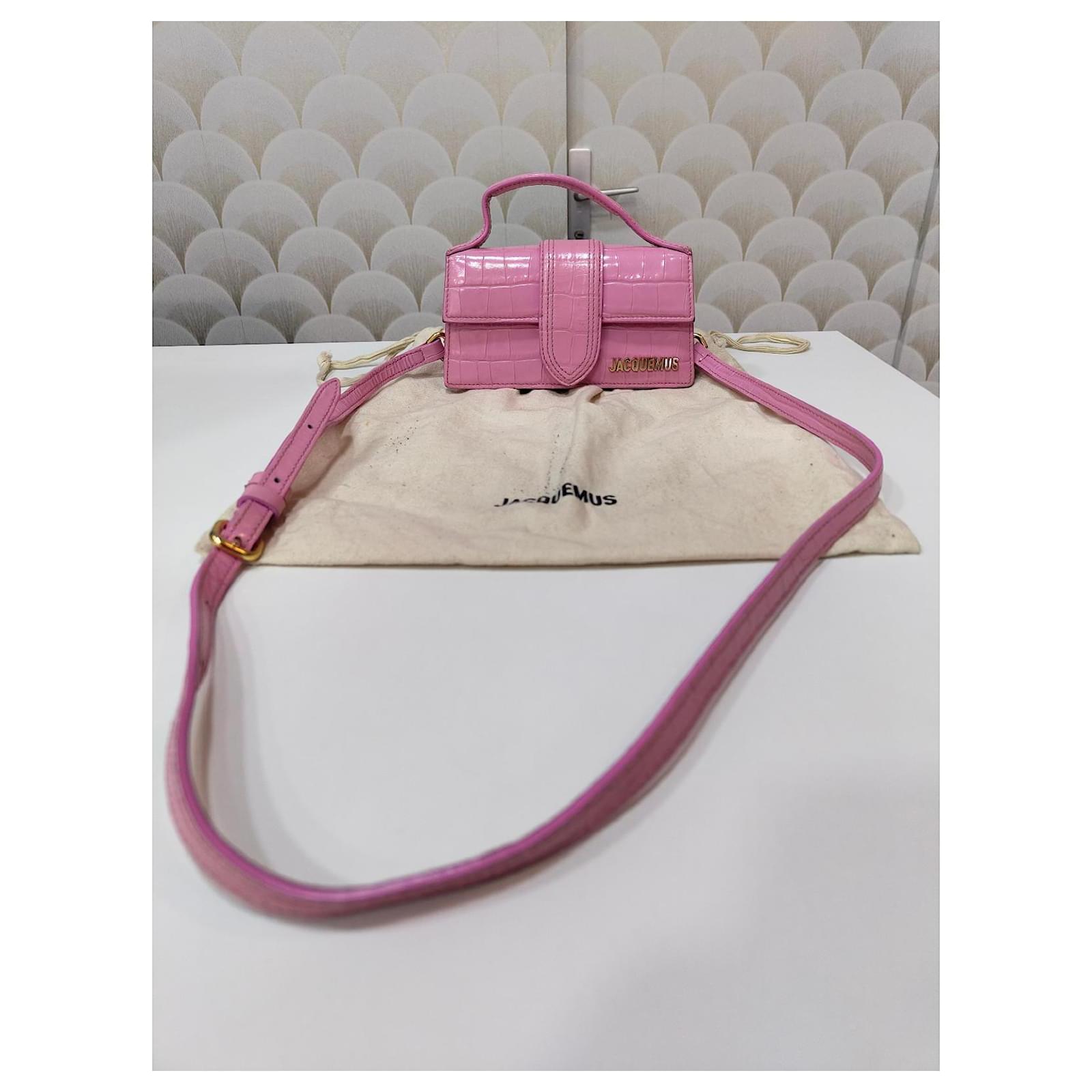Jacquemus Mini Chiquito Bag\n\n Description: \”Le Chiquito\” bag in pink patent leather with crocodile effect. Compact and elegant, can be carried by hand or crossbody thanks to its removable shoulder strap. Gold Jacquemus branding.\n\n Condition: Very good condition, delivered with original dustbag.\n\n Dimensions: L 18 x H 9 x D 6 cm