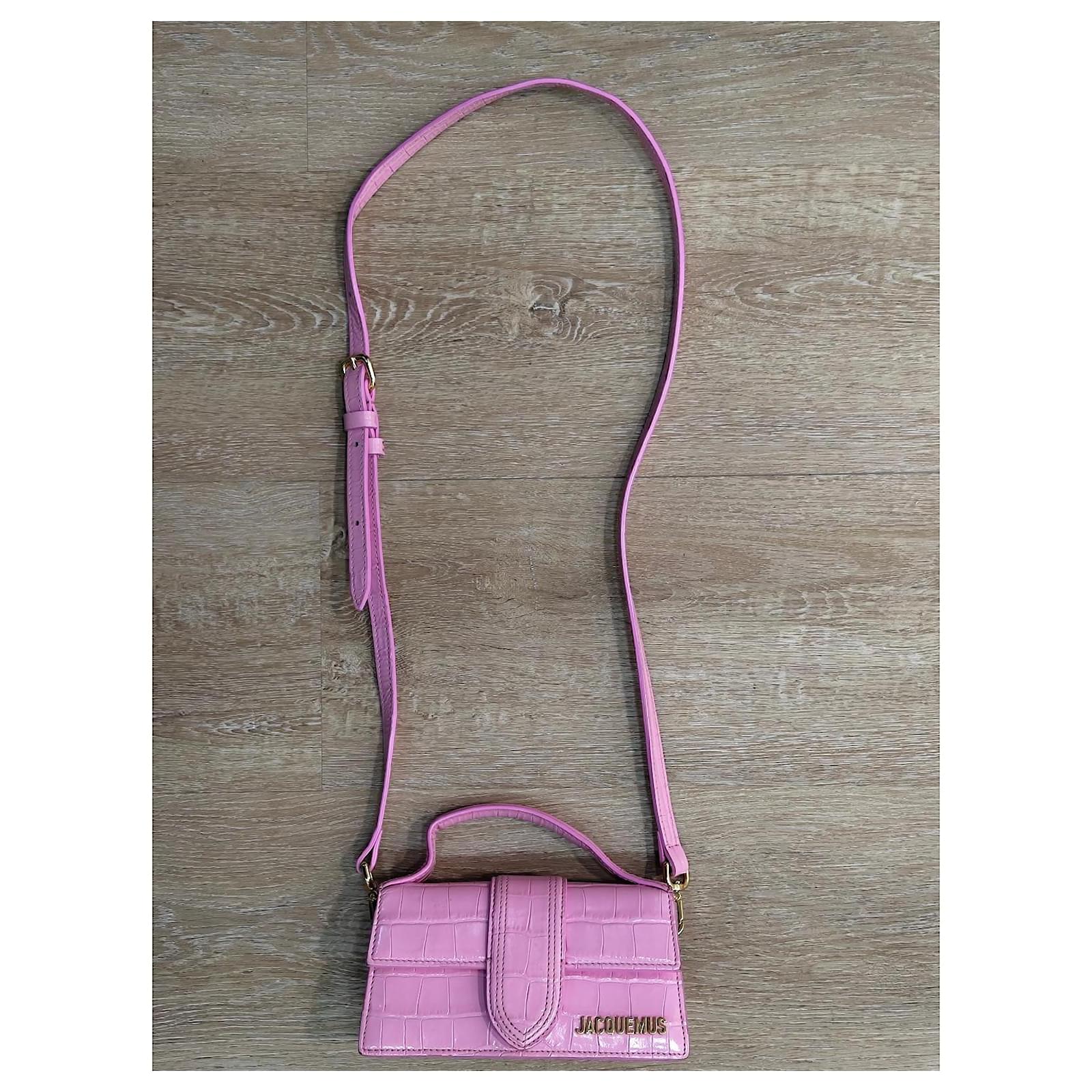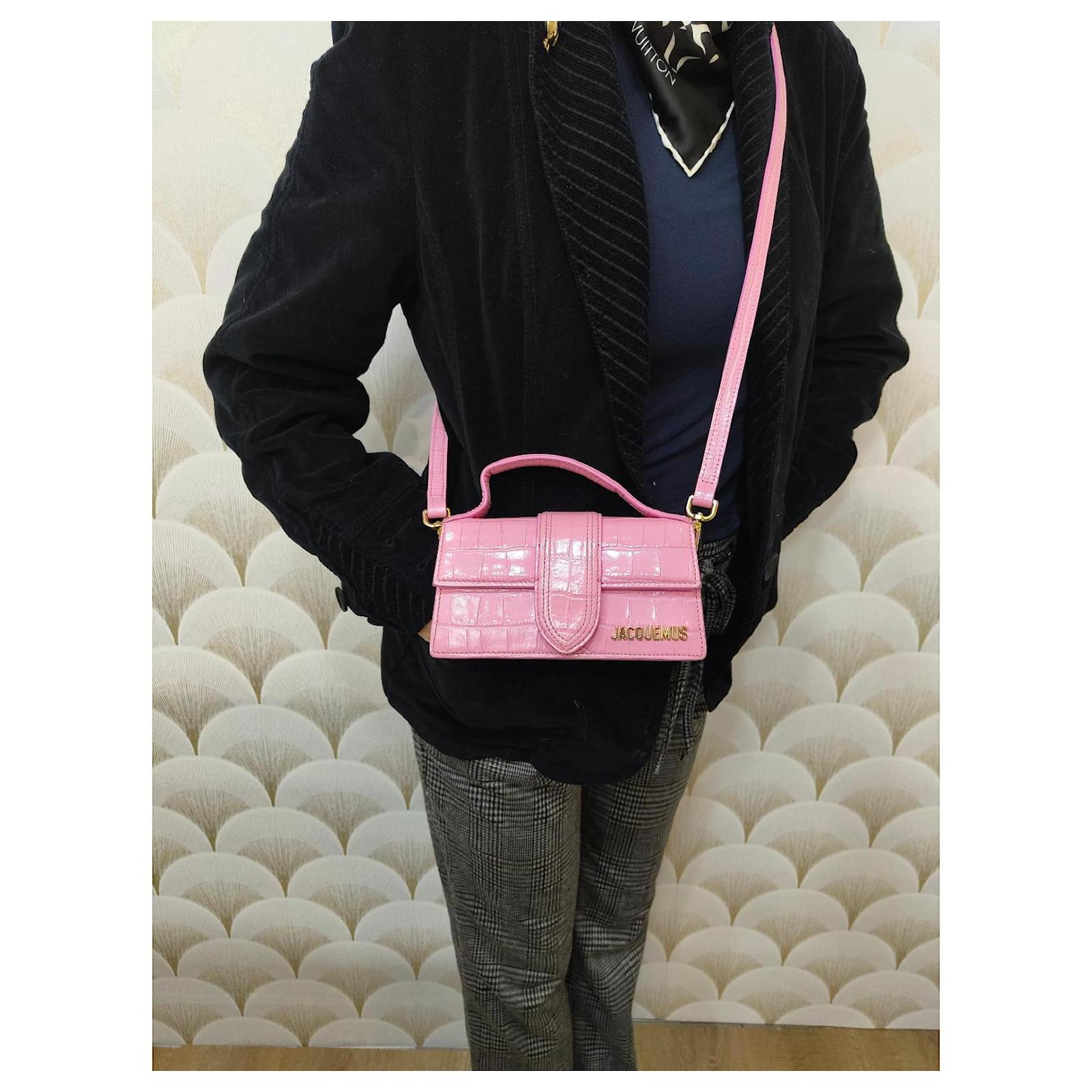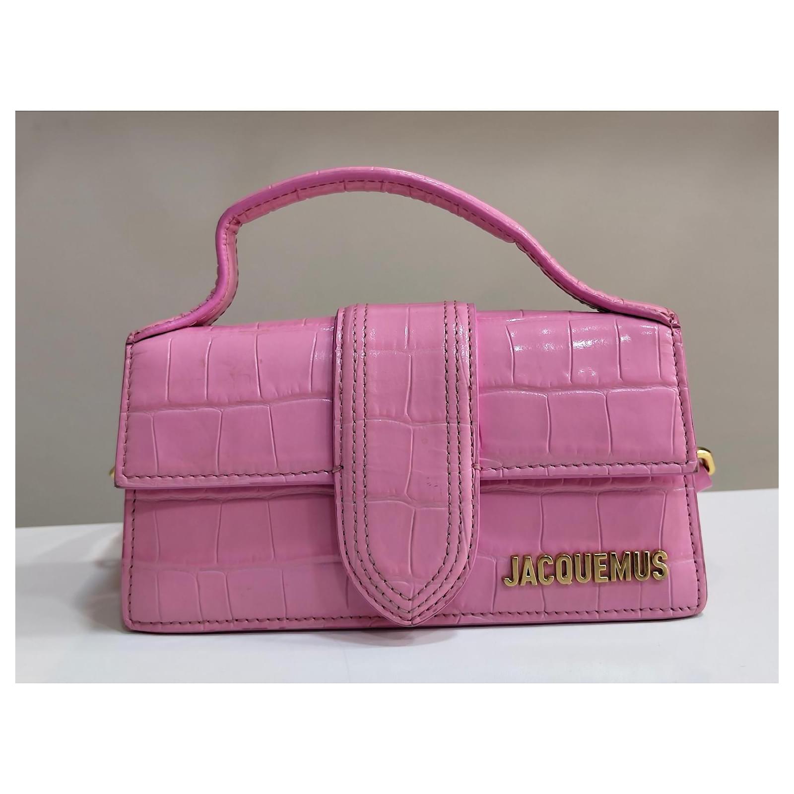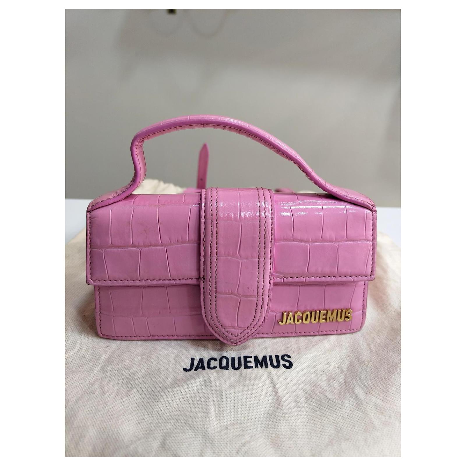 Jacquemus Mini Chiquito Bag\n\n Description: \”Le Chiquito\” bag in pink patent leather with crocodile effect. Compact and elegant, can be carried by hand or crossbody thanks to its removable shoulder strap. Gold Jacquemus branding.\n\n Condition: Very good condition, delivered with original dustbag.\n\n Dimensions: L 18 x H 9 x D 6 cm