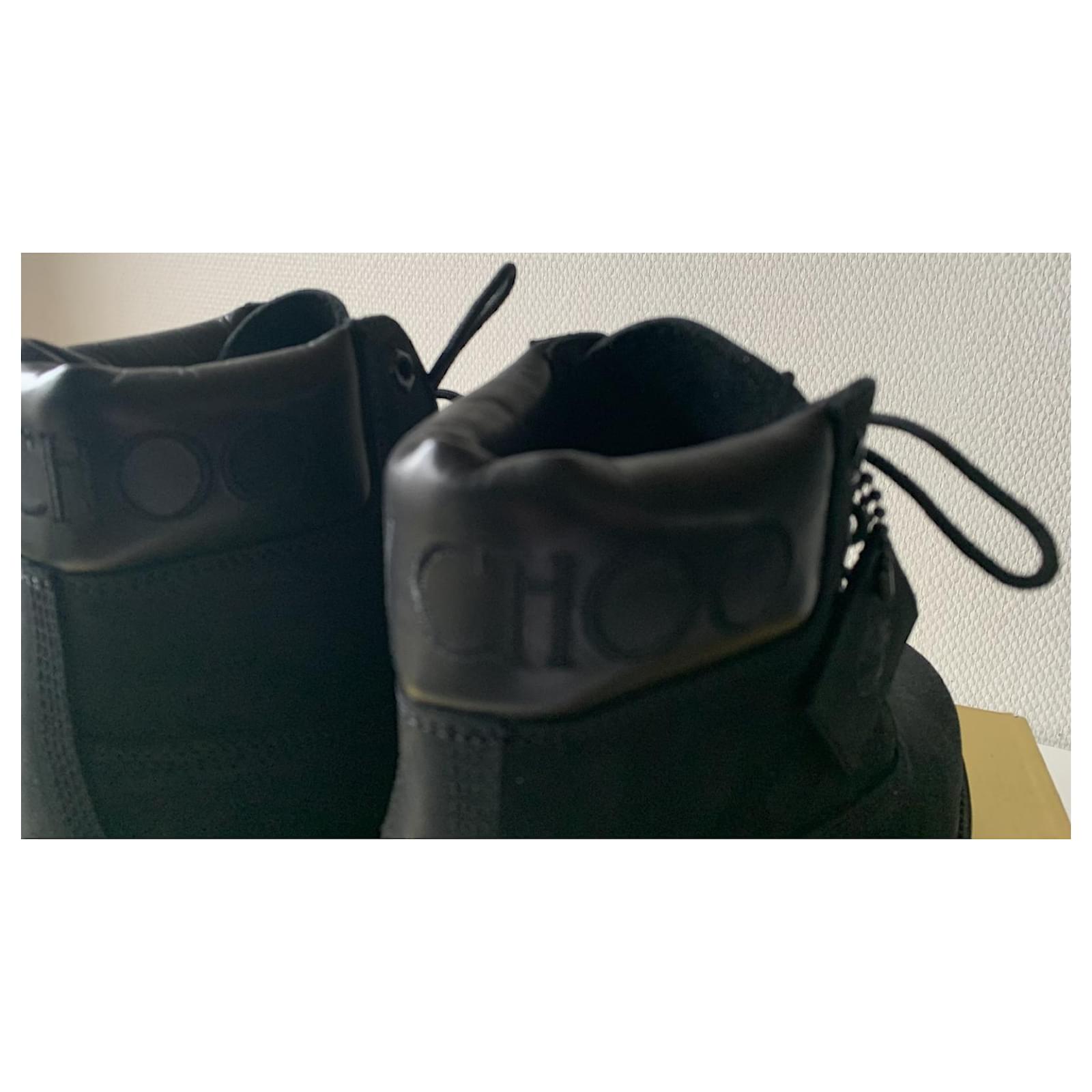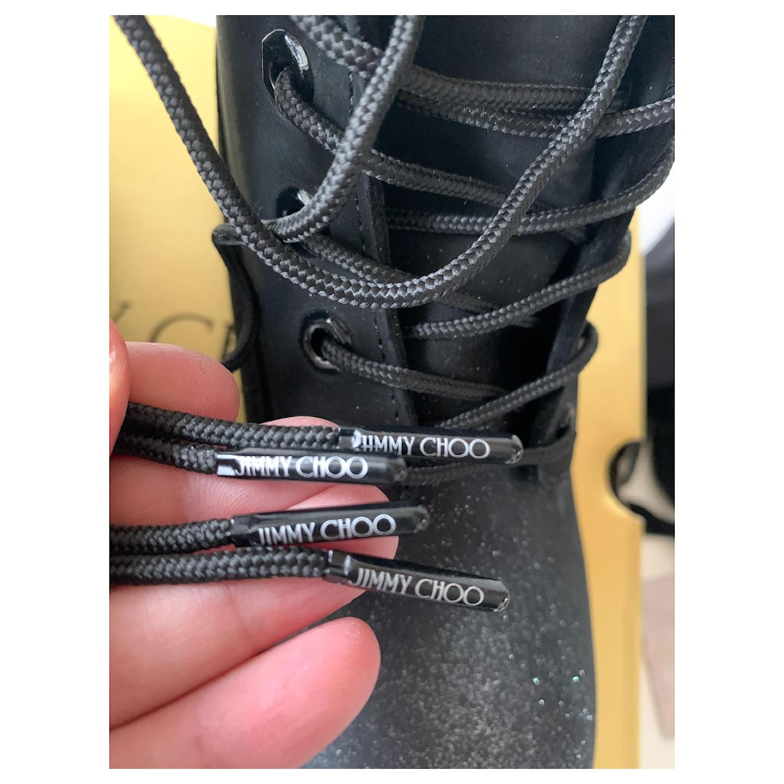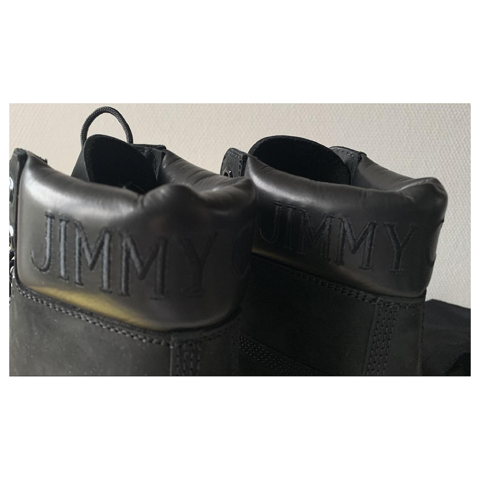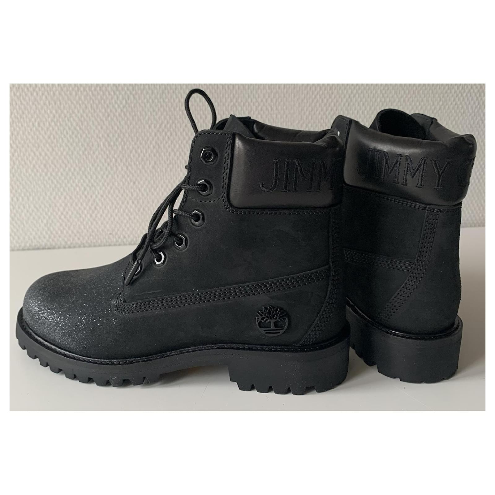 Pretty pair of boots from the collaboration between JIMMY CHOO and TIMBERLAND.\r\nThey are black, covered with glitter on the tips of the shoes.\r\nPointure : 39 US.\r\nNeuves, delivered in their original golden box, accompanied by a black canvas tote bag signed Timberland and JIMMY CHOO.\r\nMade in Portugal.