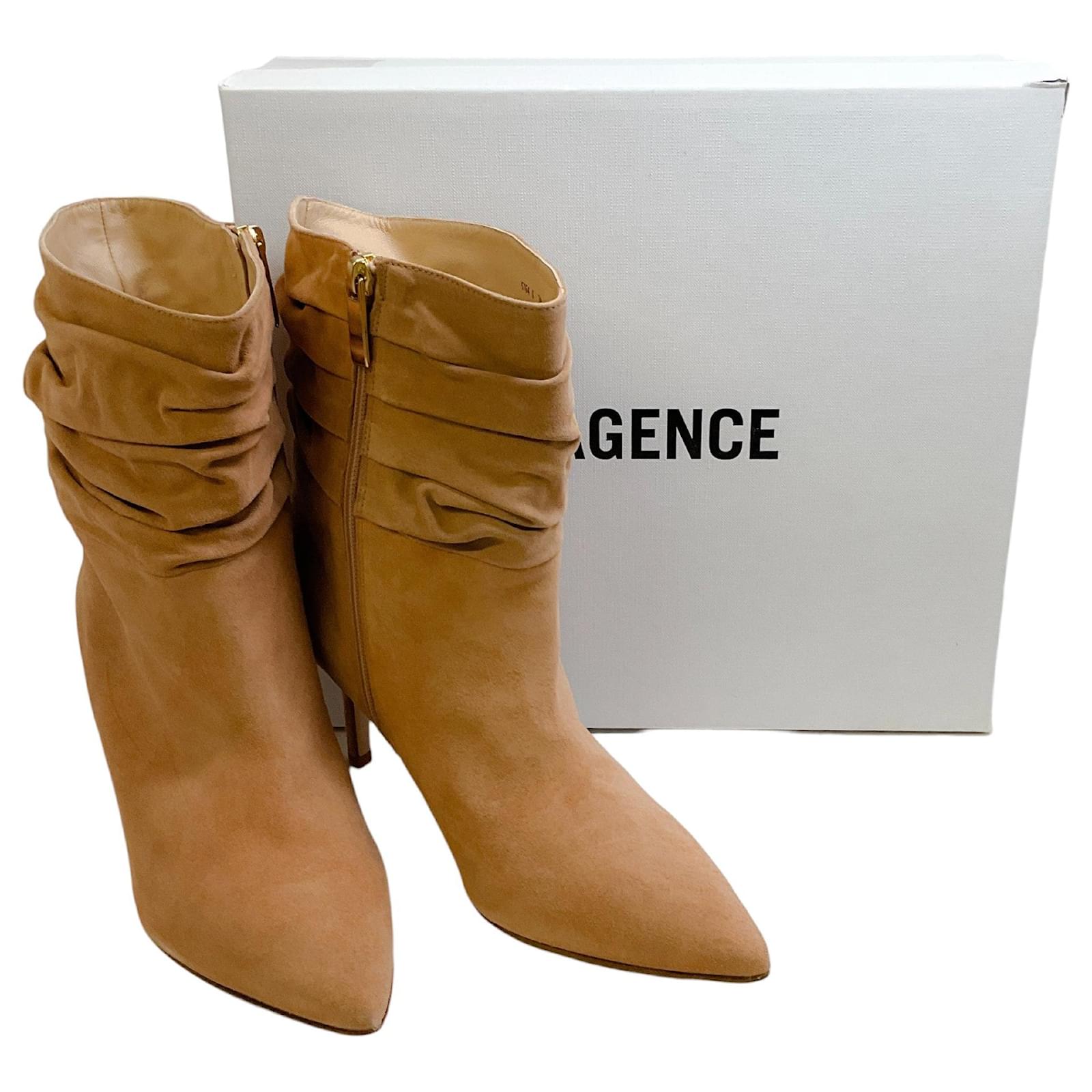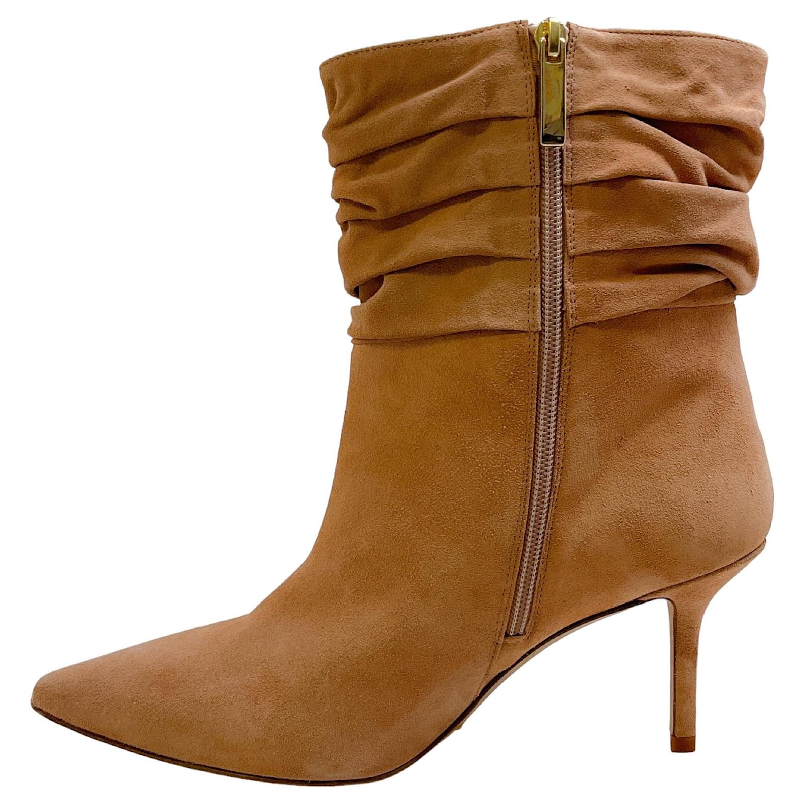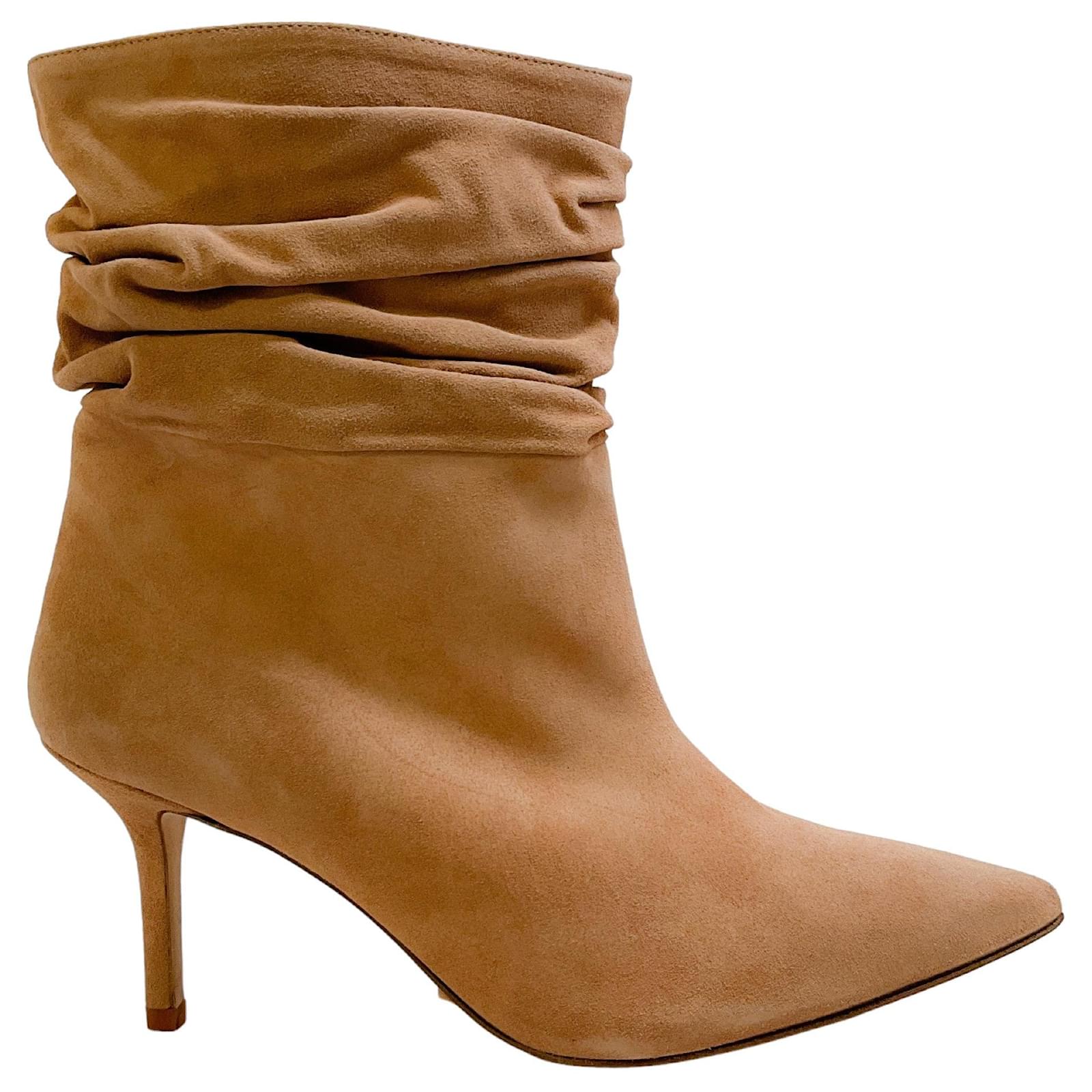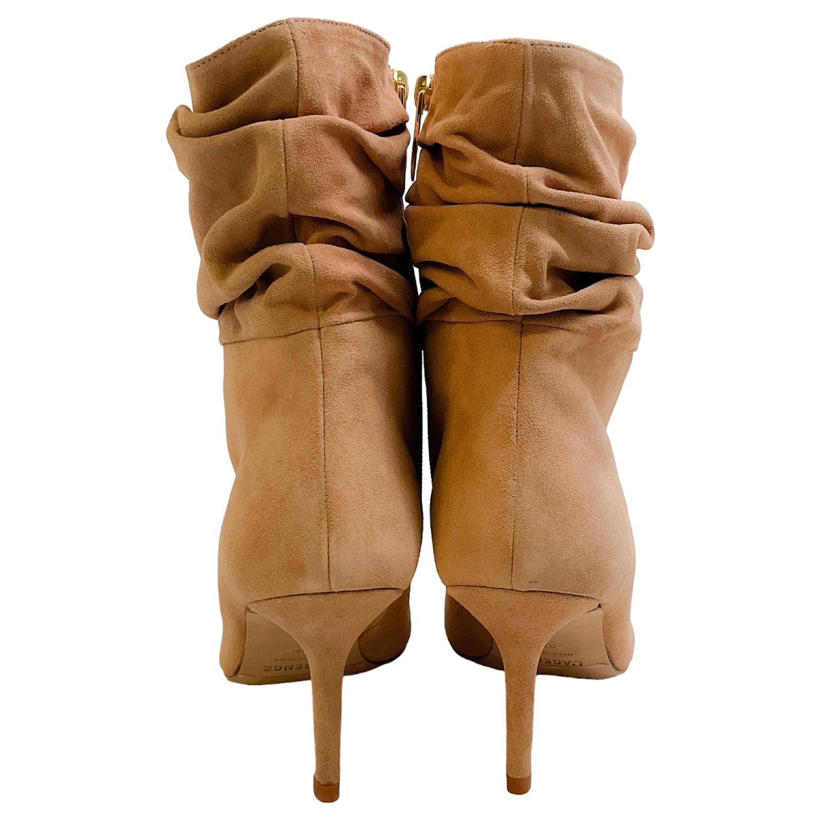 L’Agence Beige Suede Florine Slouch Booties\nCondition: never worn, with tag\nSlight marks on soles from in store try on\nMaterial: Suede\nas with all suede items, these are delicate and may have a slight discoloration (due to the nap in the fabric) and minor indentations (due to the soft, supple material)\nIncludes: Box\nCountry of origin: Spain\nPlease note, as with most designer shoes, they may run small.\nHeel height: 3\”\nSole: leather\nhardware: Gold Tone\ncolor: Beige\nSize: US 9.5 / eu 39.5\ncategory: Shoes\nSubcategory: ankle boots\nSub Sub Category: others\n100596-418 F424MA\n** Photos are of the actual item **\n** Roundabout Couture Certified Authentic **