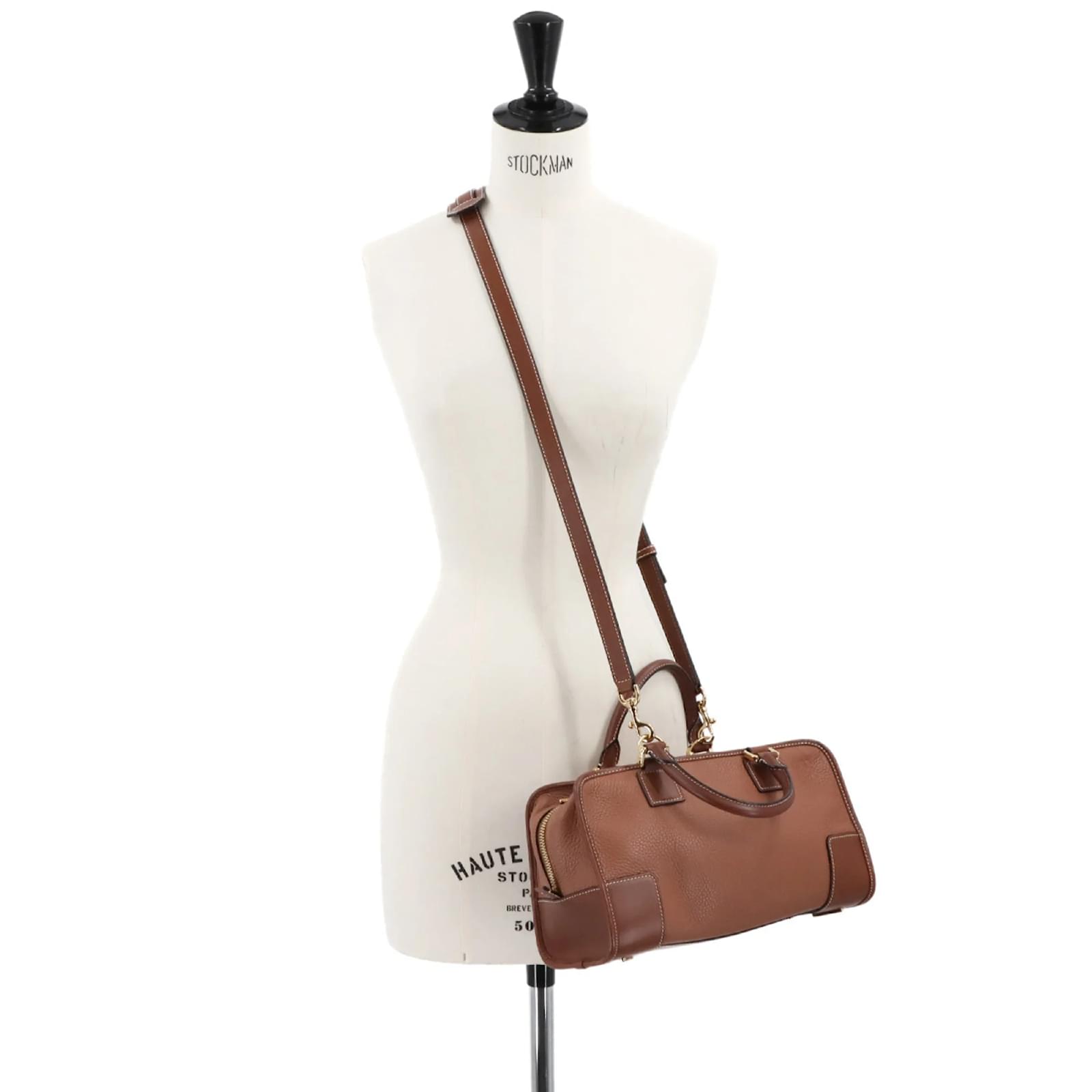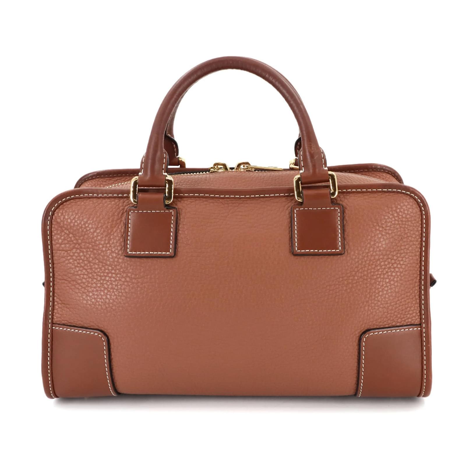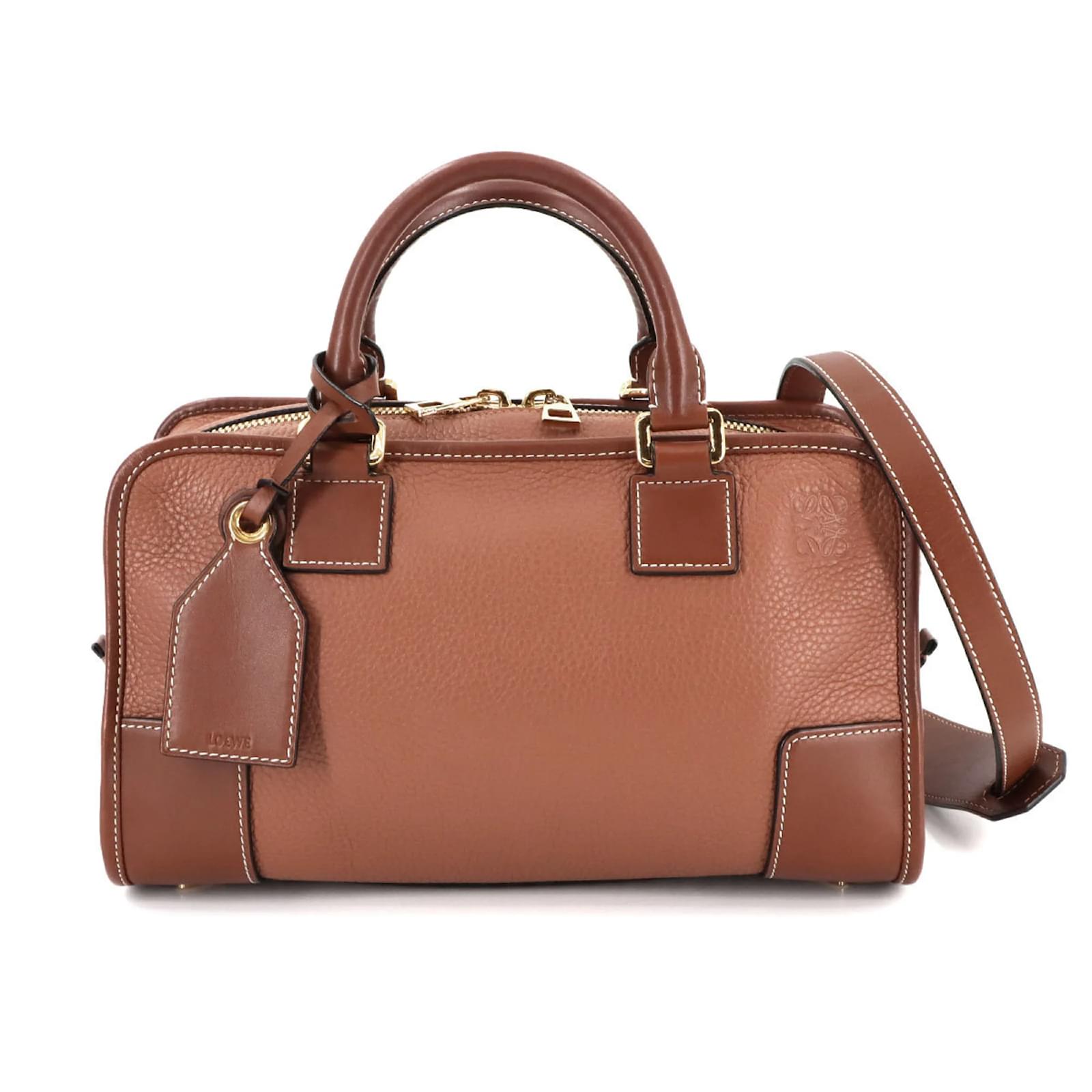 The Loewe Amazona 28 is a versatile handbag that can also be worn as a shoulder bag. Crafted from brown leather, it features gold hardware that adds a touch of elegance. The dimensions of the bag are 16.5cm in height, 29cm in width, and 13cm in depth, making it a practical choice for daily use. \n\nThis item is in used condition, classified as Rank S, indicating it is in mint condition with insignificant traces of use, such as minor edge cracks. It comes with a name tag and a shoulder strap, and potential buyers are encouraged to review the images for a detailed view of the item’s condition and included accessories.