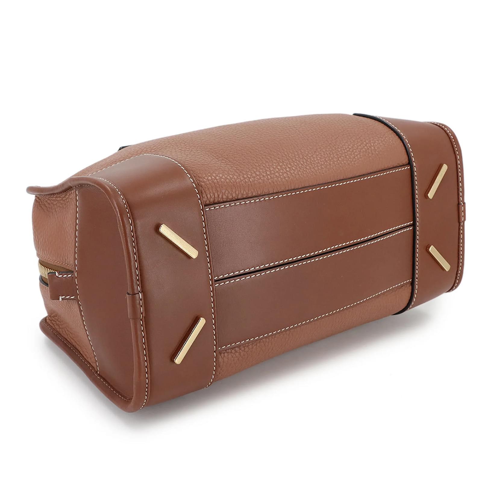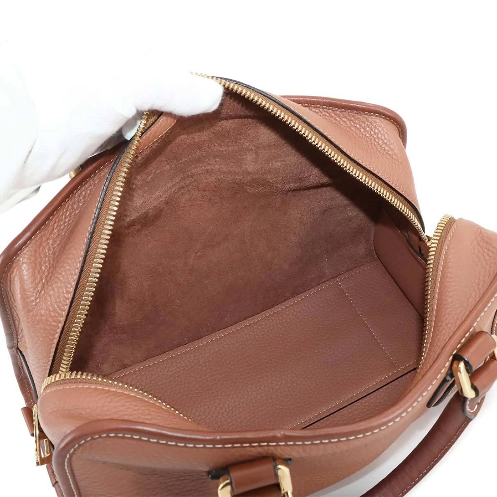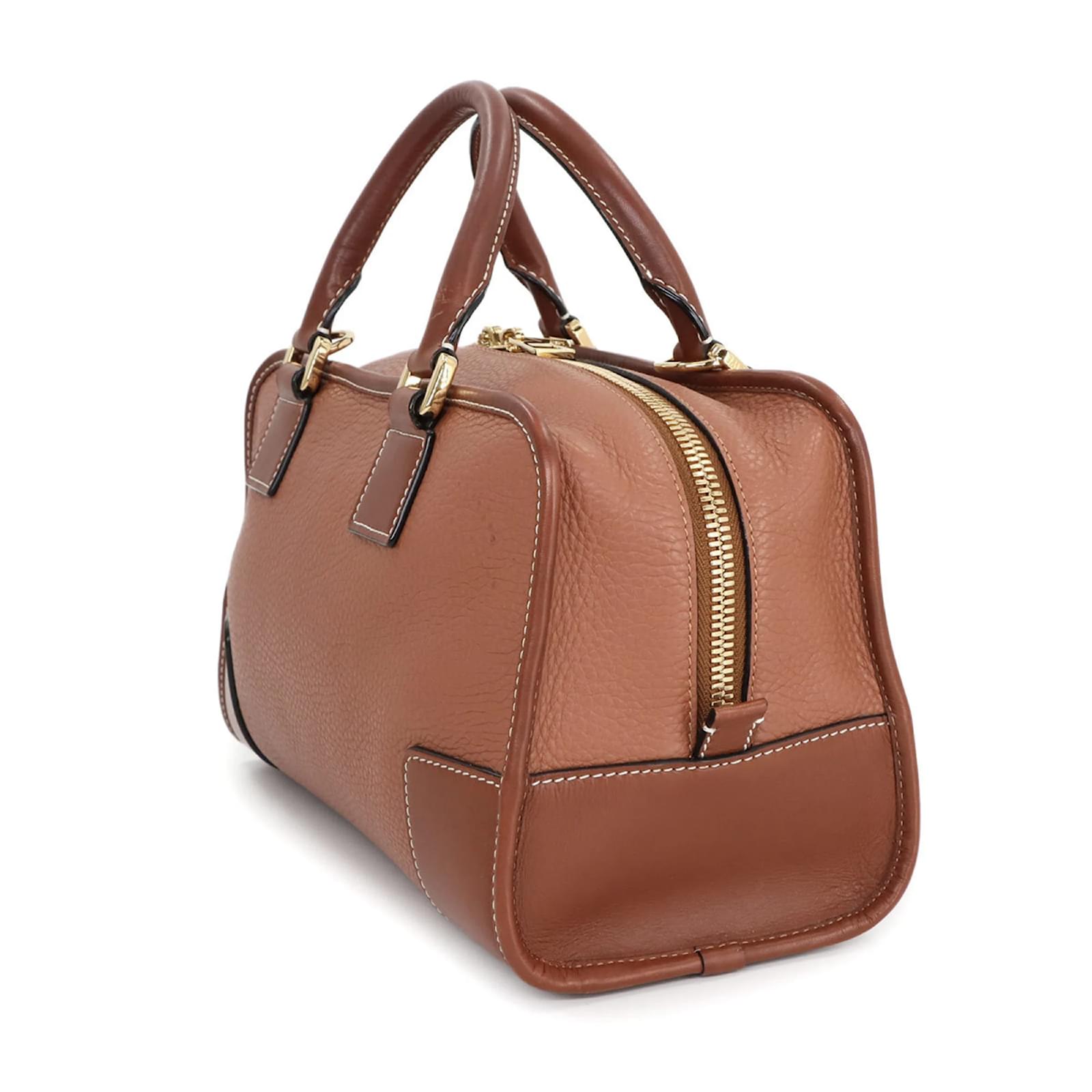 The Loewe Amazona 28 is a versatile handbag that can also be worn as a shoulder bag. Crafted from brown leather, it features gold hardware that adds a touch of elegance. The dimensions of the bag are 16.5cm in height, 29cm in width, and 13cm in depth, making it a practical choice for daily use. \n\nThis item is in used condition, classified as Rank S, indicating it is in mint condition with insignificant traces of use, such as minor edge cracks. It comes with a name tag and a shoulder strap, and potential buyers are encouraged to review the images for a detailed view of the item’s condition and included accessories.