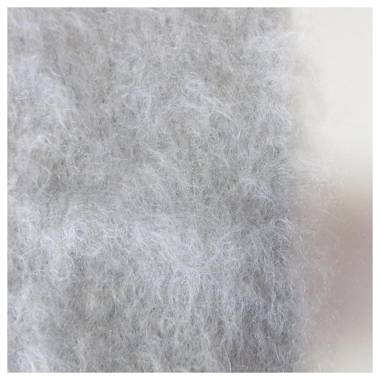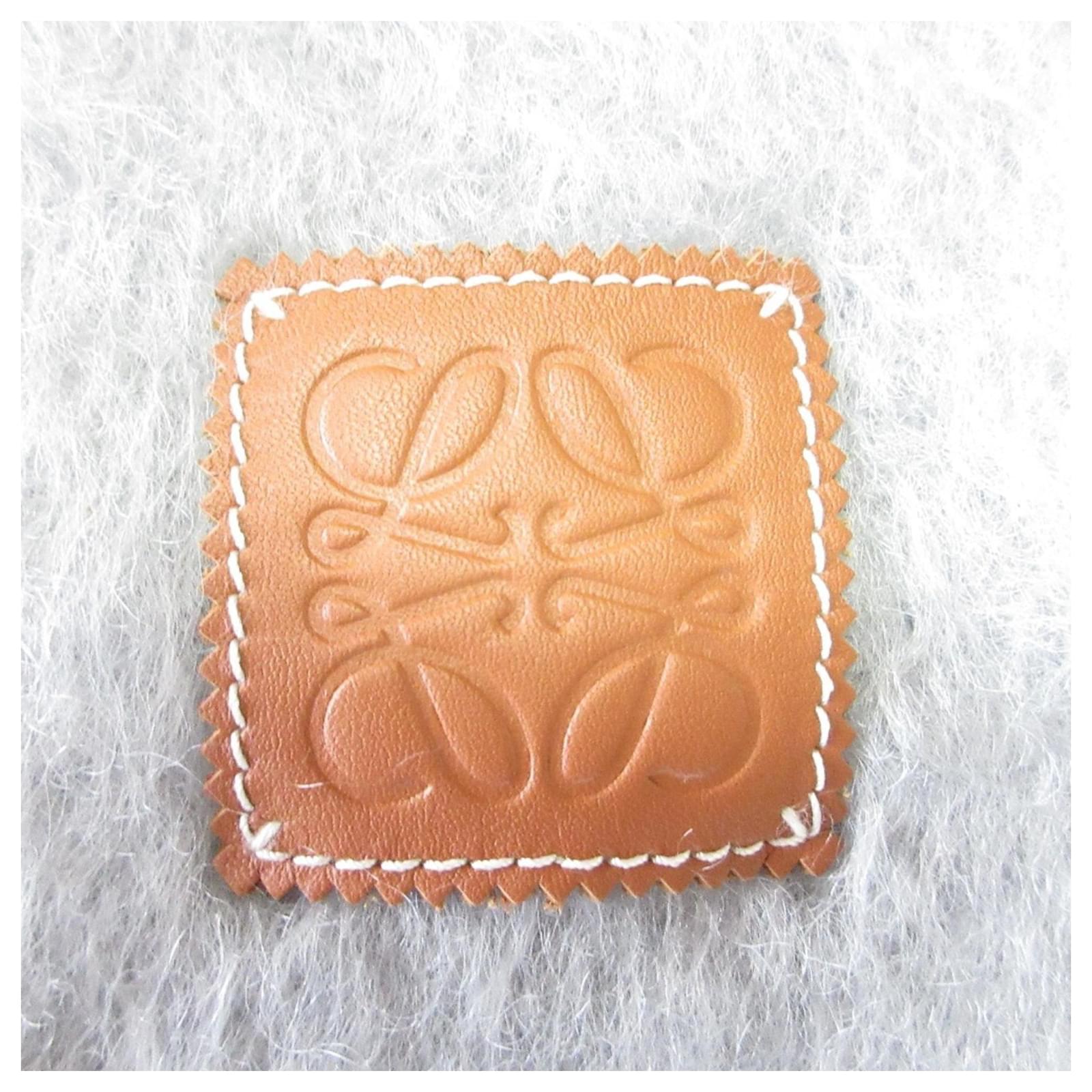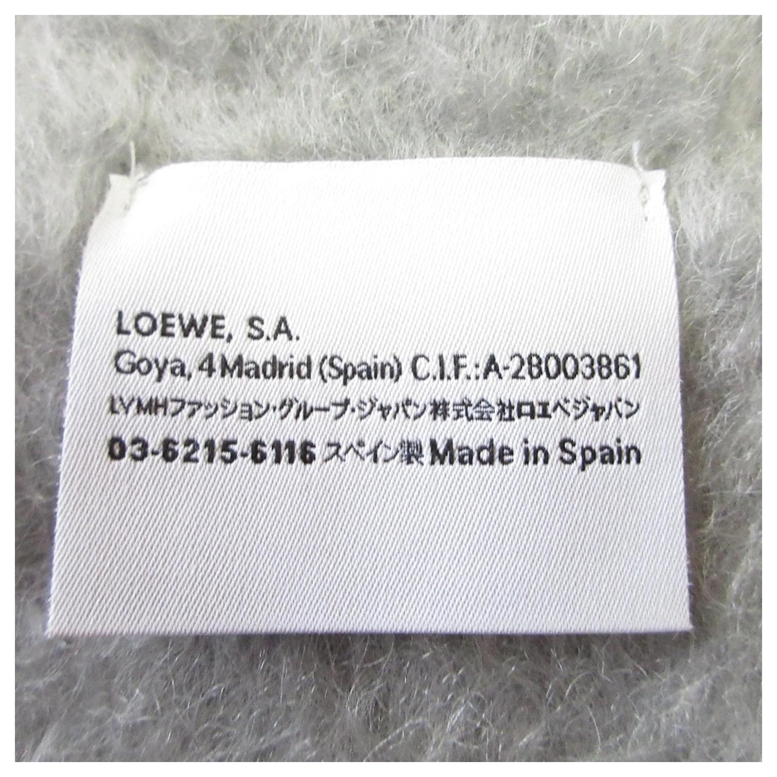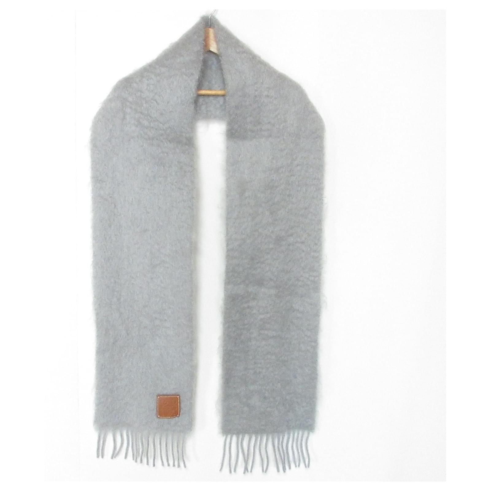 This gray shawl from Loewe features a distinctive Anagram leather patch and is crafted from a blend of mohair and wool, offering both warmth and style. Measuring 1.85 meters in length and 21.5 centimeters in width, it is designed for versatility in wear. \n\nThe scarf is in used condition, rated as \”like new\” with insignificant traces of use, scratches, or dirt. It is categorized as Rank SA, indicating it is a nice item or possibly refurbished. Potential buyers are encouraged to review the provided images for a clear understanding of the item’s condition and any included accessories.