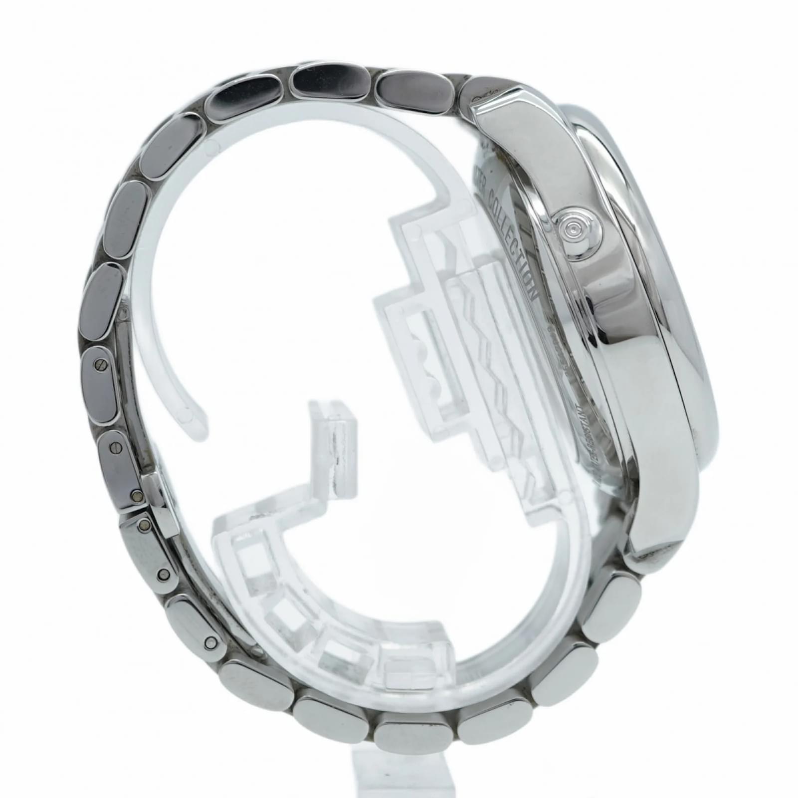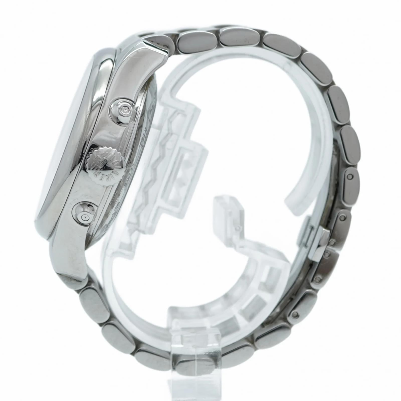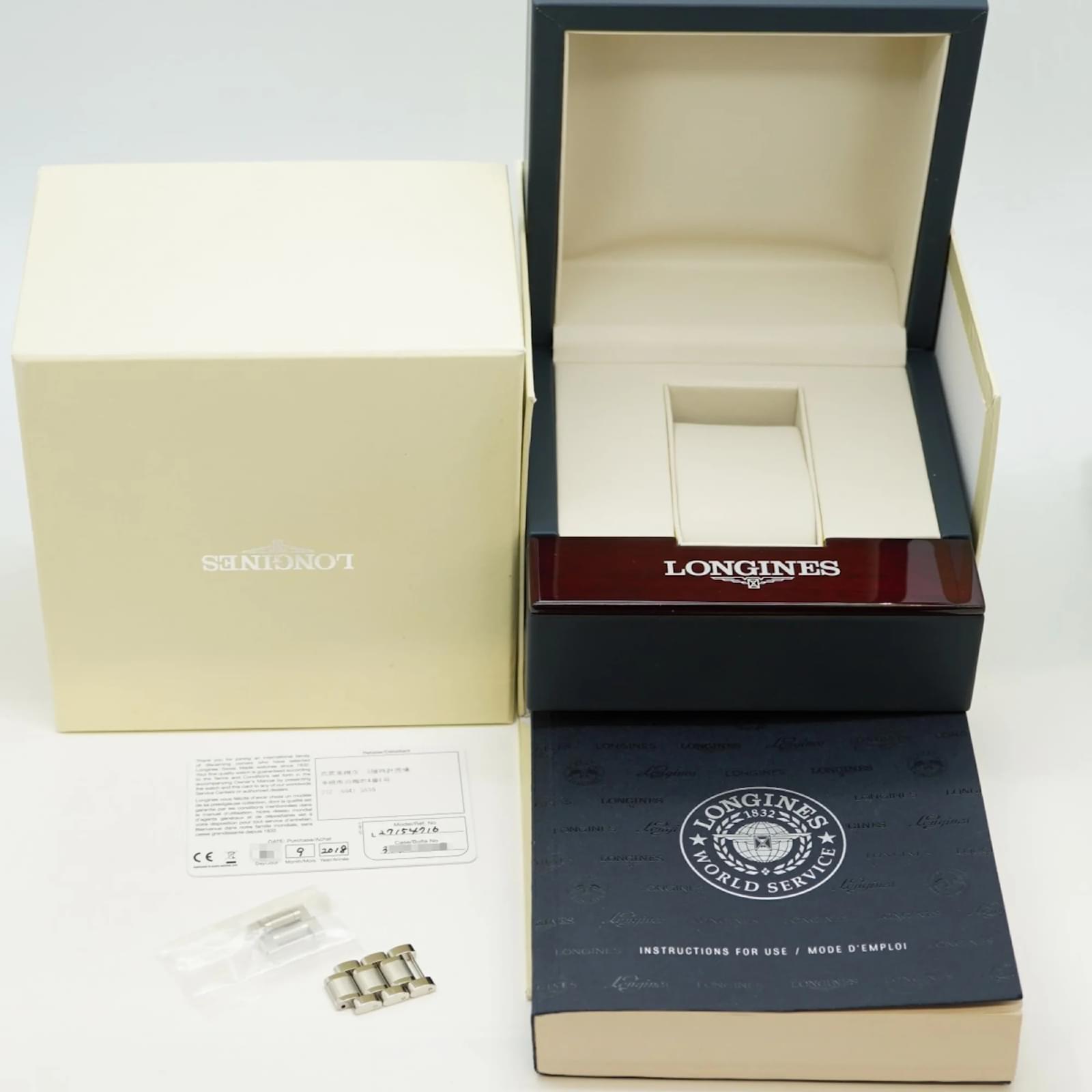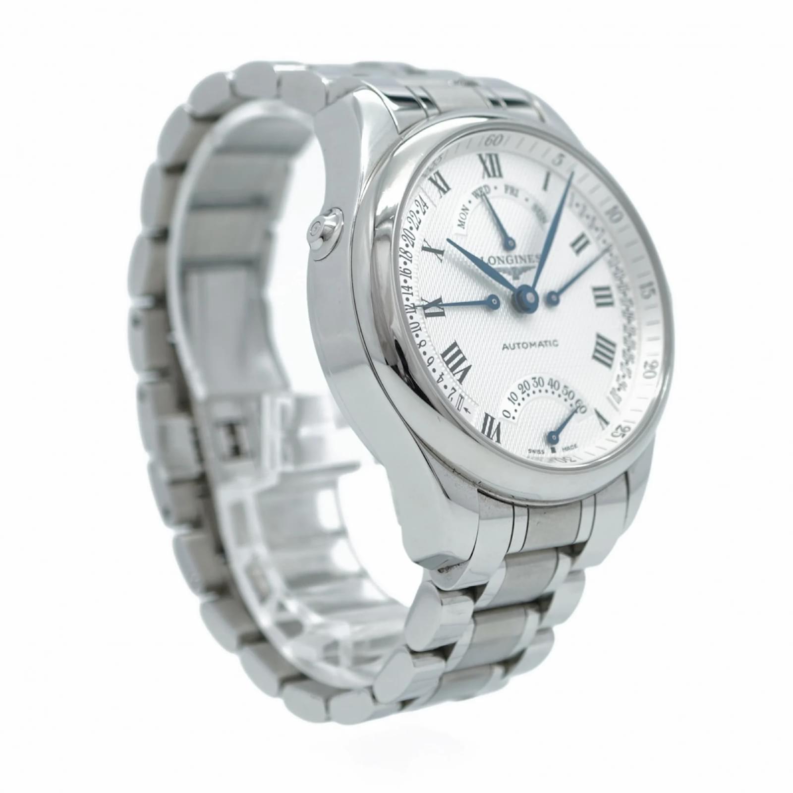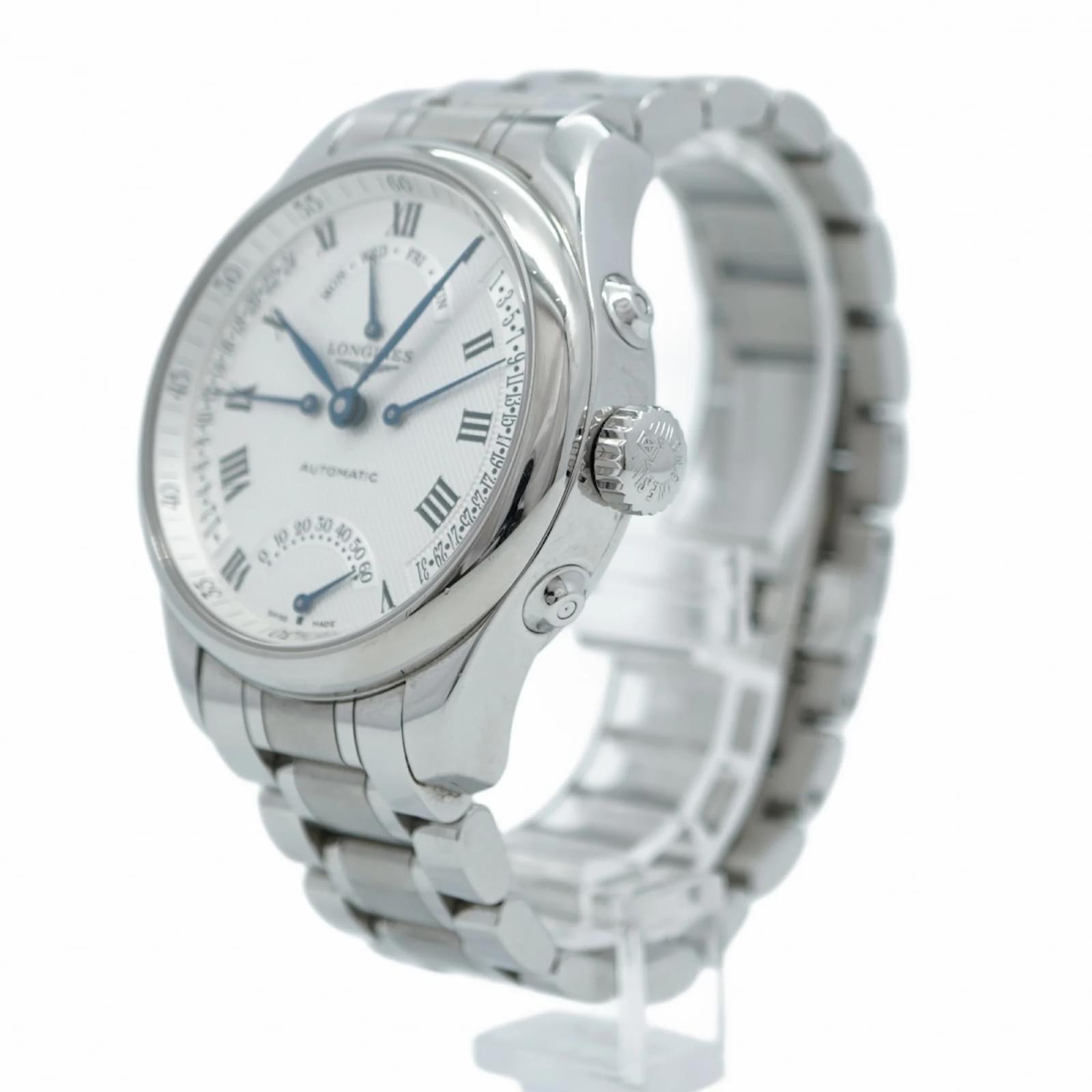 The Longines Master Collection 4 Retrograde L2.715.4 is a men’s wristwatch featuring a silver dial and a stainless steel band. This self-winding automatic timepiece has a case diameter of 41mm and is suitable for a wrist size of 17cm (6.69 inches). \n\nThis watch is in good used condition, with slight scratches on the bezel, case back, dial, glass, and crown, as well as minor signs of wear on the band and bracelet. It comes with a guarantee card and both inner and outer boxes. Potential buyers are encouraged to review the images for a detailed view of the watch’s condition and included accessories.