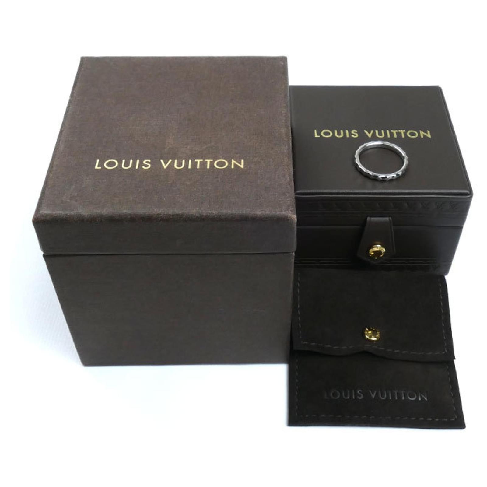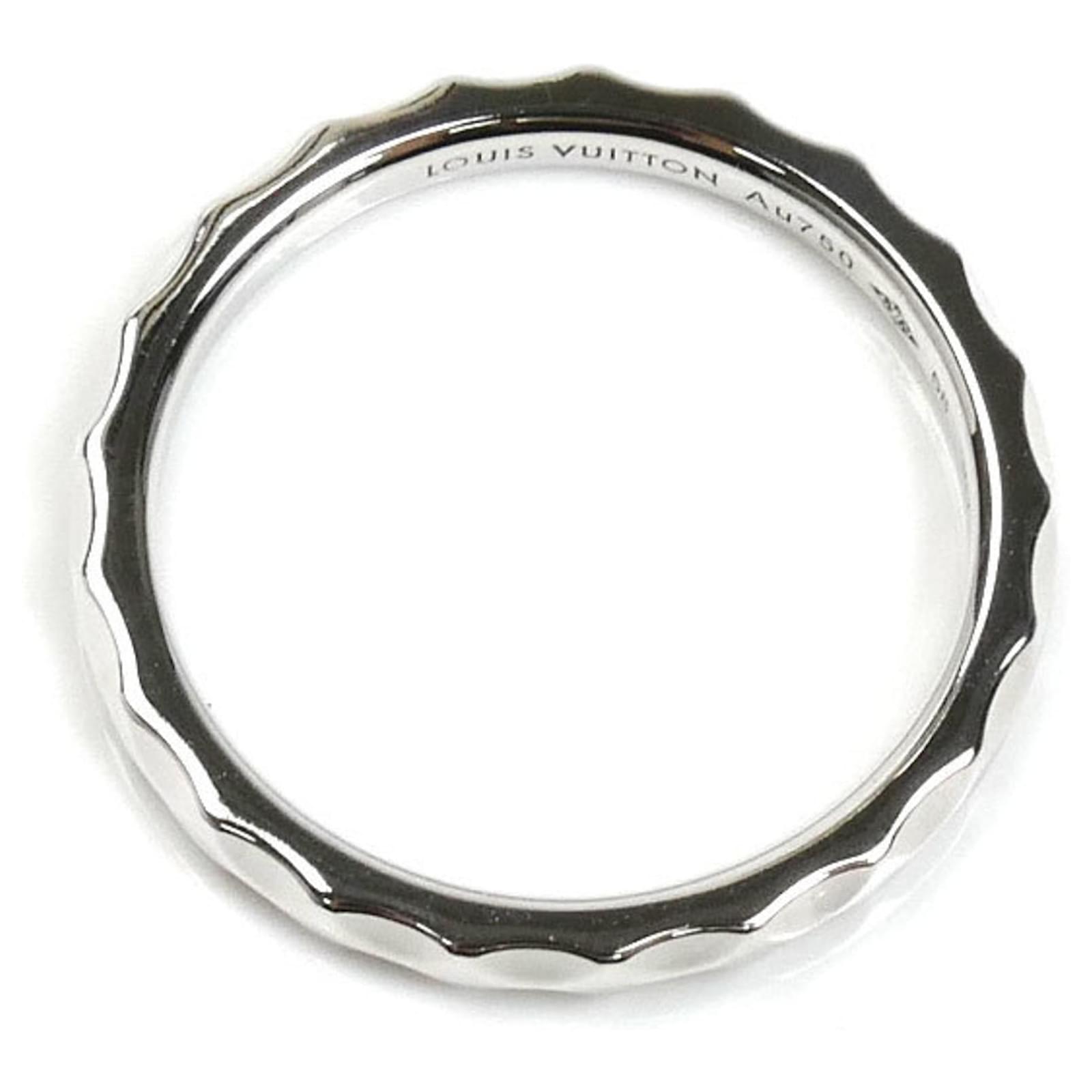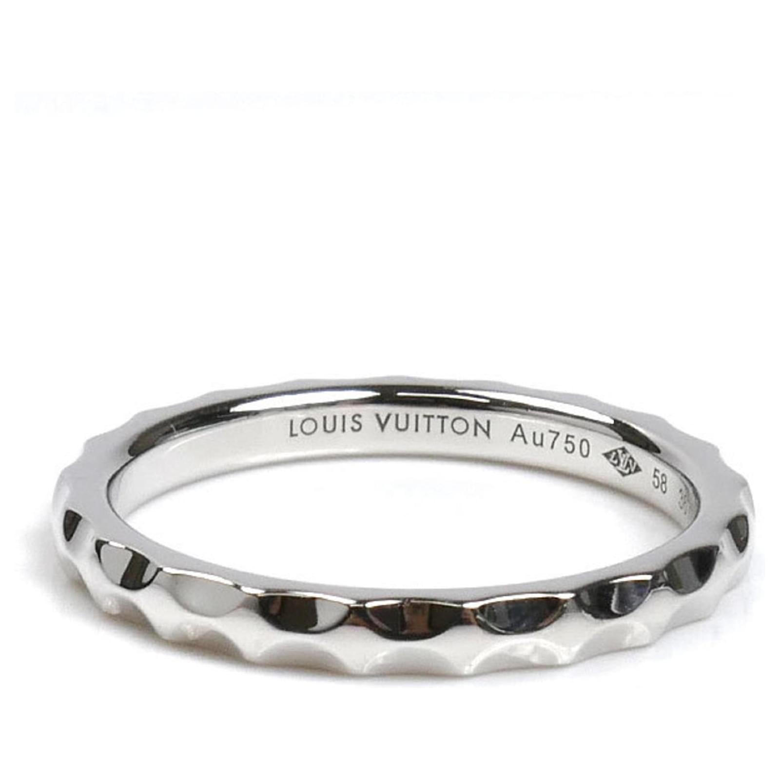This Louis Vuitton band ring is crafted from 18K white gold and features the brand’s signature Monogram Infinie design. It is available in a size 58, which corresponds to a US size 9. The ring is classified as used but is in very good condition, showing only insignificant traces of use, such as minor scratches and dirt. It comes with a box and dust bag for storage. Before purchasing, potential buyers are encouraged to review the images for a detailed view of the item’s condition.