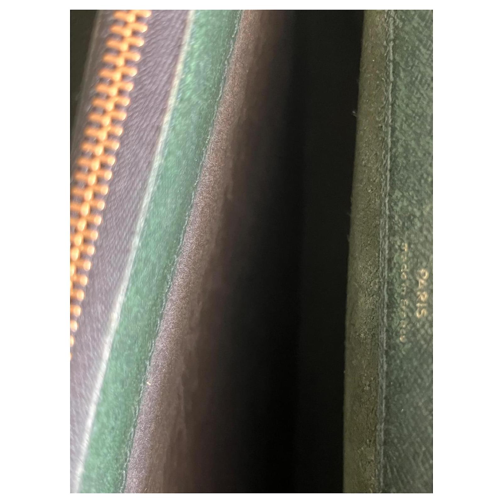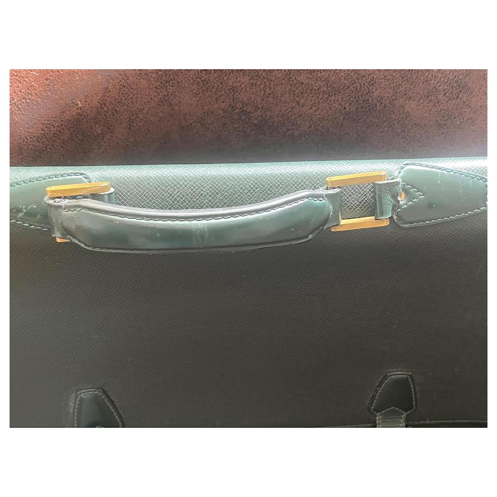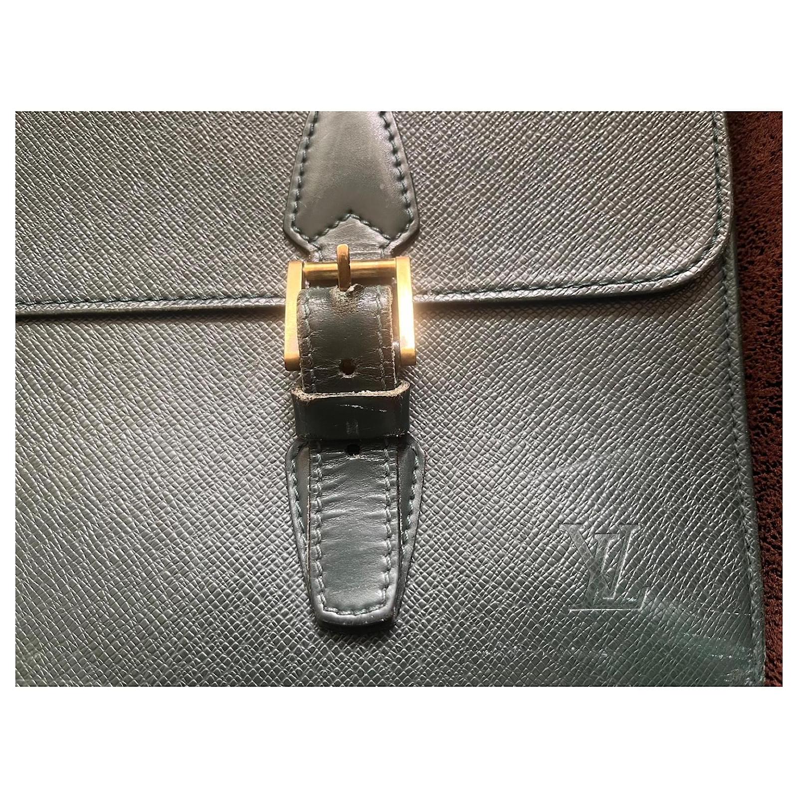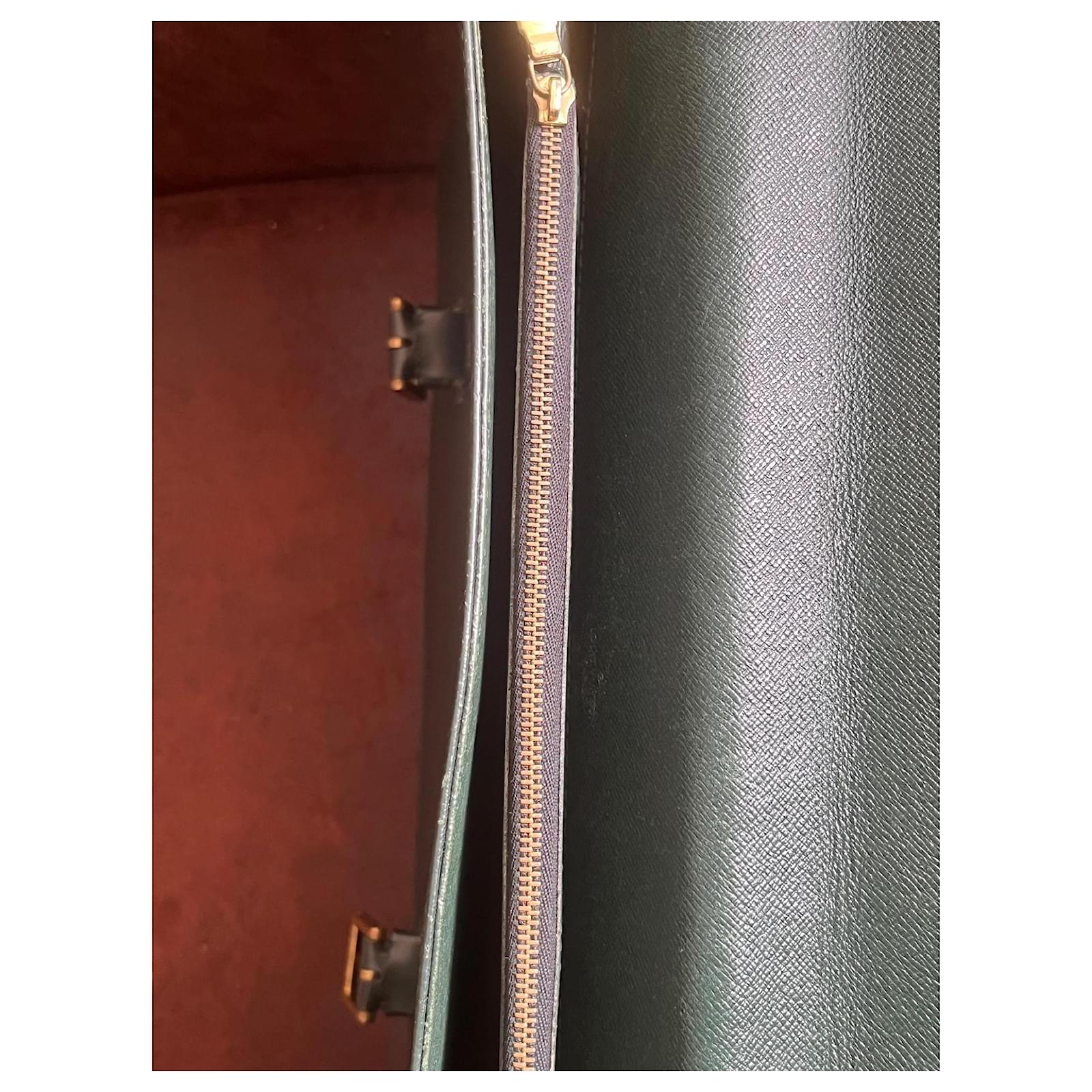 Louis Vuitton Document Holder Bag, in grained leather bronze green color, dimensions 34cm x 42cm x 8cm. Exterior pocket, 3 interior compartments with zipper. Front 2 buckles for the flap, signs of wear, remains in good condition.