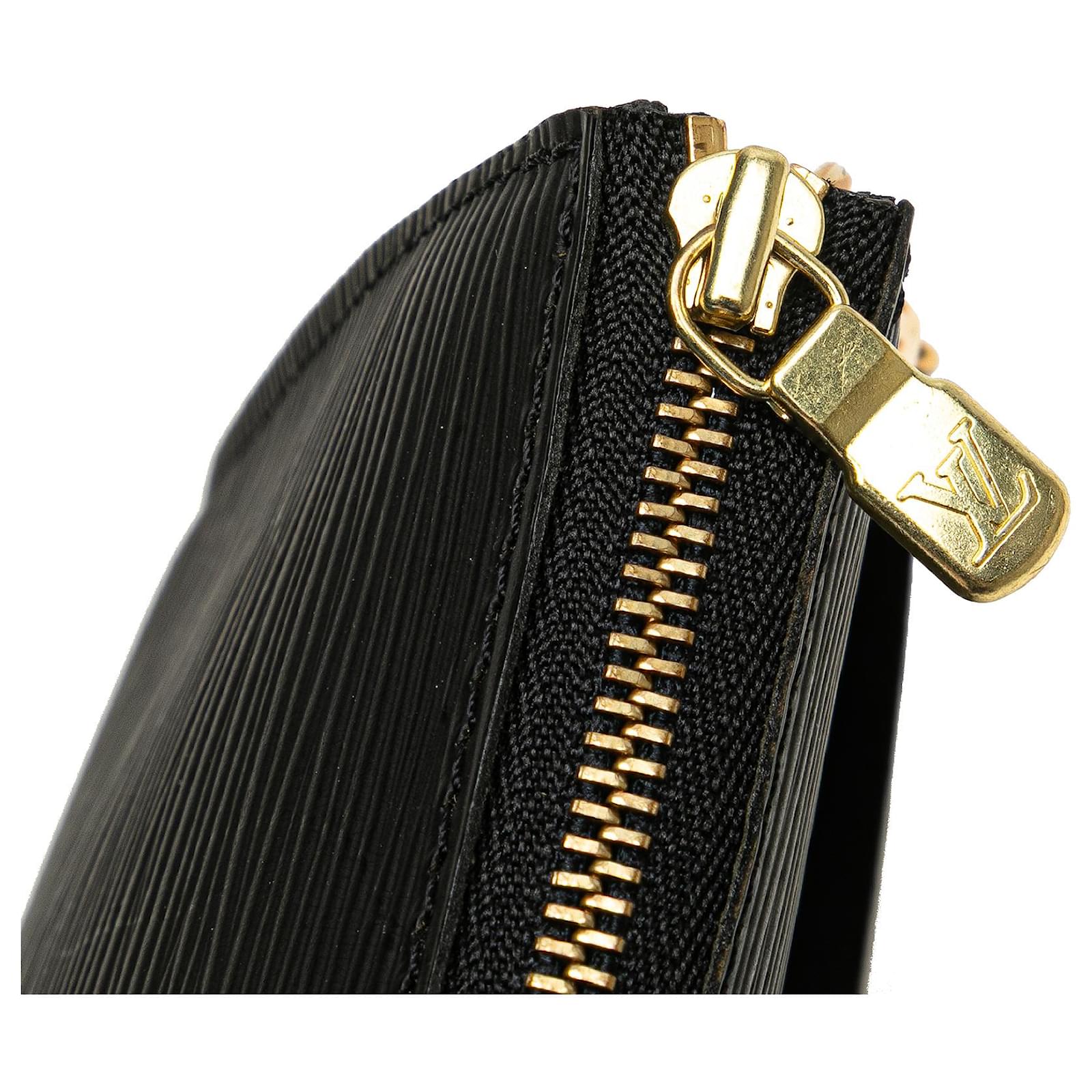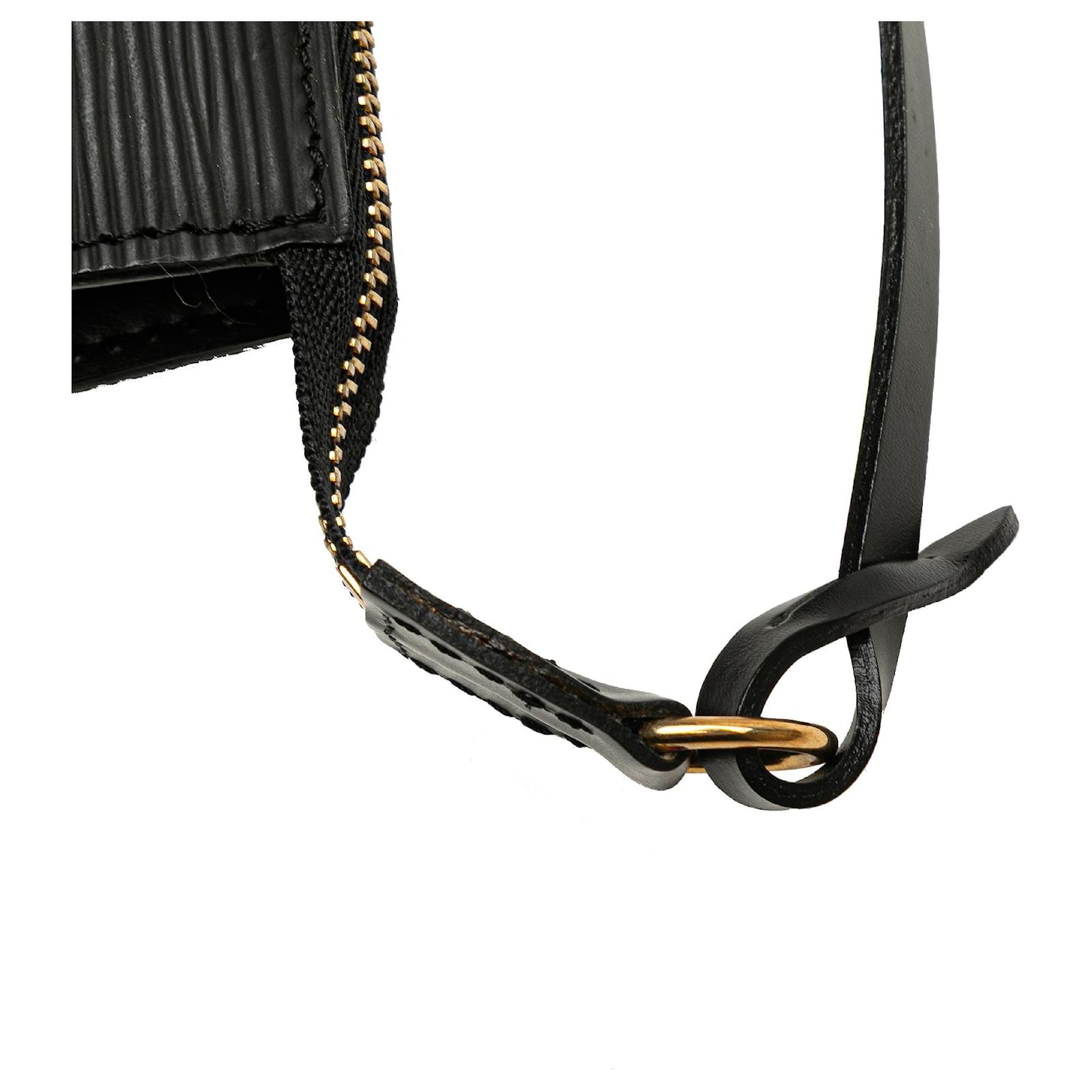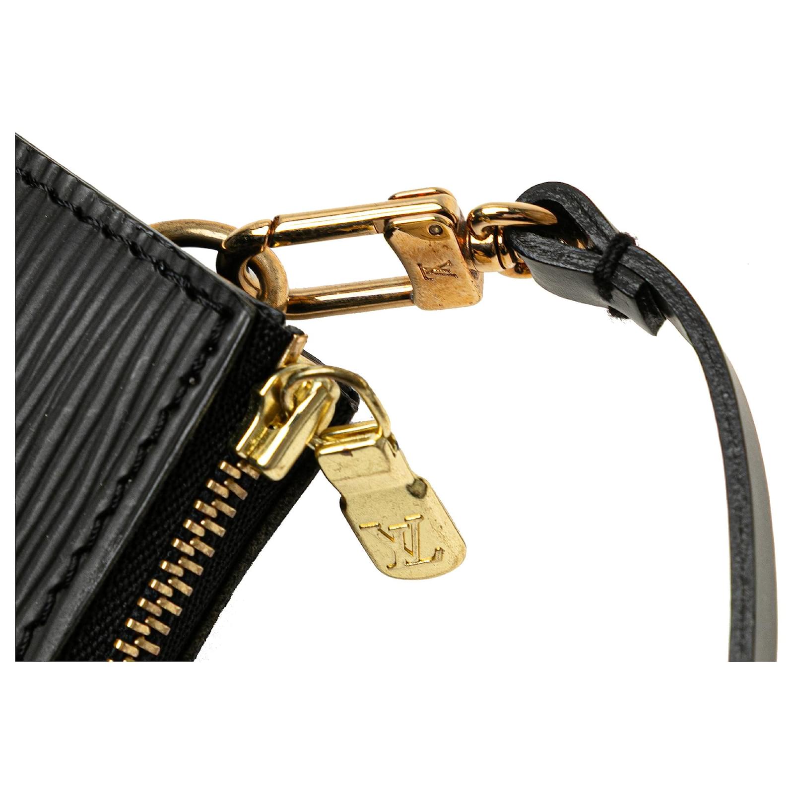 The Pochette Accessoires features an epi leather body, a detachable flat shoulder strap, and a top zip closure. It carries a B+ condition rating.\r\n\r\nExterior Back Scratched. Exterior Back stained with Other. Exterior Corners Worn. Exterior Front Scratched. Exterior Handle stained with Mold. Practical Attachment Scratched. Zipper Rusty/Tarnished, Scratched. \r\n\r\nDimensions: \r\nLength: 13 cm\r\nWidth: 24 cm\r\nDepth: 2 cm\r\nShoulder Drop: 15\r\n\r\nInclusions: No longer comes with original accessories.\r\n\r\nColor: Black\r\n\r\nMaterial: Leather x Epi Leather\r\n\r\nCountry of Origin: France\r\n\r\nSerial: AR1010\r\n\r\nBoutique Reference: PJC319879F956 \r\n