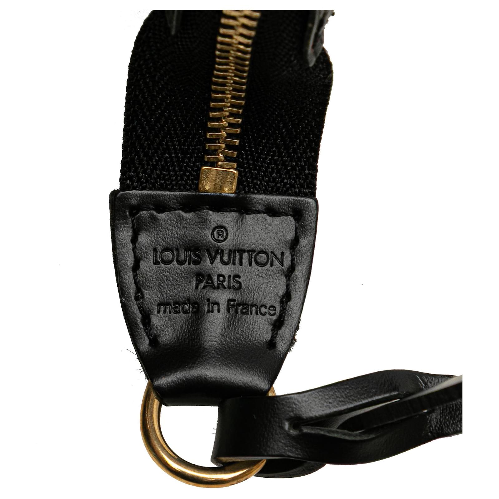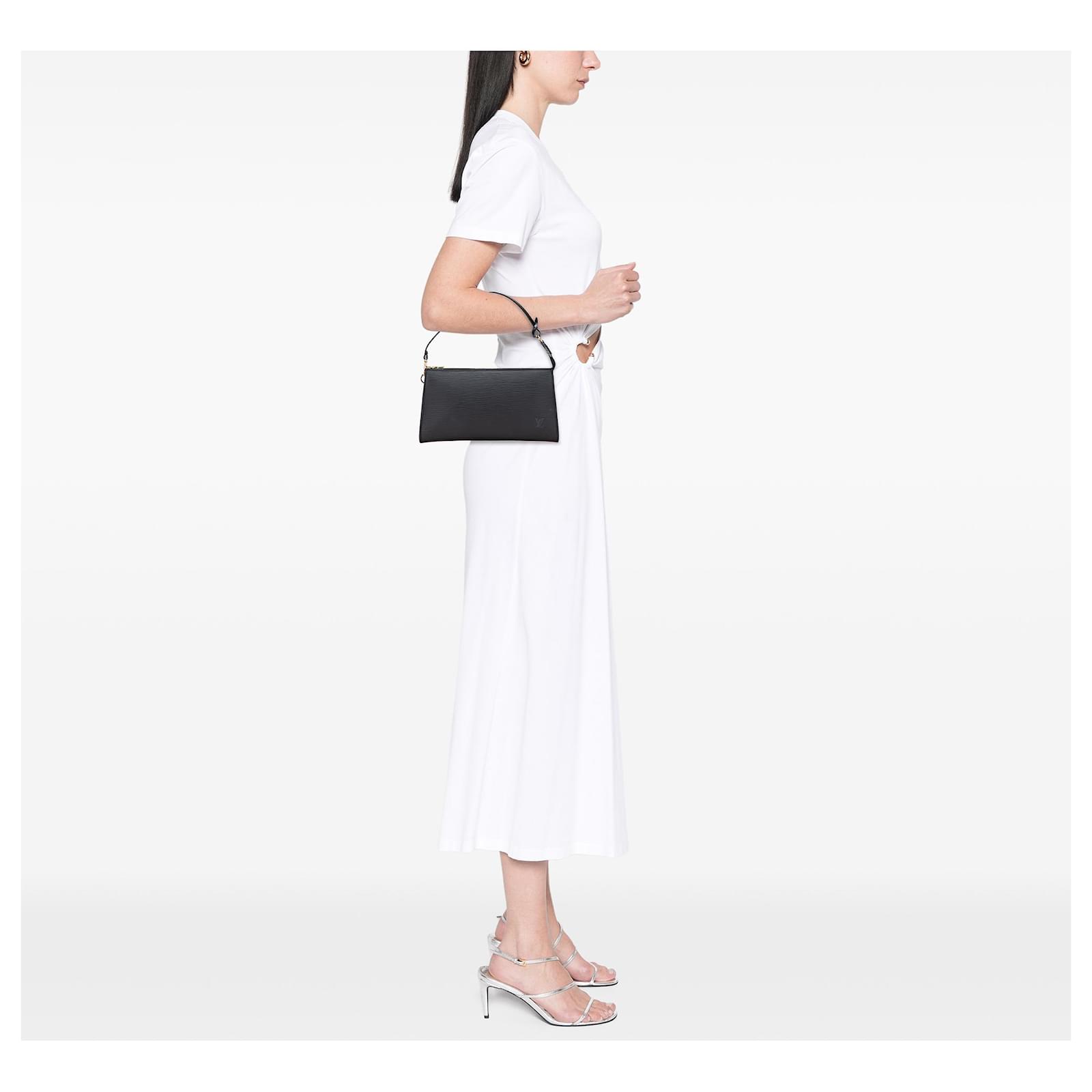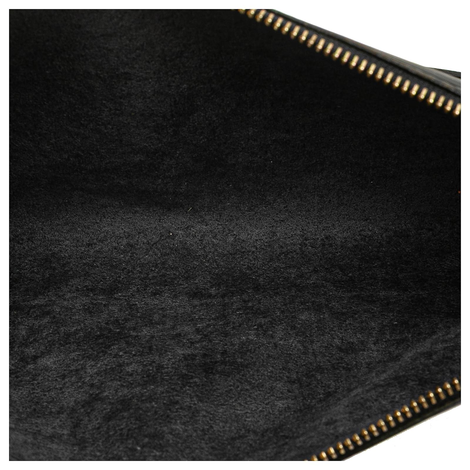 The Pochette Accessoires features an epi leather body, a detachable flat shoulder strap, and a top zip closure. It carries a B+ condition rating.\r\n\r\nExterior Back Scratched. Exterior Back stained with Other. Exterior Corners Worn. Exterior Front Scratched. Exterior Handle stained with Mold. Practical Attachment Scratched. Zipper Rusty/Tarnished, Scratched. \r\n\r\nDimensions: \r\nLength: 13 cm\r\nWidth: 24 cm\r\nDepth: 2 cm\r\nShoulder Drop: 15\r\n\r\nInclusions: No longer comes with original accessories.\r\n\r\nColor: Black\r\n\r\nMaterial: Leather x Epi Leather\r\n\r\nCountry of Origin: France\r\n\r\nSerial: AR1010\r\n\r\nBoutique Reference: PJC319879F956 \r\n