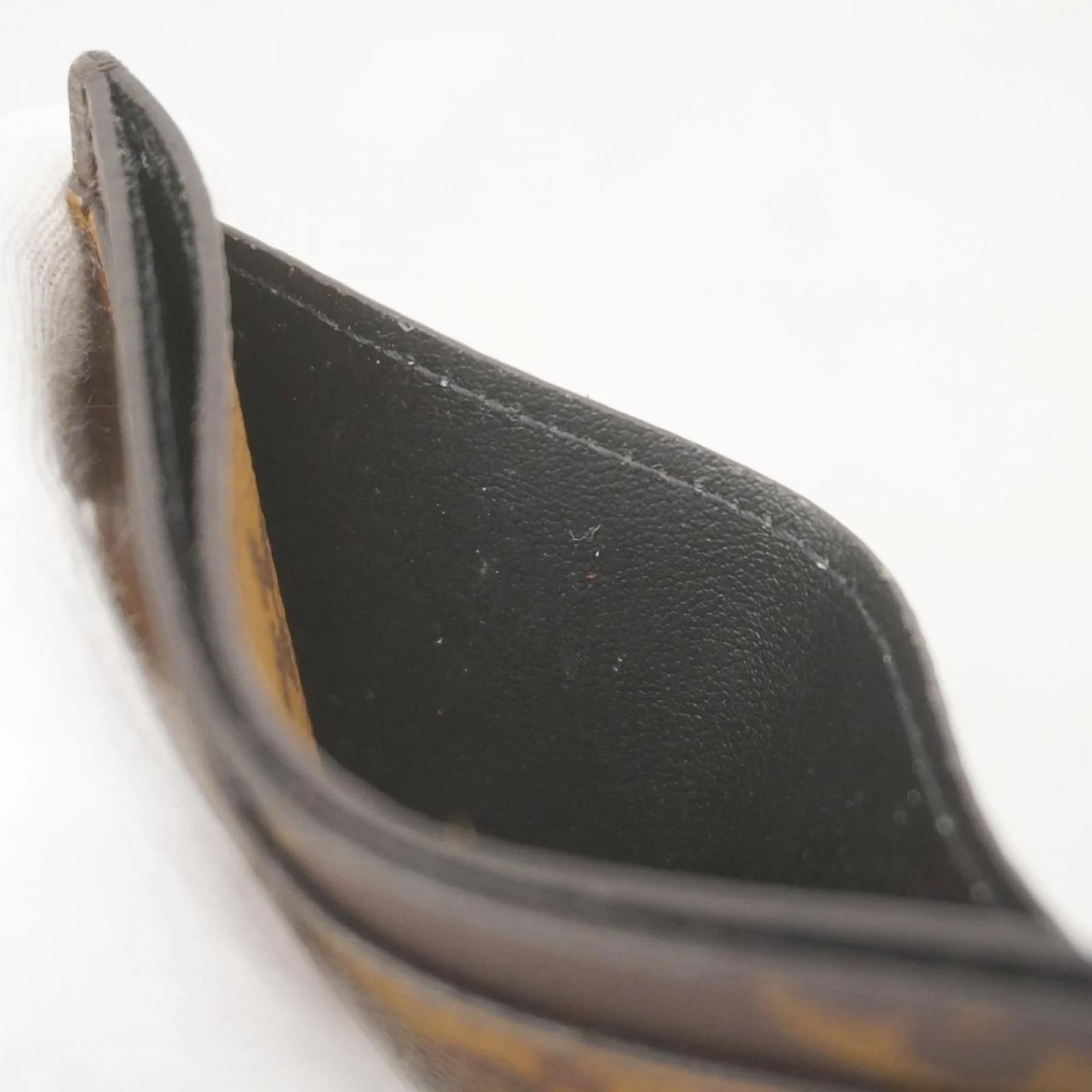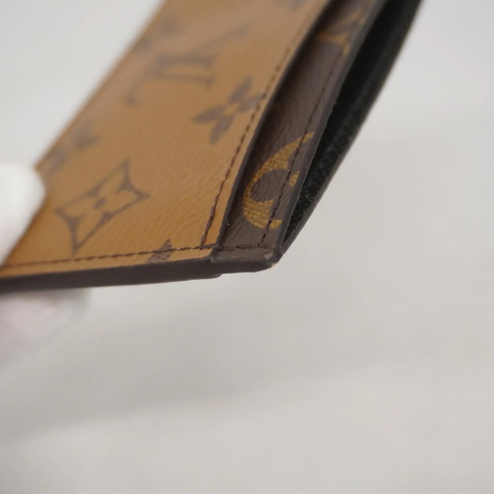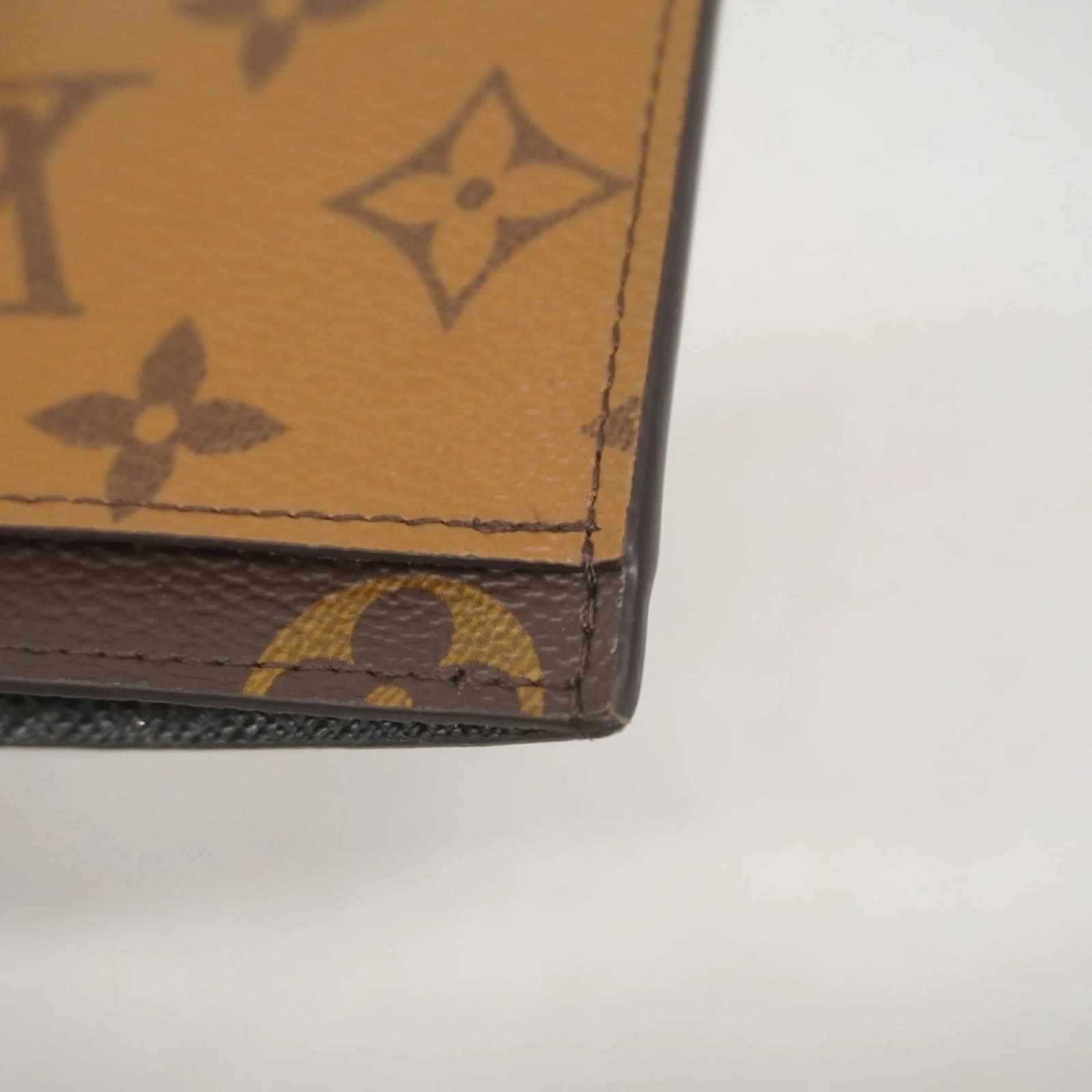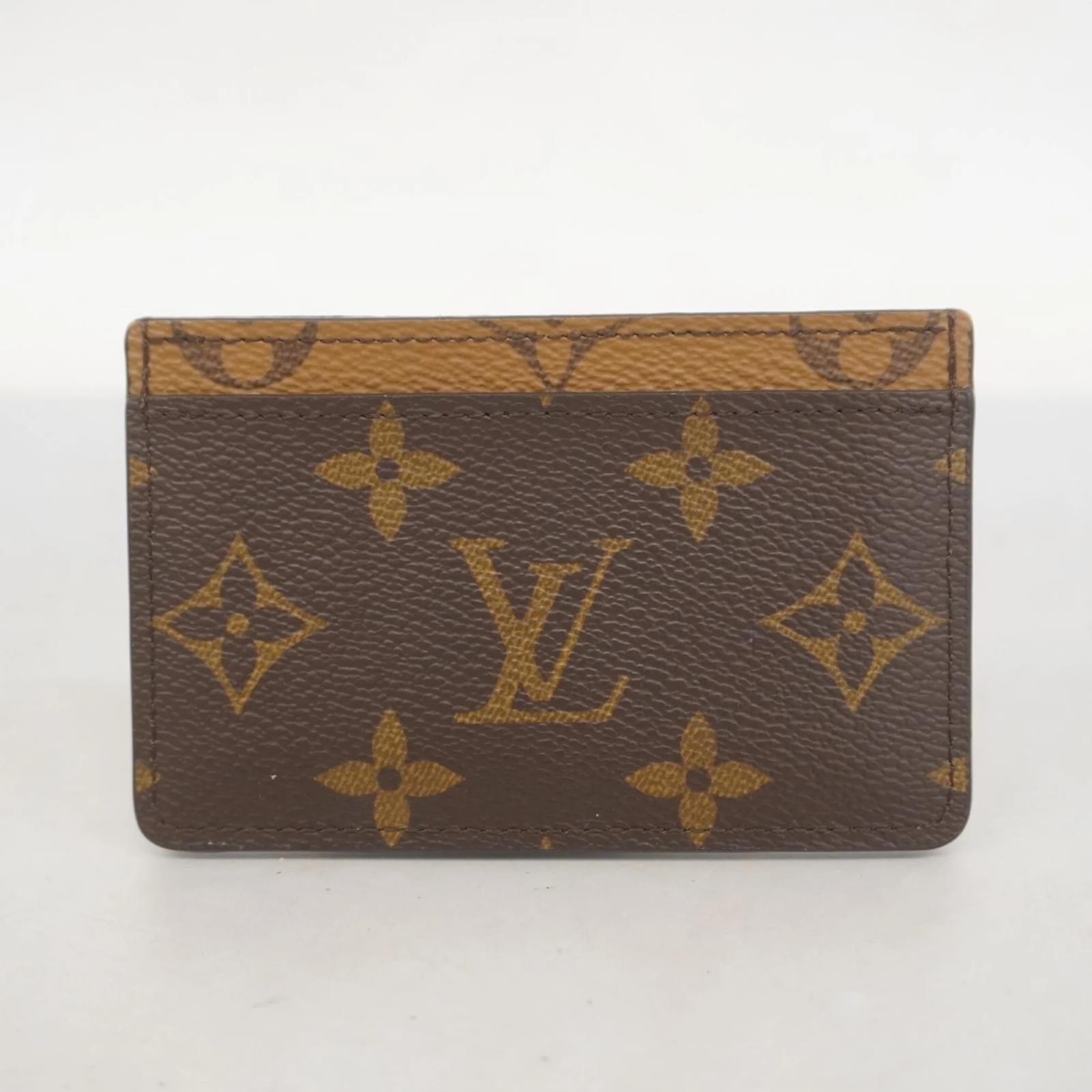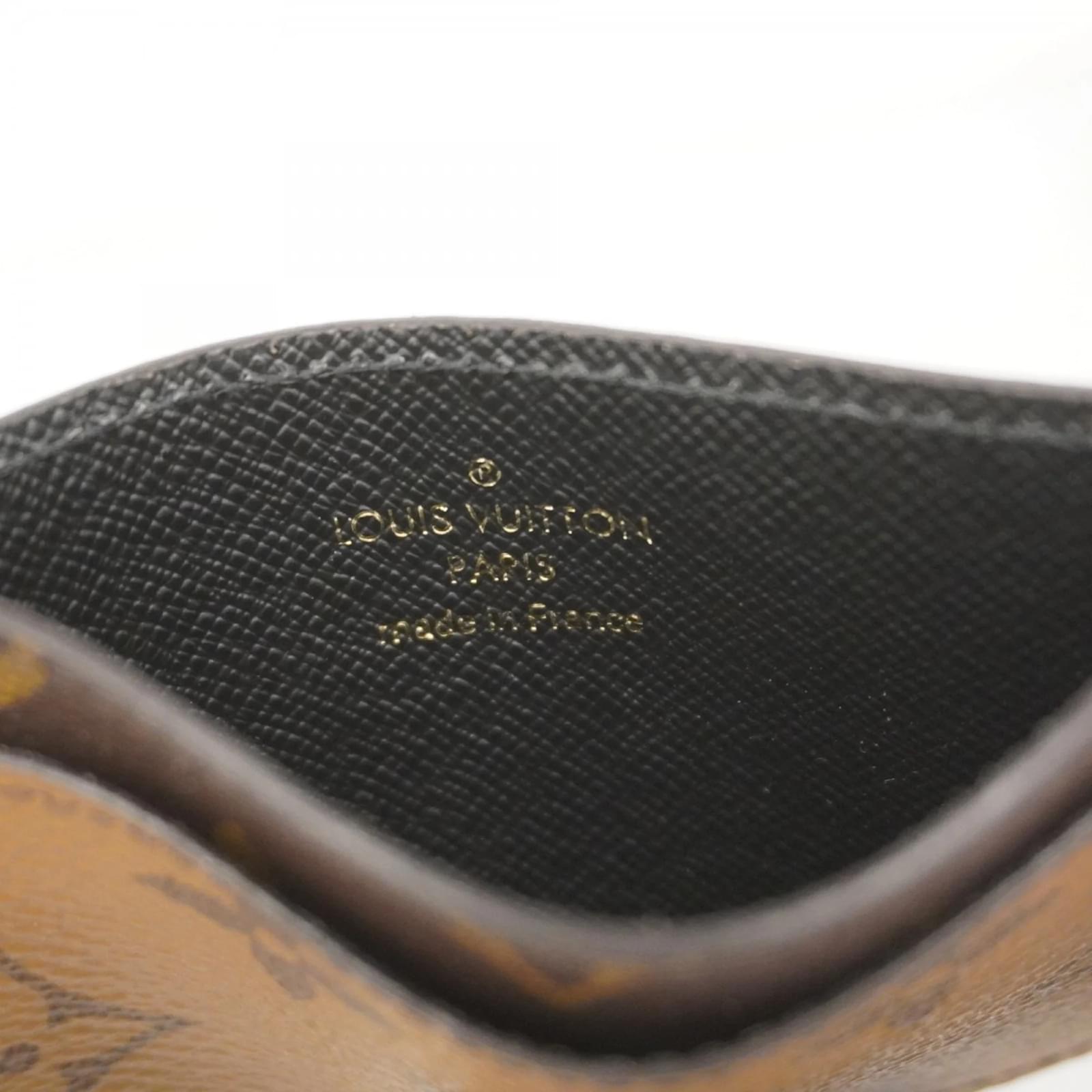 This Louis Vuitton business card holder, also known as the Monogram Reverse Porte Carte, is designed in a classic brown color. It is categorized as a card case, making it a practical accessory for organizing business cards. The item is used but remains in good condition, showing slight traces of usage, including minor scratches and dirt. It comes with a dust bag for protection. Potential buyers are encouraged to review the provided images to assess the exact condition of the item and the included accessories.