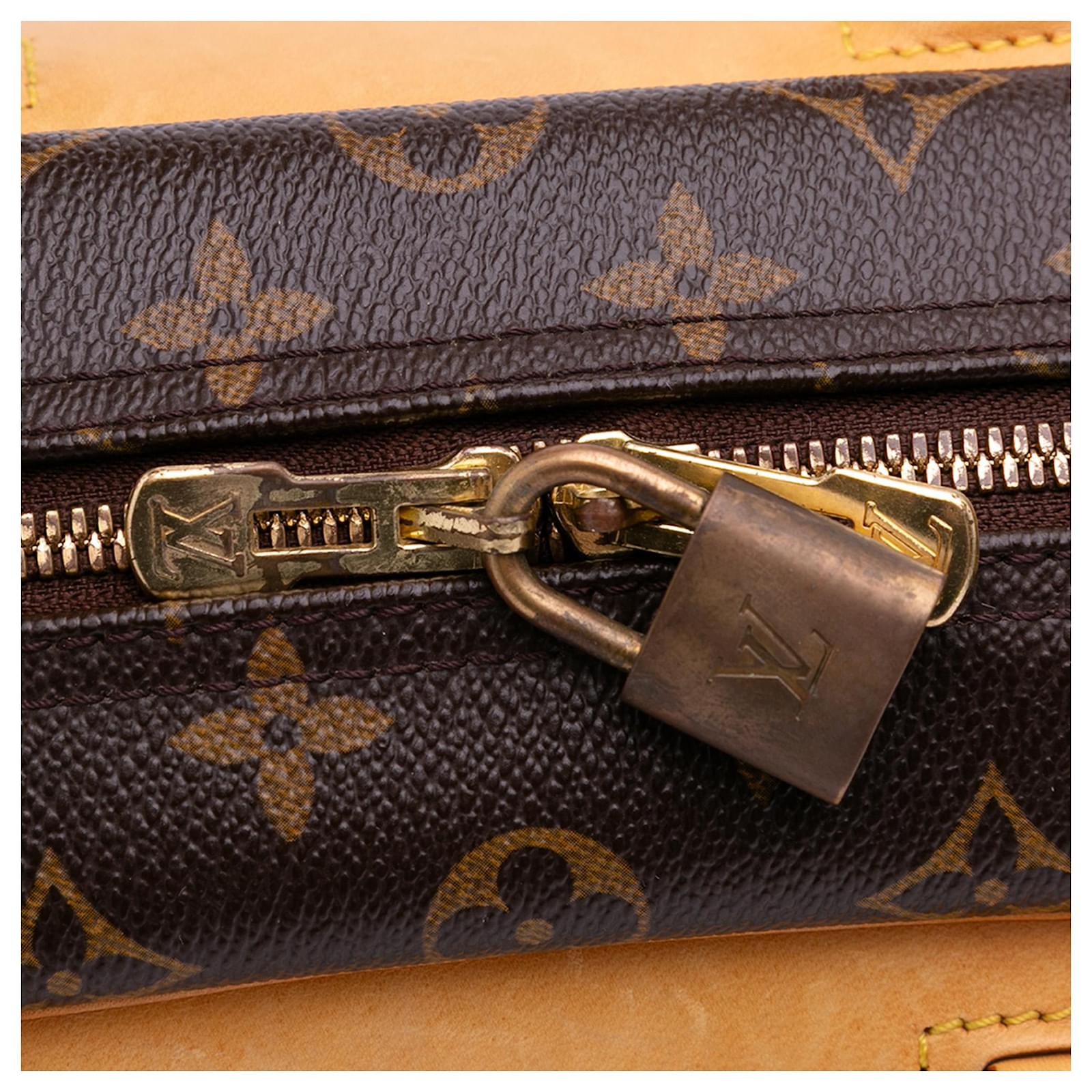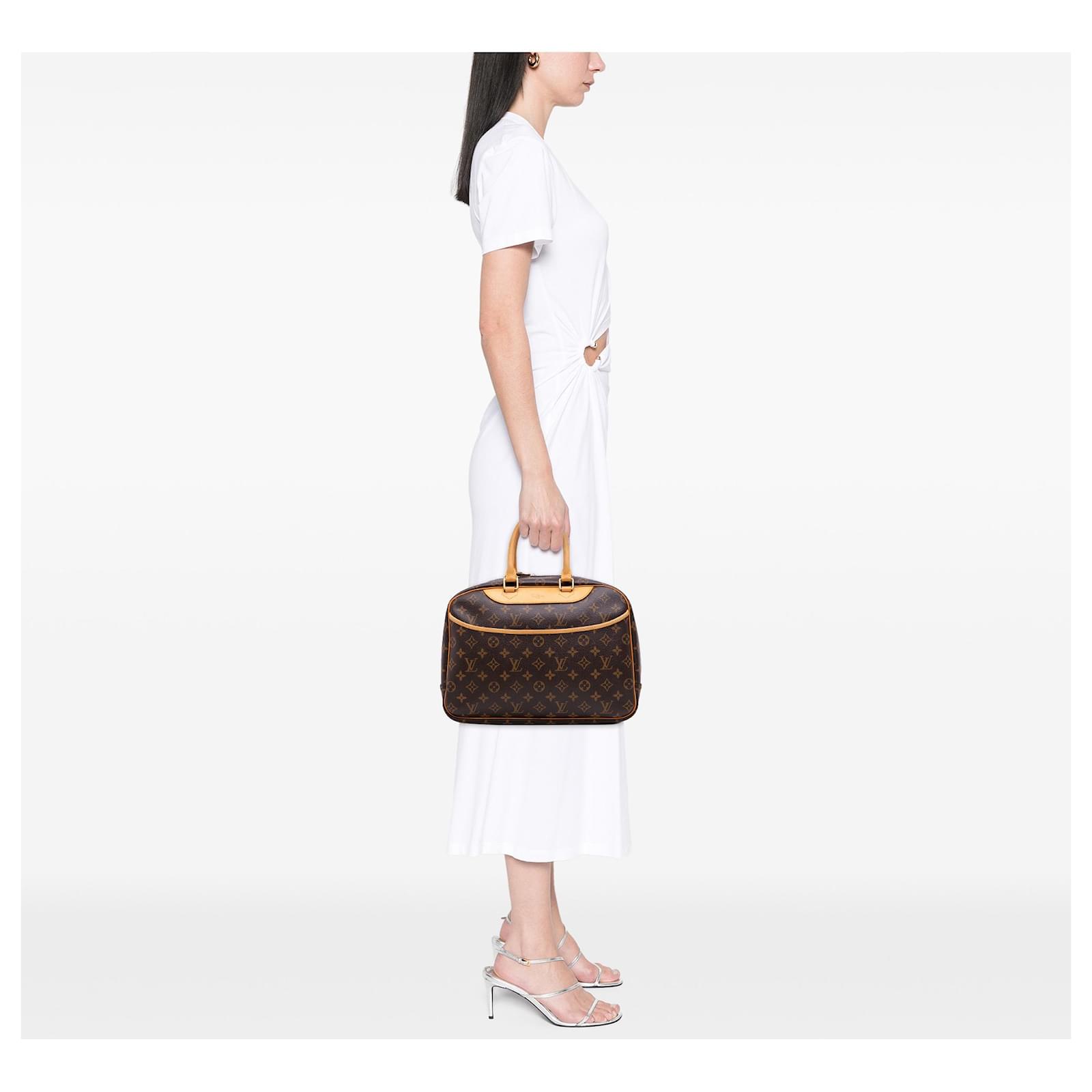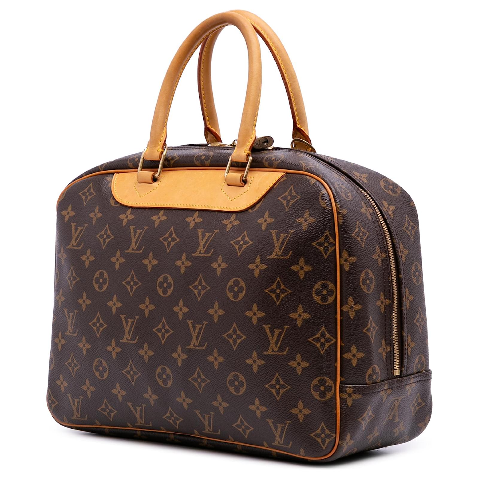 The Deauville features a monogram canvas body with vachetta leather trim, rolled vachetta leather handles, an exterior slip pocket, a top zip closure, and interior open pockets. It carries a B+ condition rating.\r\n\r\nExterior Back Scratched. Lock Rusty/Tarnished, Scratched. Exterior Corners Worn. Exterior Front Scratched, Worn. Exterior Front stained with Other. Exterior Handle Creased, Worn. Interior Lining stained with Other. Practical Attachment Scratched. Exterior Side stained with Other. Item has an odor of Other. Exterior Top Worn. Zipper Scratched. \r\n\r\nDimensions: \r\nLength: 27 cm\r\nWidth: 34 cm\r\nDepth: 13 cm\r\nHand Drop: 13\r\n\r\nInclusions: No longer comes with original accessories.\r\n\r\nColor: Brown\r\n\r\nMaterial: Canvas x Monogram Canvas x Leather x Vachetta leather\r\n\r\nCountry of Origin: France\r\n\r\nSerial: MB0056\r\n\r\nBoutique Reference: PJC320348F956 \r\n
