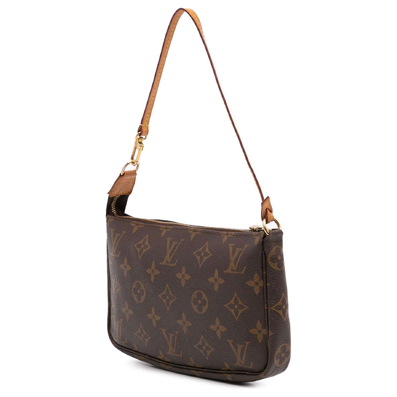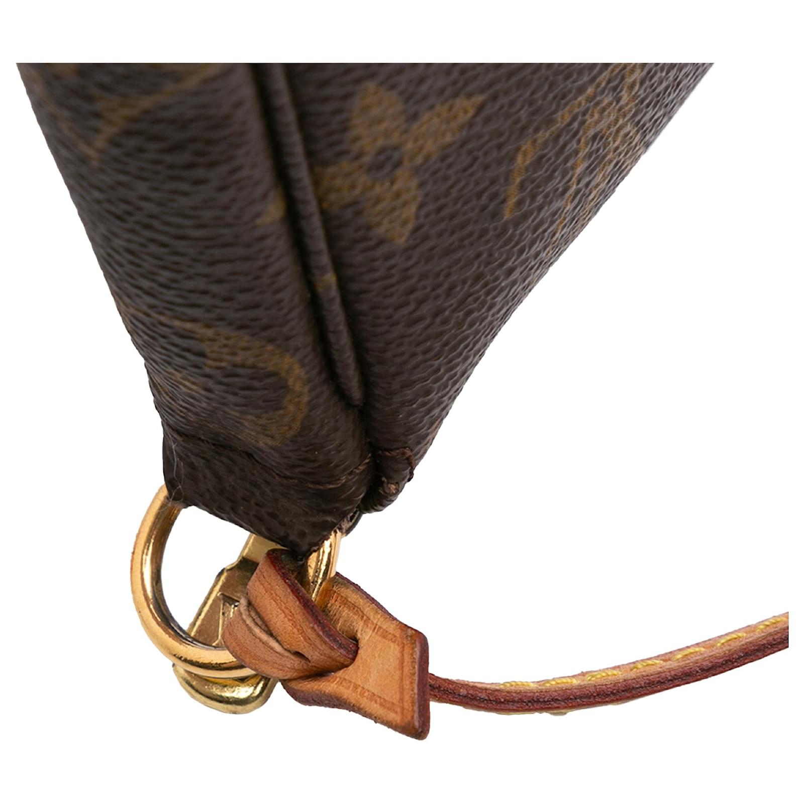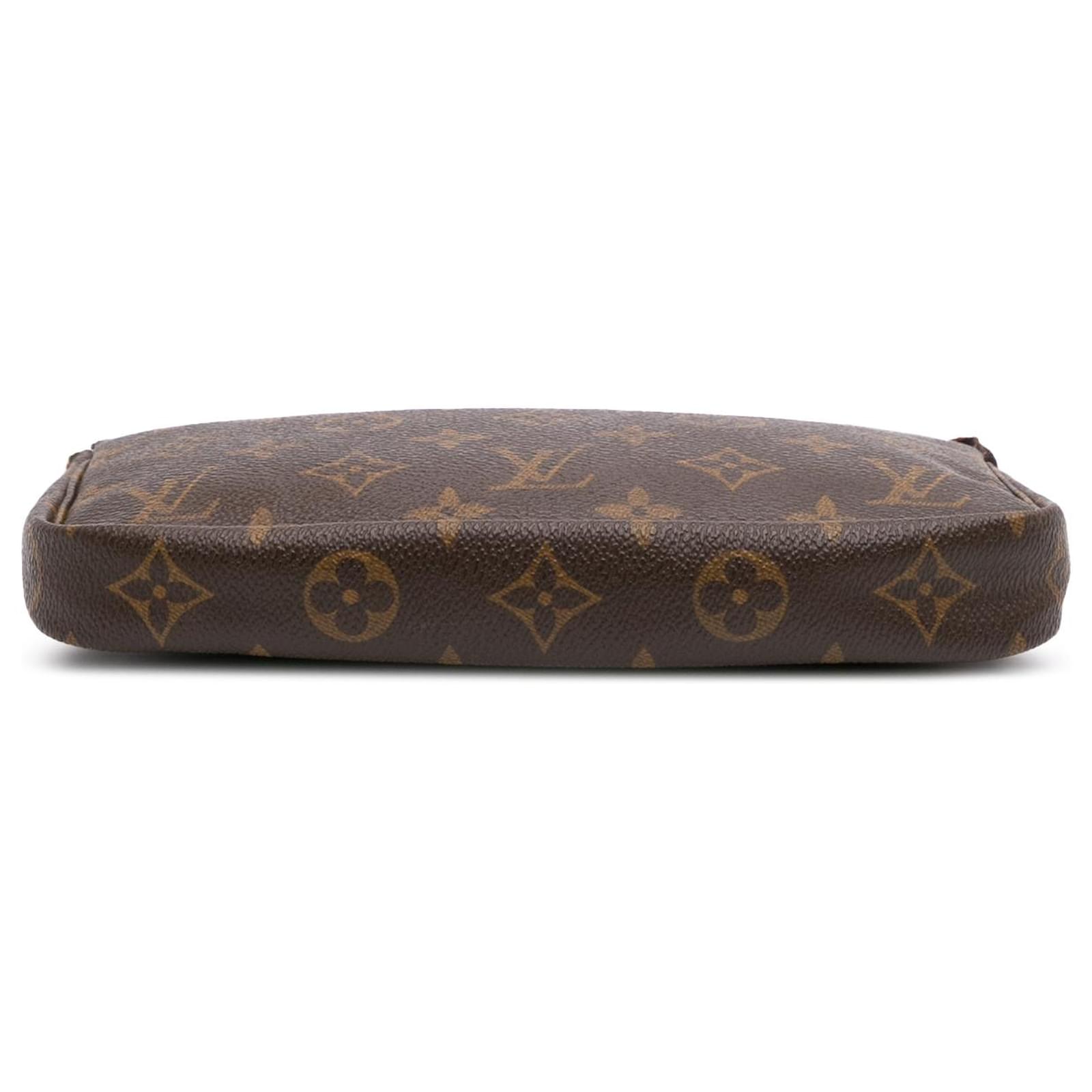 The Pochette Accessoires features a monogram canvas body, a flat vachetta leather handle, and a top zip closure. It carries a B+ condition rating.\r\n\r\nExterior Bottom Out Of Shape. Exterior Corners Worn. Exterior Handle Discolored, Worn. Practical Attachment Scratched. Zipper Scratched. \r\n\r\nDimensions: \r\nLength: 13 cm\r\nWidth: 20 cm\r\nDepth: 4 cm\r\nDrop: 18\r\n\r\nInclusions: No longer comes with original accessories.\r\n\r\nColor: Brown\r\n\r\nMaterial: Canvas x Monogram Canvas\r\n\r\nCountry of Origin: France\r\n\r\nSerial: VI0052\r\n\r\nBoutique Reference: PJC306509F956 \r\n