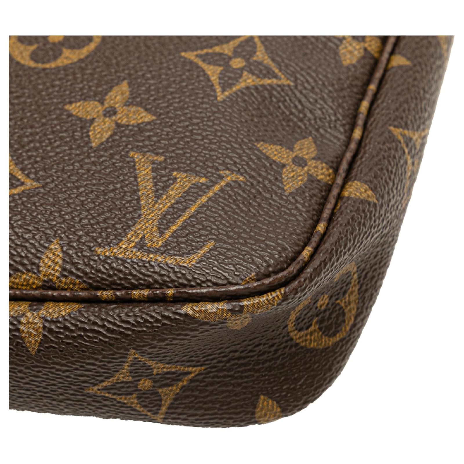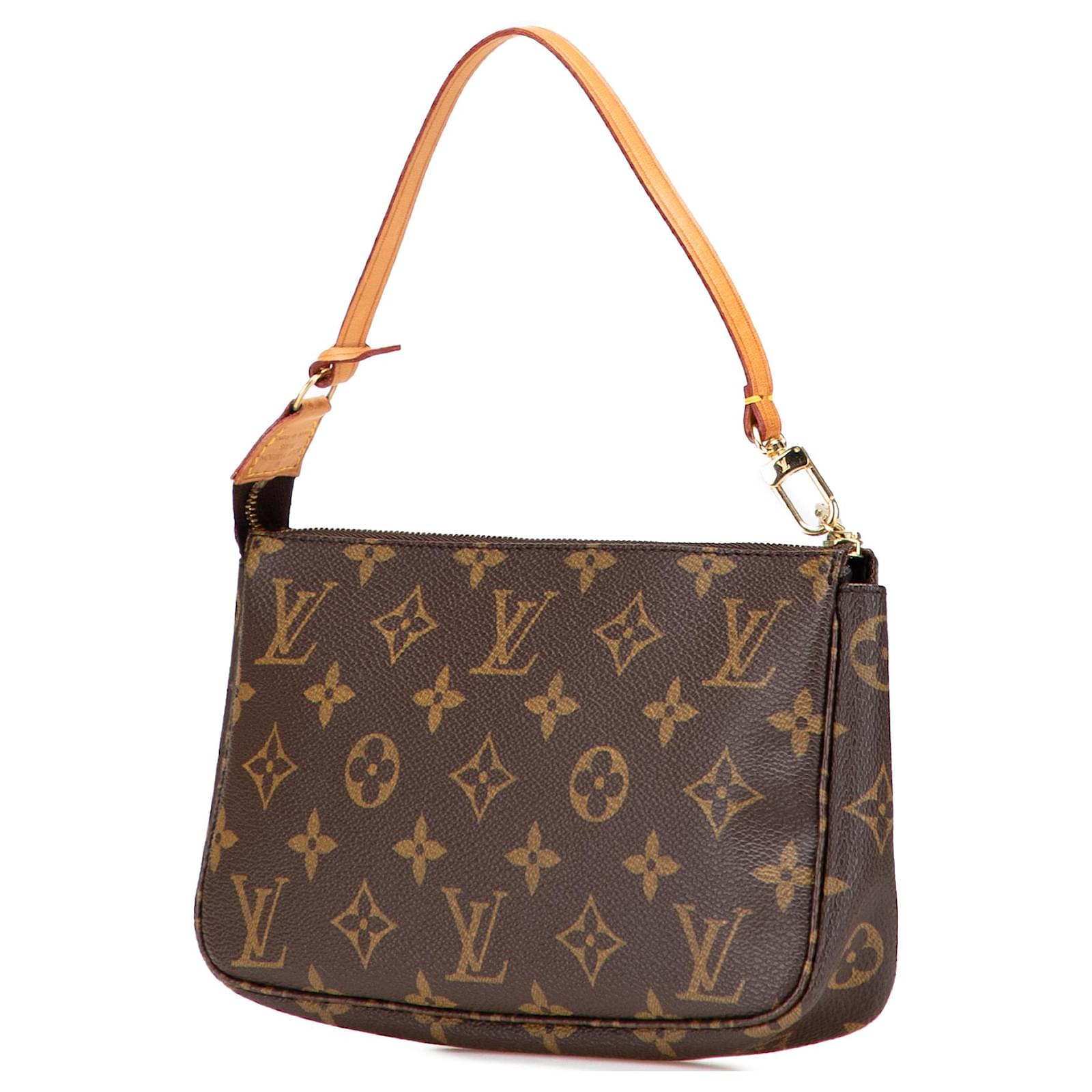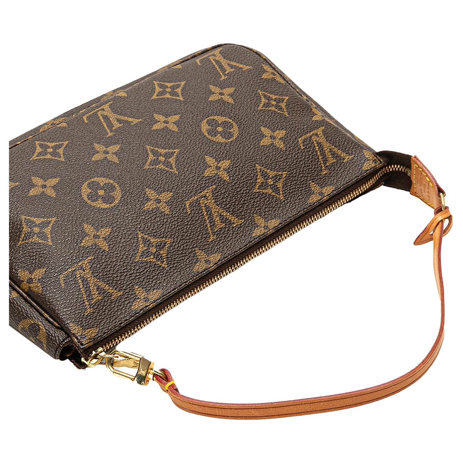 The Pochette Accessoires features a monogram canvas body, a flat vachetta leather strap, and a top zip closure. It carries an AB condition rating.\r\n\r\nExterior Handle Discolored, Worn. Exterior Handle stained with Water Mark. Exterior Top Discolored, Worn. Zipper Rusty/Tarnished, Scratched. \r\n\r\nDimensions: \r\nLength: 13 cm\r\nWidth: 21 cm\r\nDepth: 4 cm\r\nShoulder Drop: 15\r\n\r\nInclusions: No longer comes with original accessories.\r\n\r\nColor: Brown\r\n\r\nMaterial: Canvas x Monogram CanvasLeather x Vachetta leatherLeather x Vachetta leather\r\n\r\nCountry of Origin: France\r\n\r\nSerial: SL0968\r\n\r\nBoutique Reference: PJC323097F956 \r\n