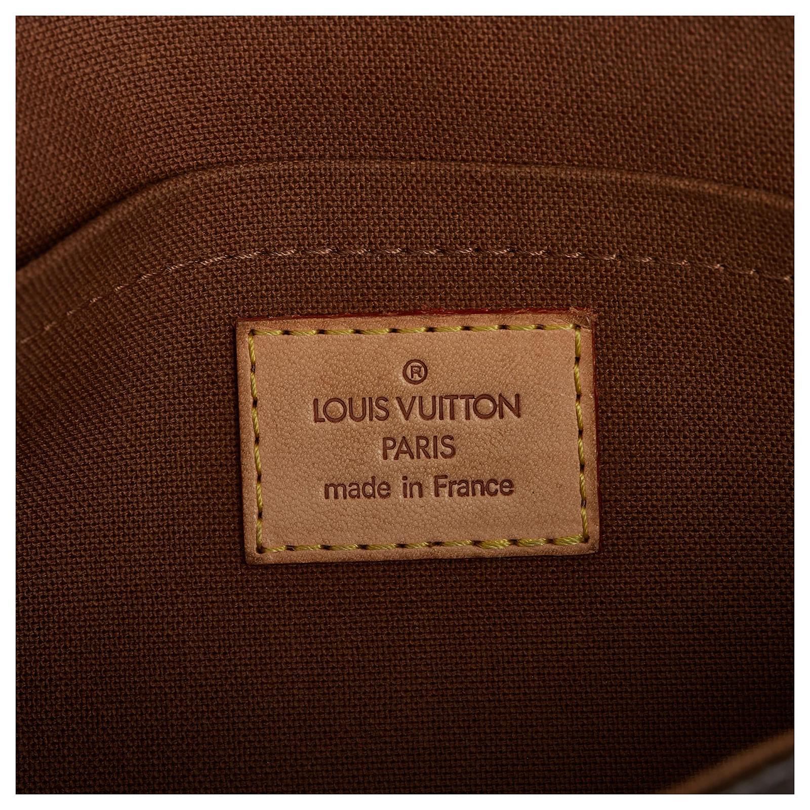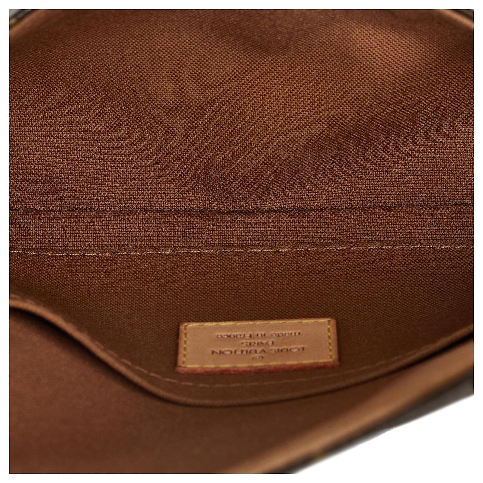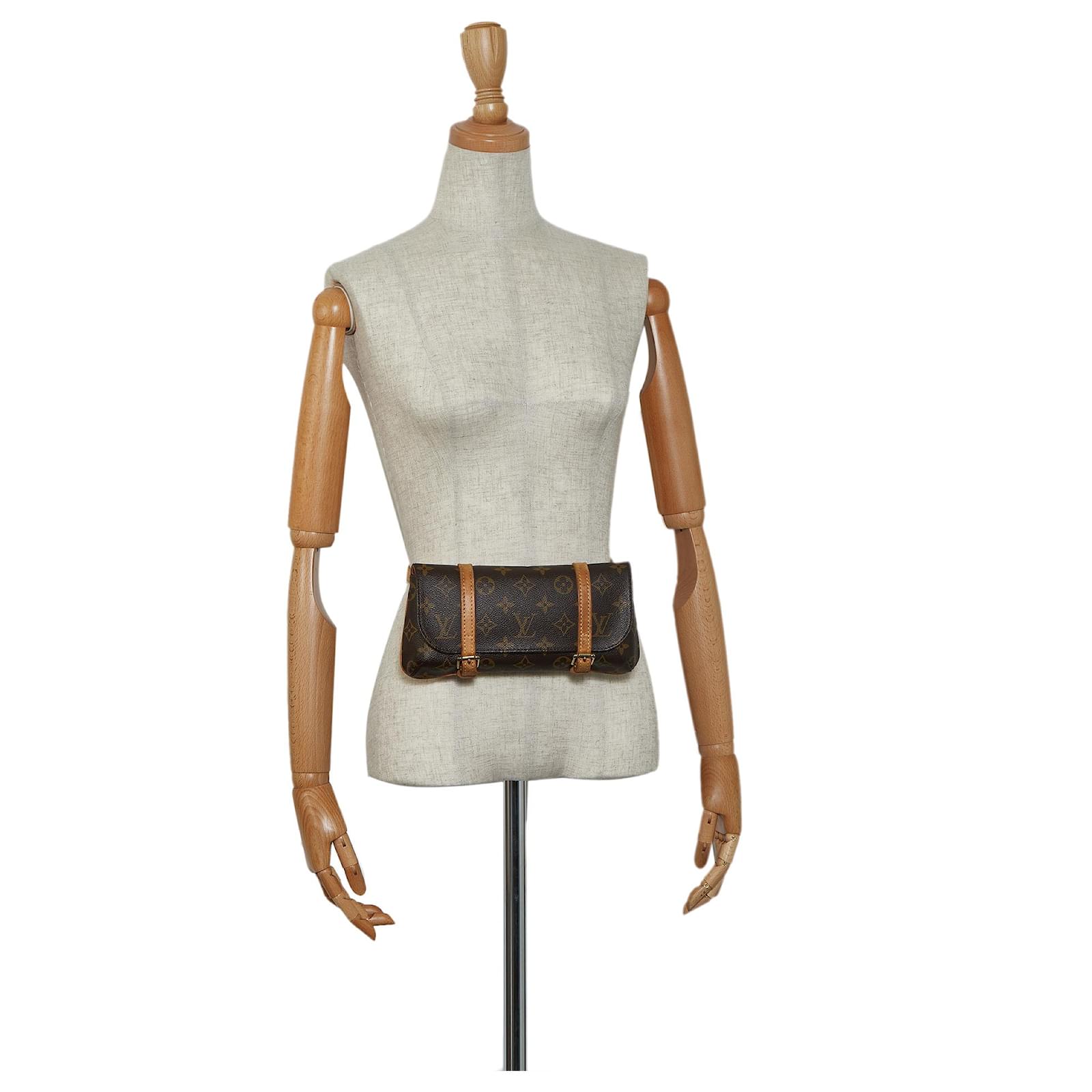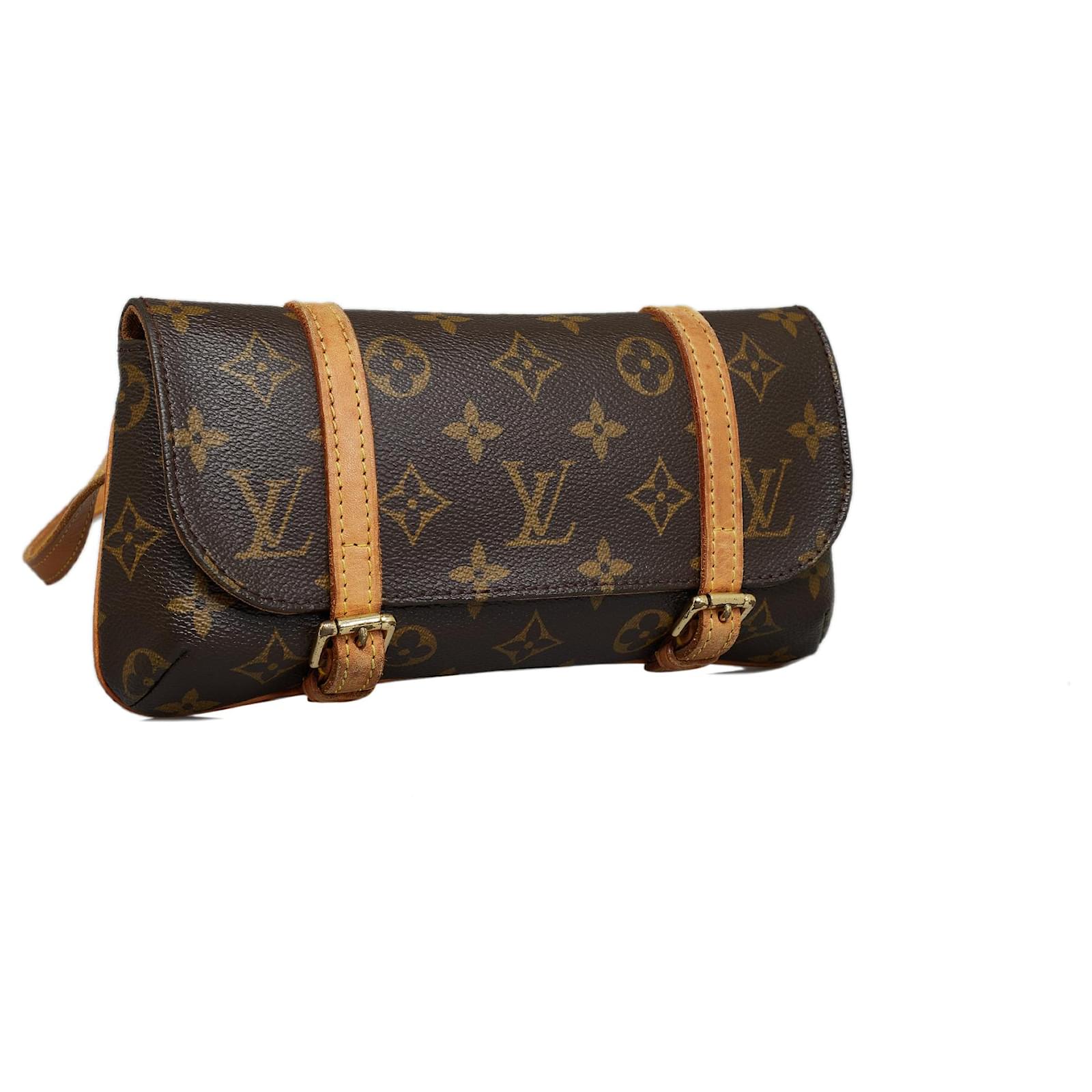 The Pochette Marelle features a monogram canvas body, adjustable vachetta leather waist strap, a front flap with belt closures, and an interior slip pocket. It carries a B+ condition rating.\r\n\r\nExterior Front Discolored, Out of shape, worn. Exterior Front stained with Other. Exterior Back Discolored, Out of shape, worn. Exterior Back stained with Other. Exterior Bottom Discolored, worn. Exterior Handle Discolored, worn. Exterior Handle stained with Water Mark. Exterior Corners Worn. Exterior Side Discolored, worn. Exterior Top Discolored, worn. Interior Lining Discolored. Interior Pocket stained with Other. Lock Rusty/tarnished, scratched. \r\n\r\nDimensions: \r\nLength: 12 cm\r\nWidth: 24 cm\r\nDepth: 137 cm\r\nShoulder Drop: 72\r\n\r\nInclusions: No longer comes with original accessories.\r\n\r\ncolor: brown\r\n\r\nMaterial: Canvas x Monogram Canvas x Leather x Vachetta leather\r\n\r\nCountry of origin: France\r\n\r\nSerial: MI0094\r\n\r\nBoutique Reference: PJC234648F956 \r\n