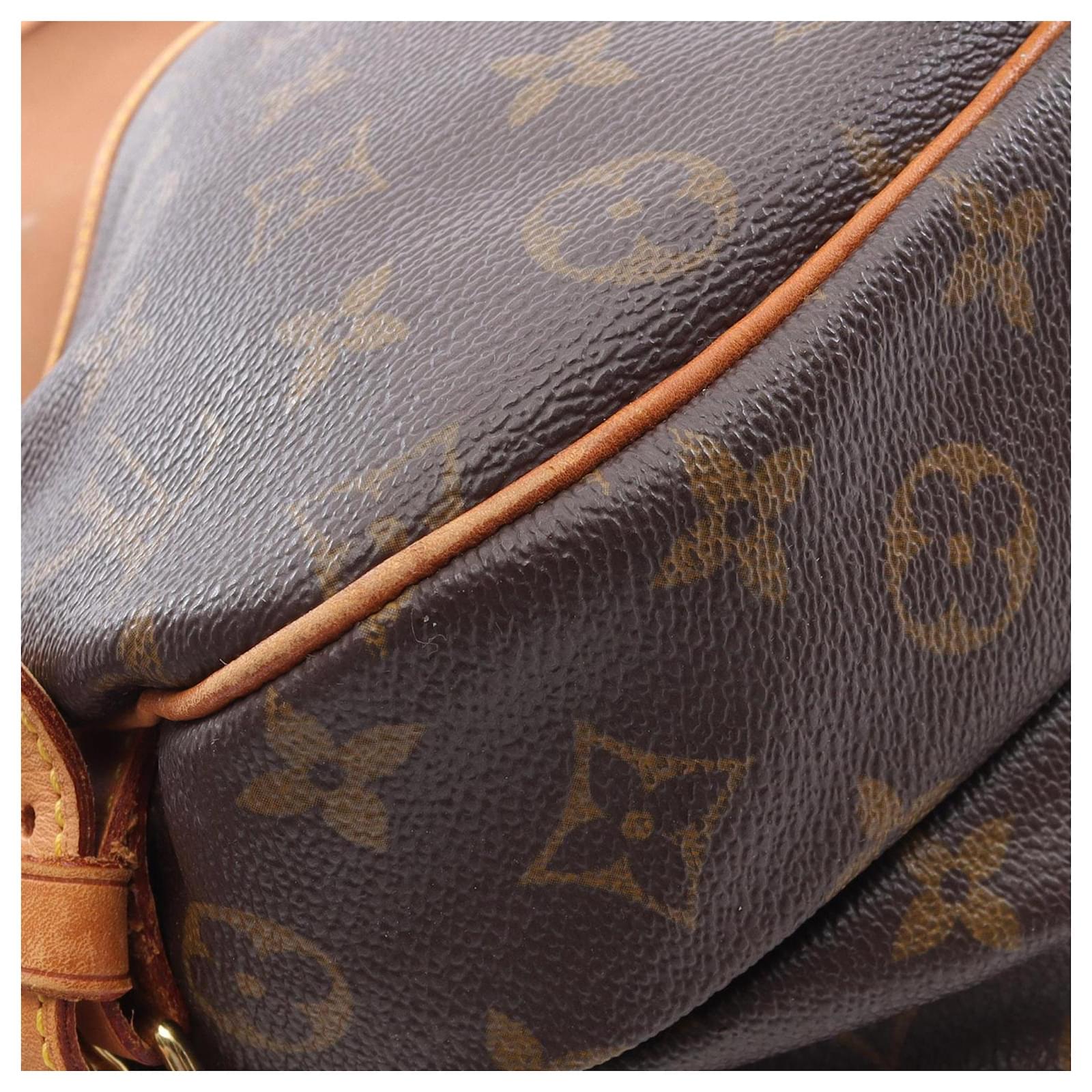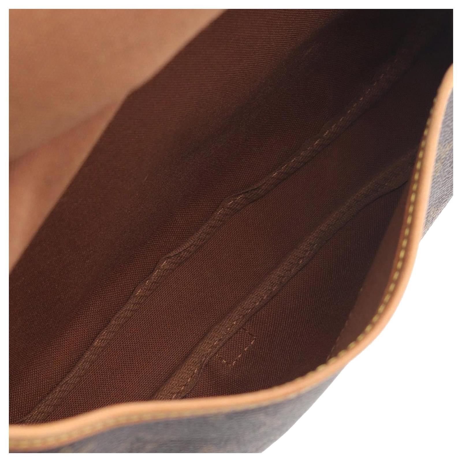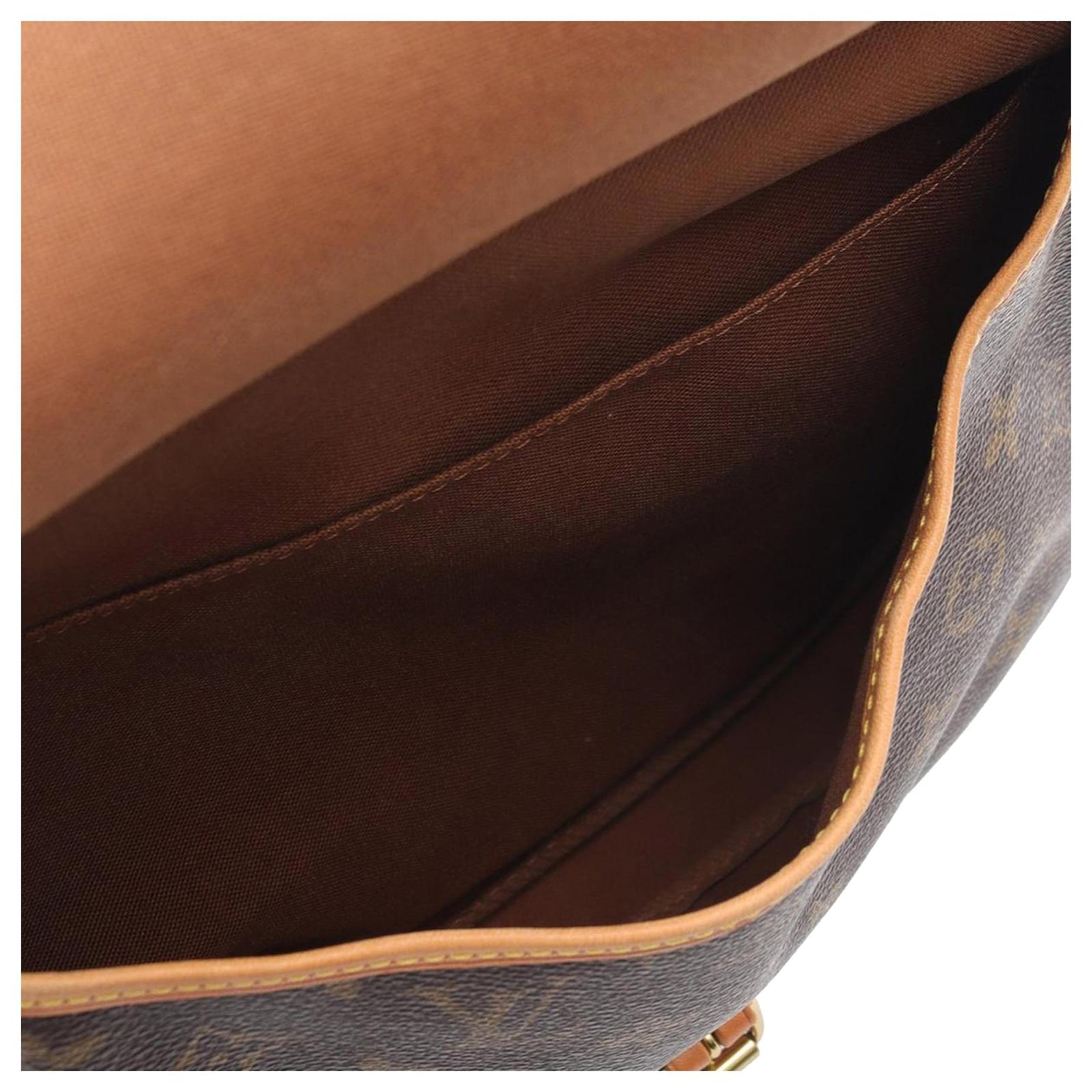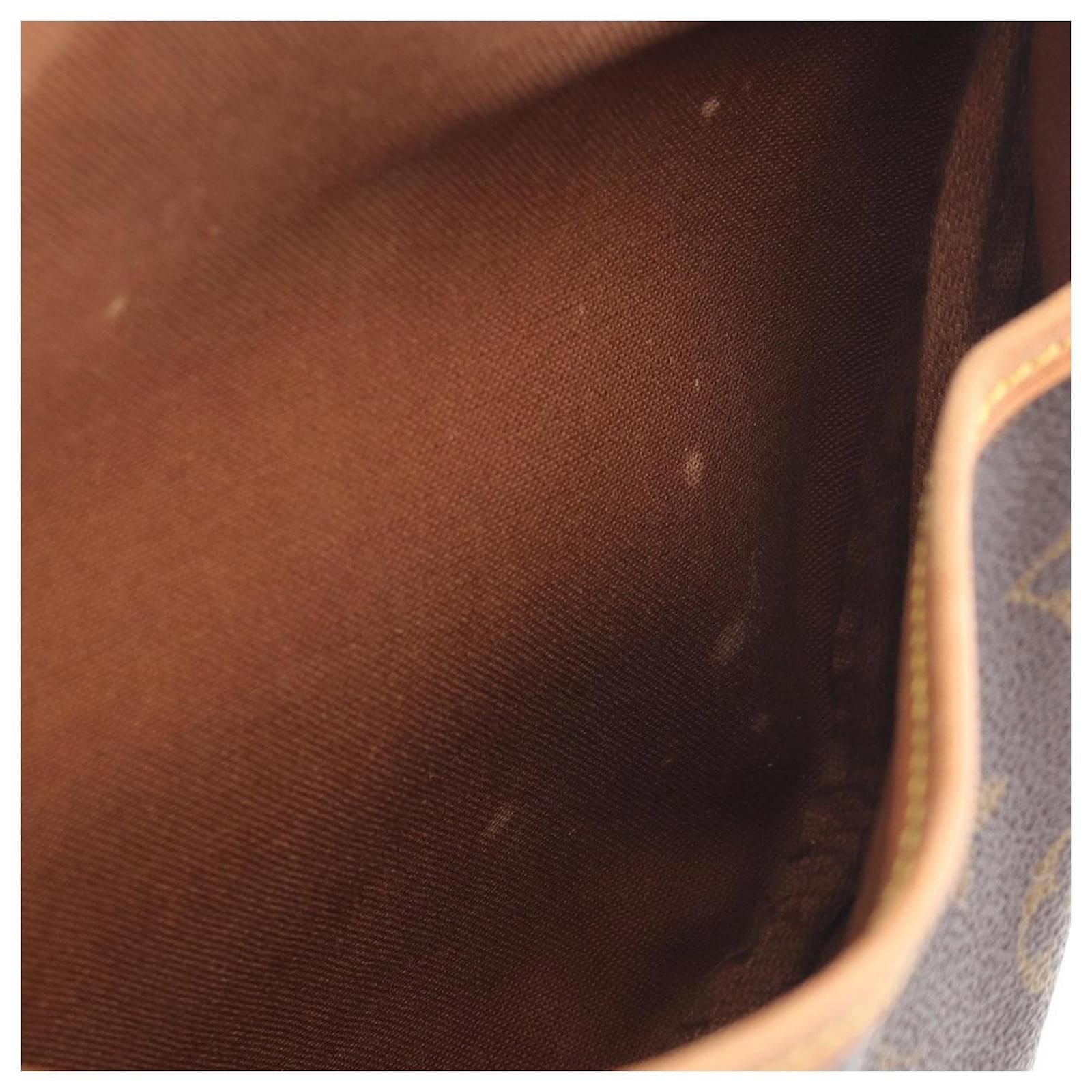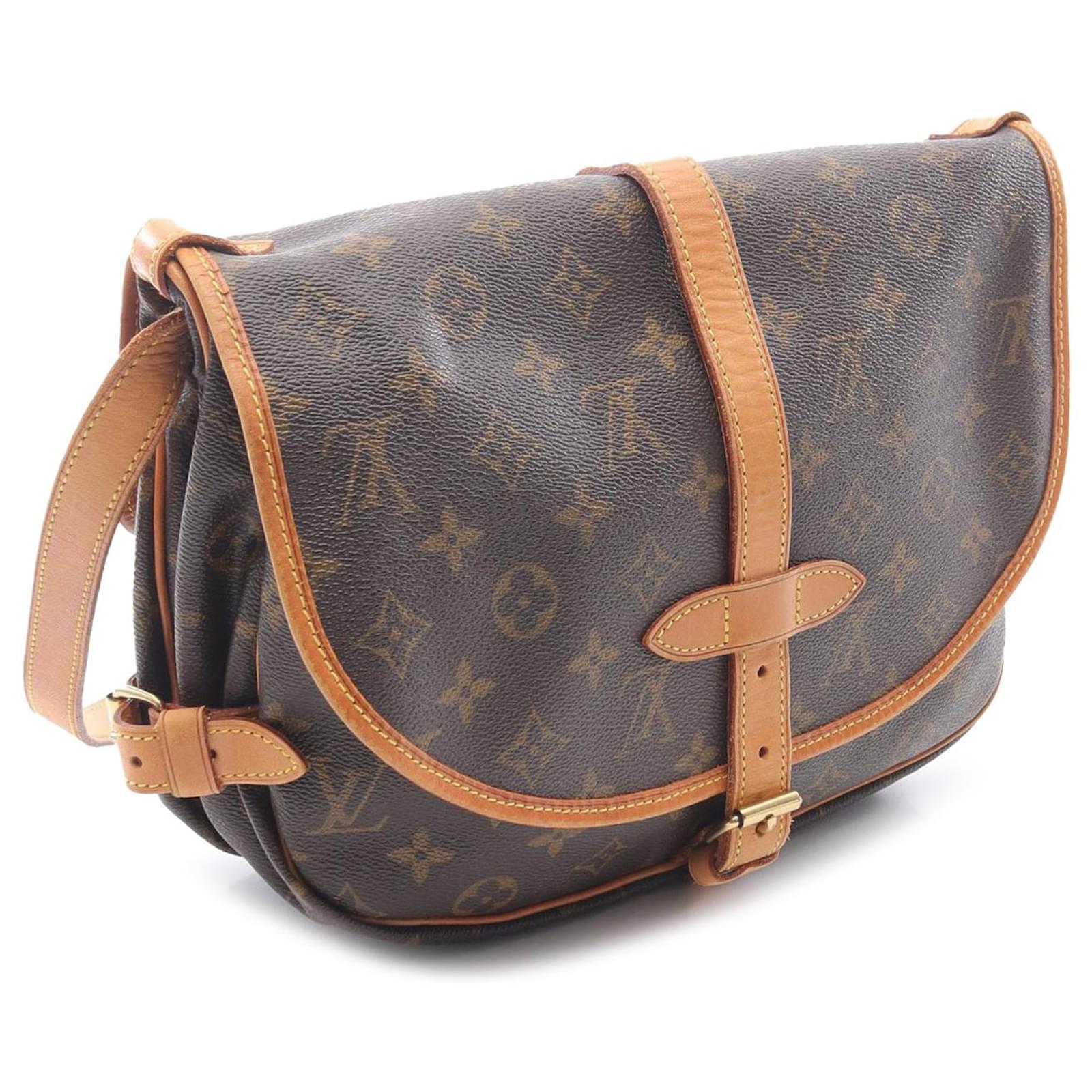 The Saumur 30 features a monogram canvas body with vachetta leather trim, an adjustable flat vachetta leather shoulder strap, double open compartments with front flaps and belt buckle closures, and an interior slip pocket. It carries a B+ condition rating.\r\n\r\nExterior Corners Worn. Exterior Front Discolored, Worn. Exterior Handle Cracked, Worn. Exterior Handle stained with Other, Water Mark. Interior Lining Worn. Interior Lining stained with Other. Practical Attachment Rusty/Tarnished. Exterior Side Worn. \r\n\r\nDimensions: \r\nLength: 20 cm\r\nWidth: 30 cm\r\nDepth: 11 cm\r\nShoulder Drop: 44\r\n\r\nInclusions: No longer comes with original accessories.\r\n\r\nColor: Brown\r\n\r\nMaterial: Canvas x Monogram Canvas\r\n\r\nCountry of Origin: France\r\n\r\nSerial: MB0011\r\n\r\nBoutique Reference: PJC326024F956 \r\n